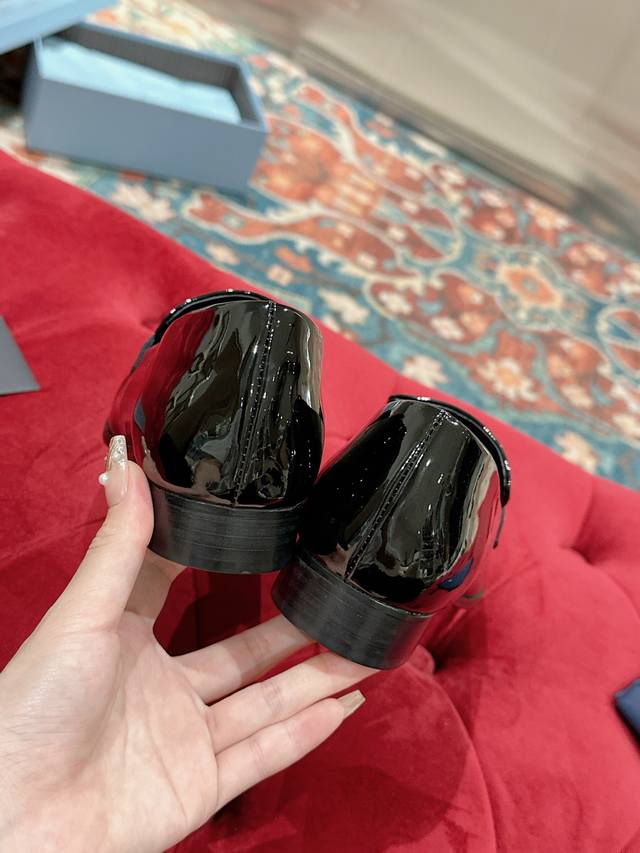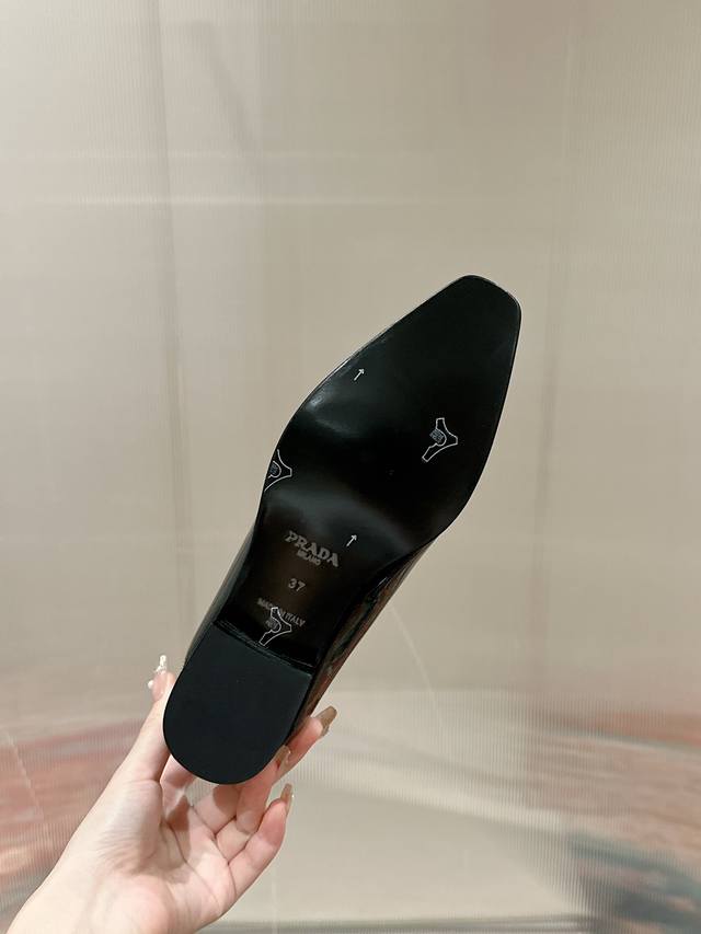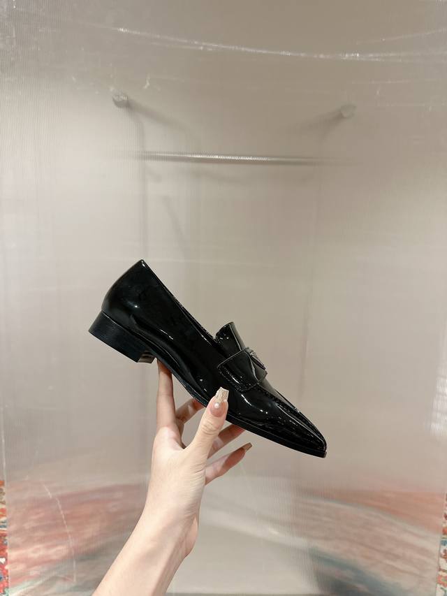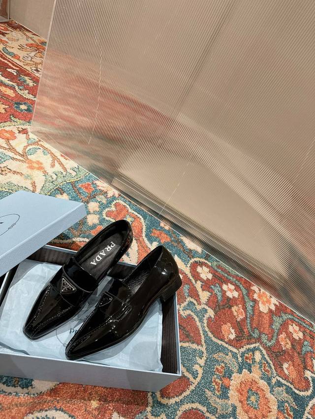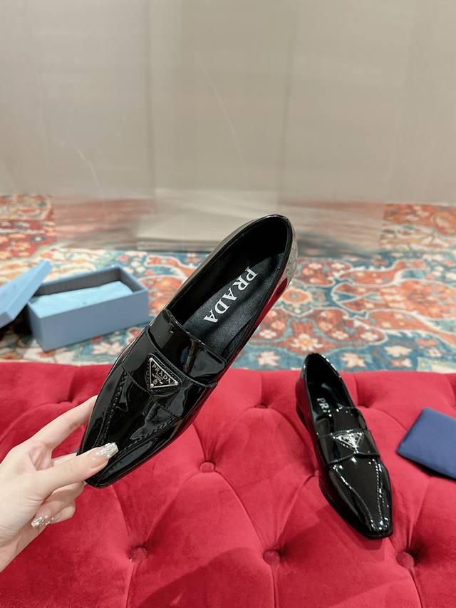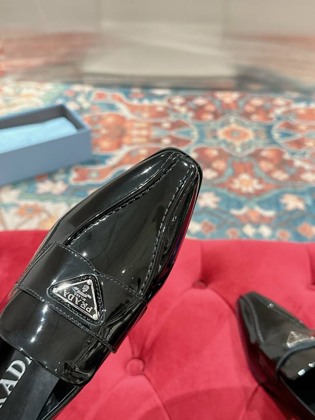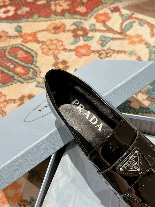 Prada Top-Tier Version. These Prada loafers are perfect for important occasions, exuding British style. The upper is made of glossy patent leather, and the gradually narrowing toe line perfectly matches Prada's signature high-end style
