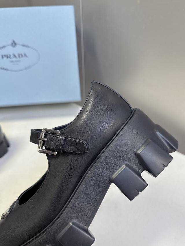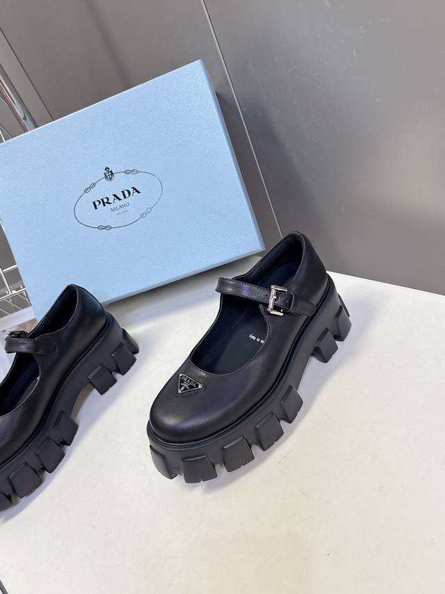Prada's latest triangular logo platform Mary Jane loafers. Recommended by numerous celebrities and influencers, these are sure to be a hot seller this year. The simple upper design is highly recognizable, with the triangular logo adding a touch of sophistication. They look great on the feet, making legs appear slimmer and more elegant. The 6cm outsole height instantly adds height, making them a true height-boosting wonder. The entire series uses a variety of imported materials: patent leather, calfskin lining, mixed sheepskin, and a lightweight and comfortable rubber outsole. Sizes: 35-41 (40, 41). Custom orders are non-refundable.