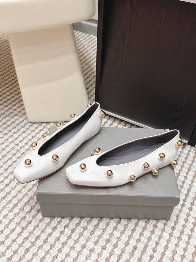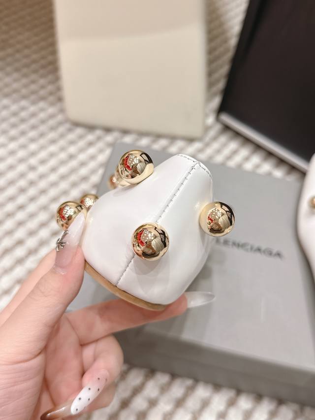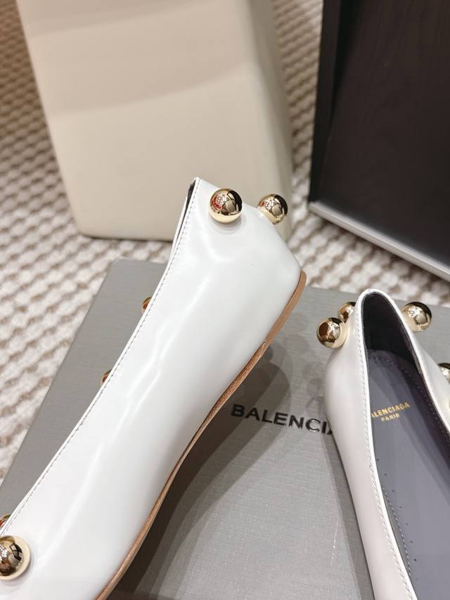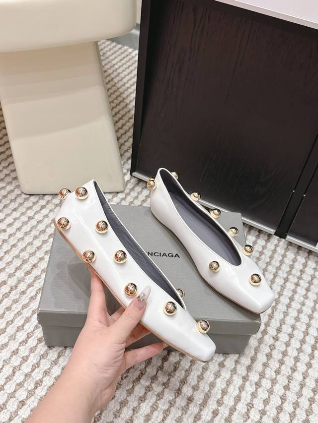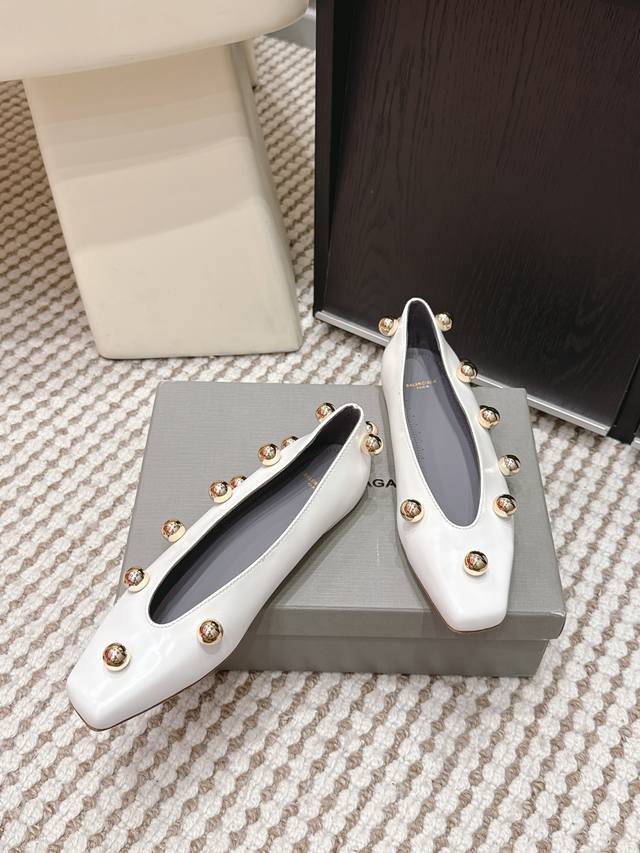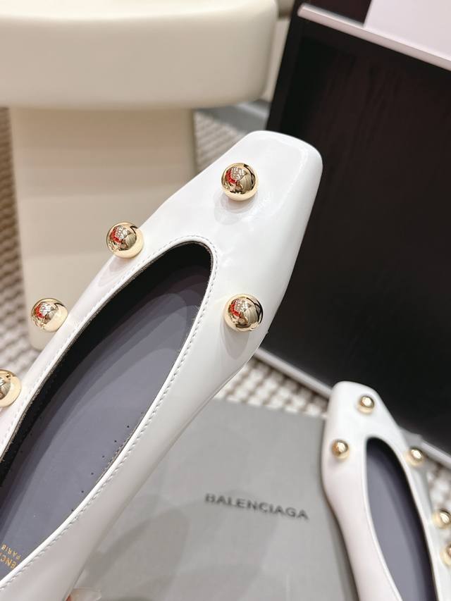 Retail Price Ddd Balenciaga Metallic Patent Leather Flat Shoes DDD Balenciaga 2026 Early Spring New Arrival, square toe design + metal ball decoration, fashionable and recognizable! Patent leather material with a perfect sheen, available in black, white, and nude DDD Flat design, suitable for everyday commuting and casual wear, looks great with skirts or jeans, easily creating a French elegance or individual style DDD Size: 35-39 34, 40, 41 Made to order, no returns or exchanges DDD