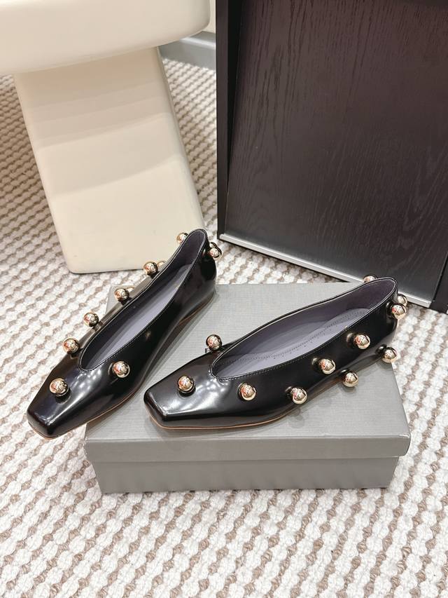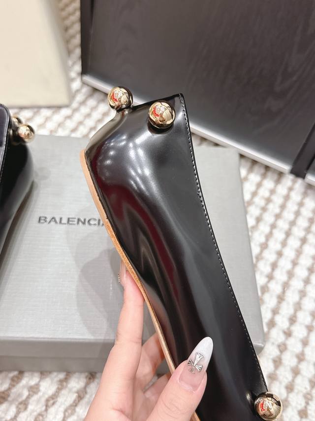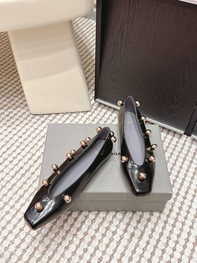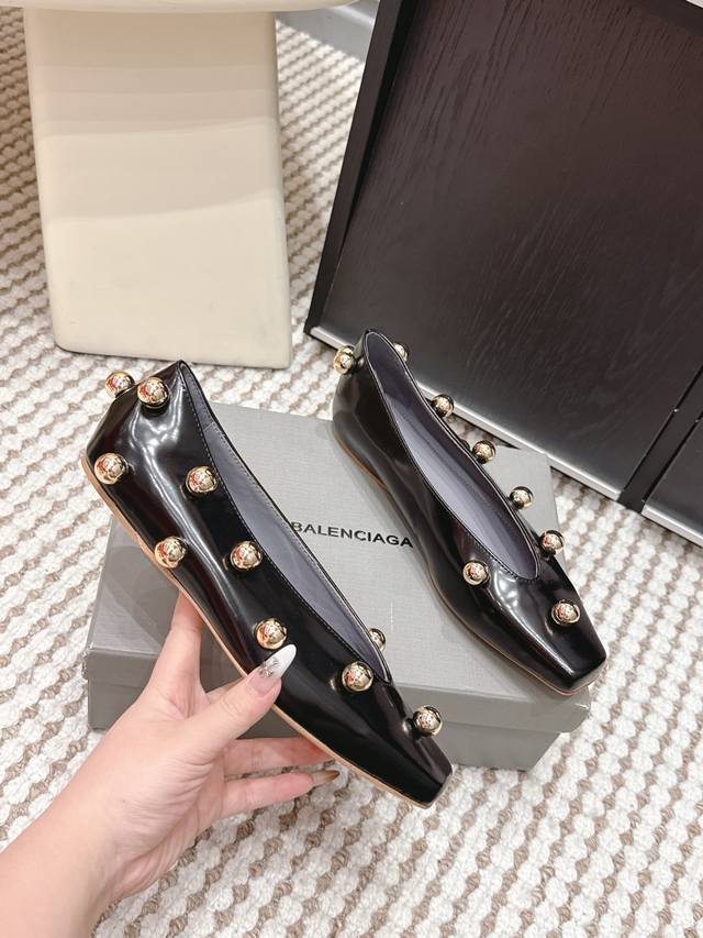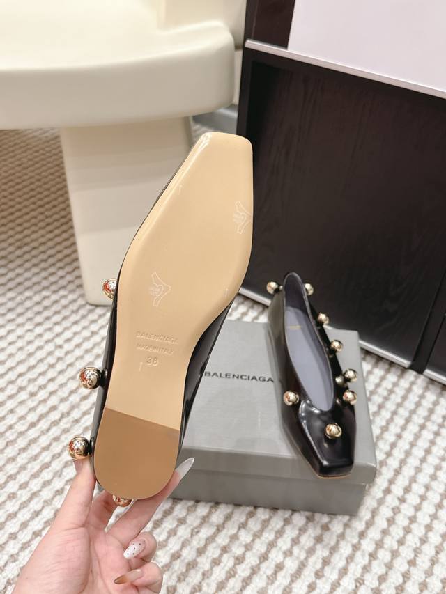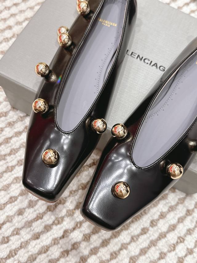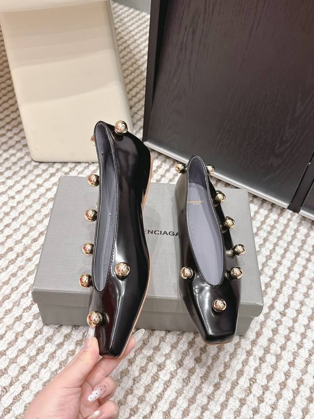 Retail Price Ddd Balenciaga Metallic Patent Leather Flat Shoes DDD Balenciaga 2026 Early Spring New Arrival, square toe design + metal ball decoration, fashionable and recognizable! Patent leather material with a perfect sheen, available in black, white and nude DDD Flat design, suitable for everyday commuting and casual wear, looks great with skirts or jeans, easily creating a French elegance or individual style DDD Size: 35-39 34, 40, 41 Made to order, no returns or exchanges DDD