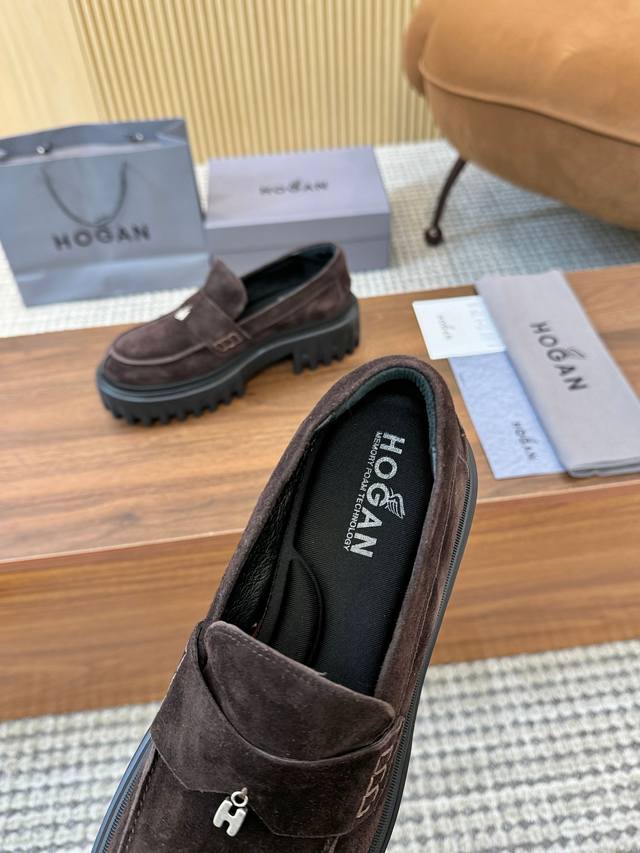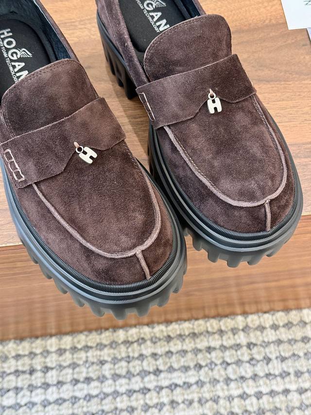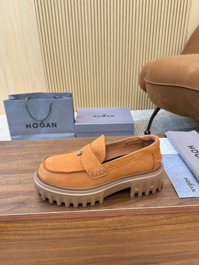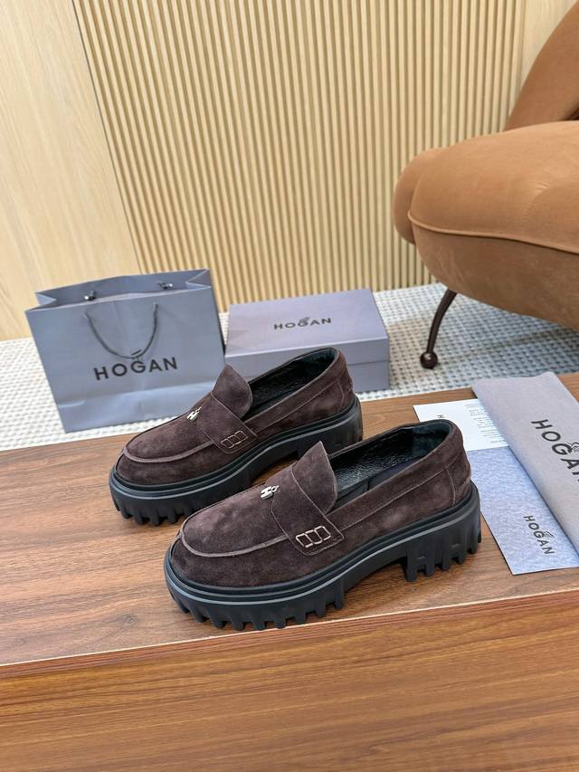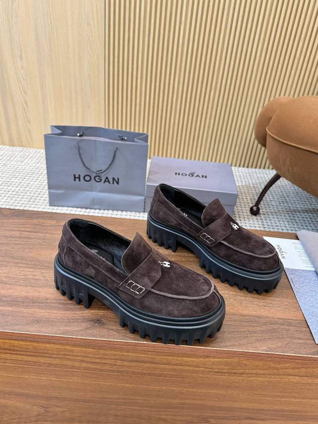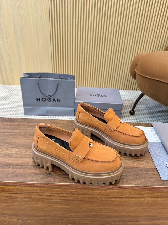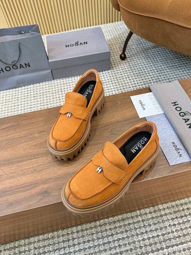 The Hogan H series features a distinctive platform design with a striking H logo embedded in the iconic H-Stripes sole. These preppy loafers are crafted from velvety suede, adorned with subtle horizontal stripes and an H-letter charm. Lightweight yet stylish, they offer urban chic. The memory foam insole provides lightweight comfort and effortlessly elegant style. Sizes 34-40. Image reposted for guaranteed high price. Factory price: 440]