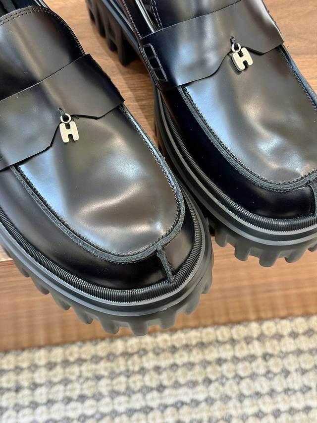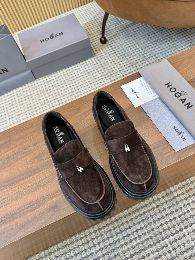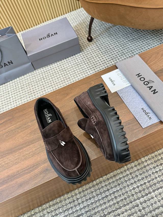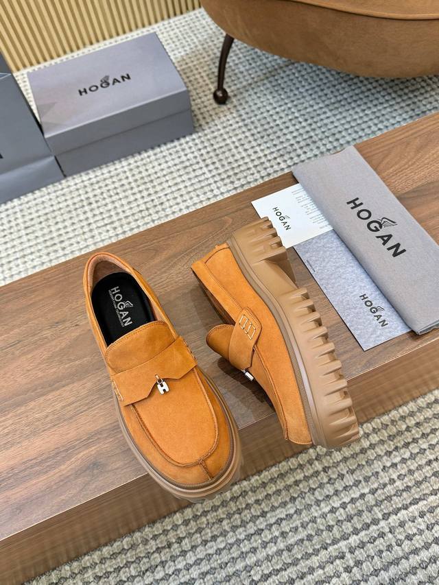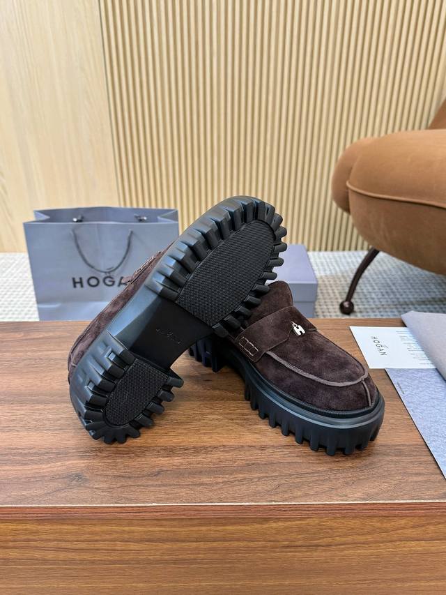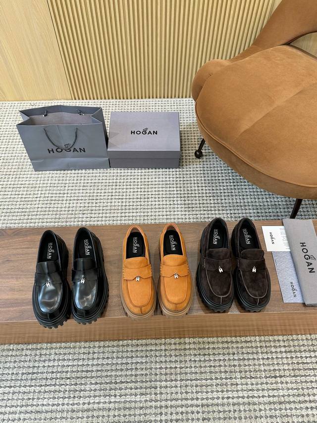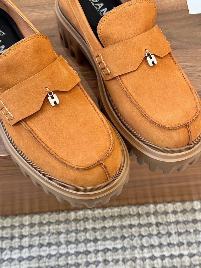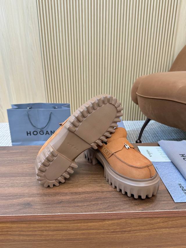 The Hogan H series features a distinctive platform design with a striking H logo embedded in the iconic H-Stripes sole. These preppy loafers are crafted from velvety suede, adorned with subtle horizontal stripes and an H-letter charm. Lightweight yet stylish, they offer urban chic. The memory foam insole provides lightweight comfort and effortlessly elegant style. Sizes 34-40. Image reposted for guaranteed high price. Factory price: 440]
