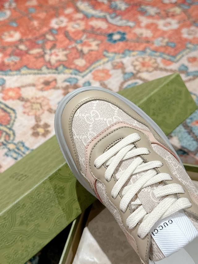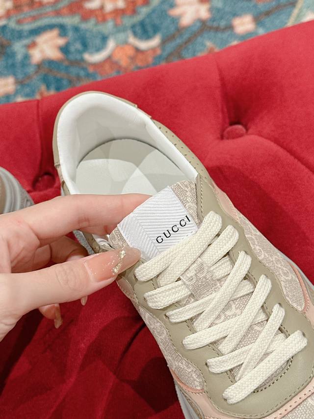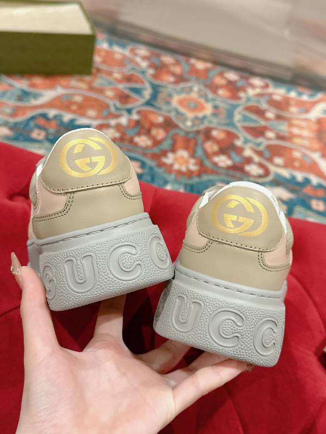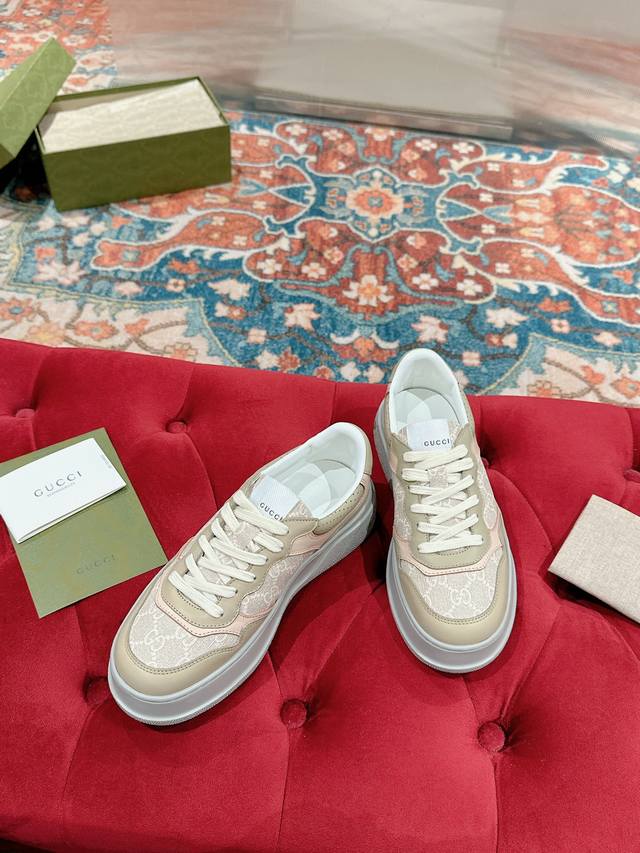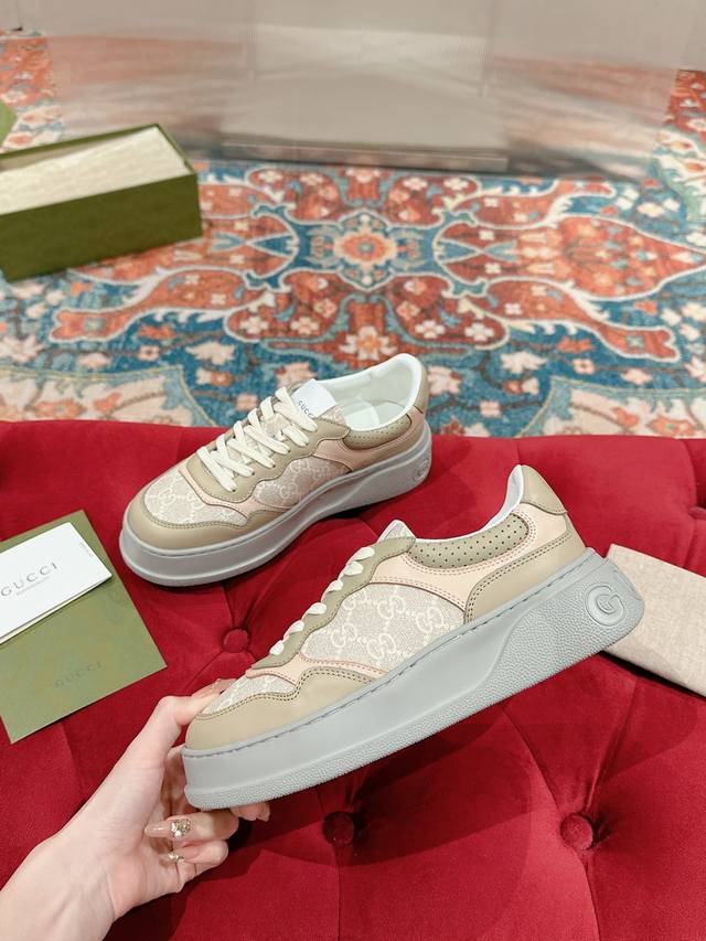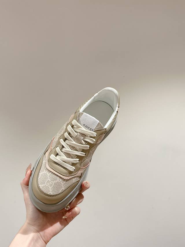 Women's Gucci Retro Couple Biscuit Shoes Gucci Chunky B Series Sneakers ~ Combining the three classic elements of chunky sneakers, white sneakers, and distressed sneakers, these shoes embody the brand's design philosophy of blending sport and leisure. The thick sole gives the sneakers a retro feel, and most importantly, they are very lightweight. The classic monogram pattern, round toe, and chocolate color scheme create a retro look. They offer a significant height boost, and the soft sole makes them very comfortable to wear year-round, especially perfect for autumn and winter. Material: Original custom cowhide leather, classic monogram fabric, perforated, embossed finish. Outsole: Rubber outsole. Lining: Imported lambskin. Heel height: Approx. 5cm. Size: Women's 35-40, Women's 40. Custom orders are non-refundable.
