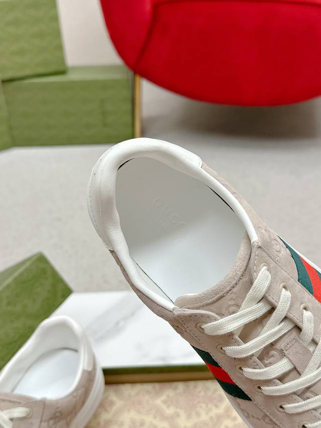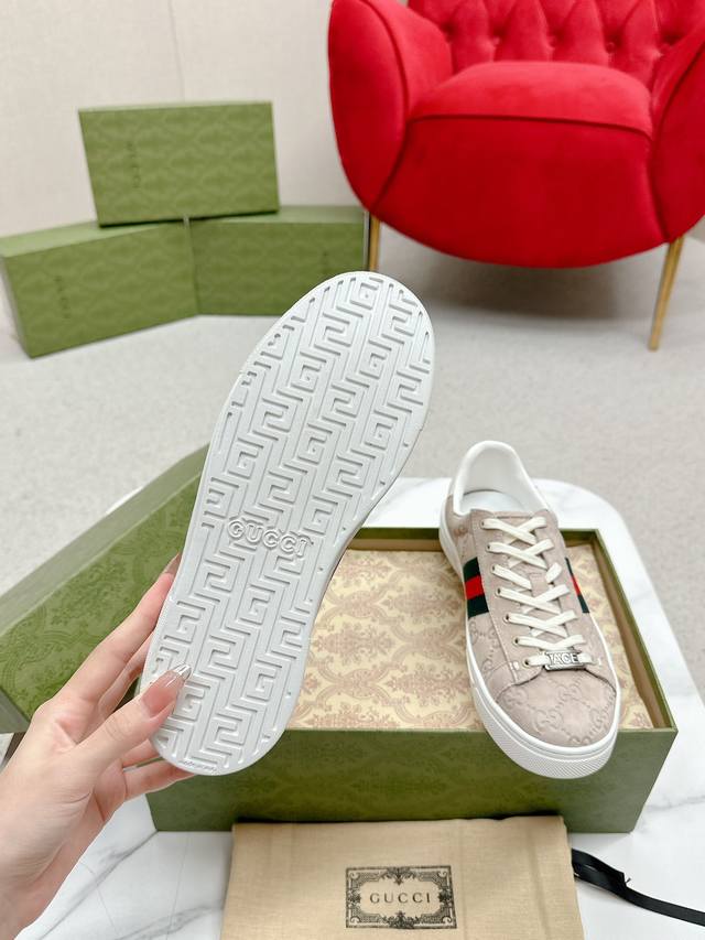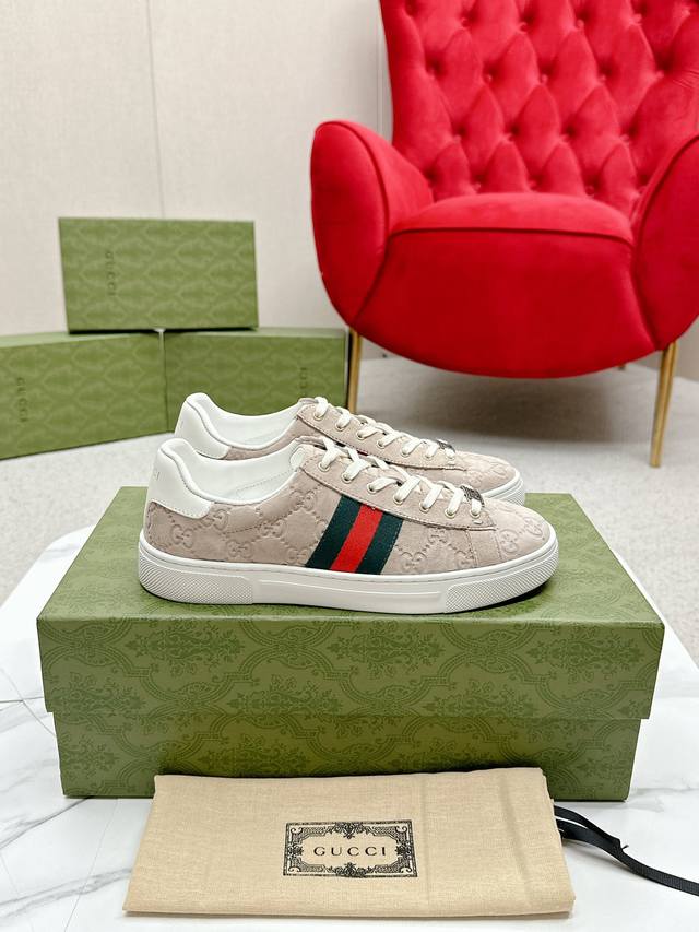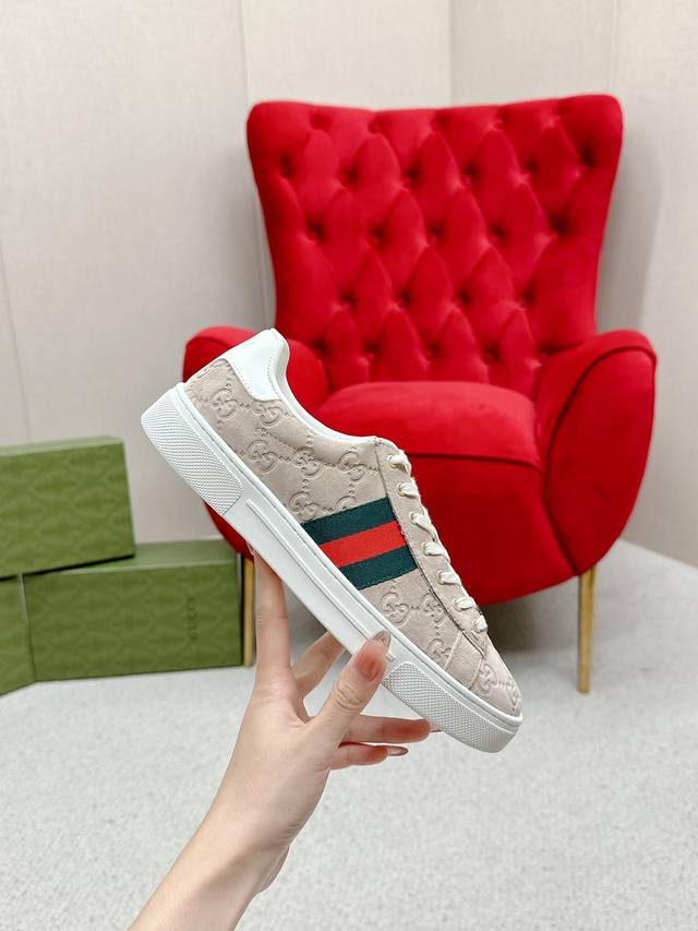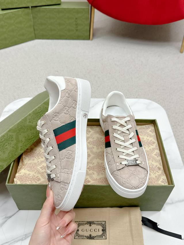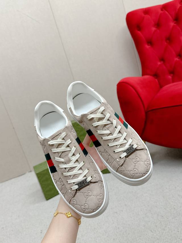 Women's p Men's p Ddd Gucc* Latest Ace Series Webbing Sneakers Ddd Since its inception, the Ace series sneakers have continued the brand's narrative, with meticulous craftsmanship creating its signature pieces. The new series features a distinctive low-top design, paired with chic details, reinterpreting the athletic shoe silhouette. The laces are adorned with an "Ace" metal tag, and the thickened construction exquisitely shapes the shoe. Gucc*'s classic red and green striped webbing adds even more charm to the design. DDD White leather Ddd Green leather details "Ace" metal tag Ddd Rubber sole Ddd Extra pair of laces Ddd Lacing Ddd Low heel Ddd 3cm heel Ddd This product adheres to the quality standards of the Gucc* Ace series, using a new soft leather construction, which may wrinkle. DDD Sizes: Women's 35-40 Men's 39-44 Women's 41 Men's 45 Custom orders are possible, but returns and exchanges are not accepted DDD