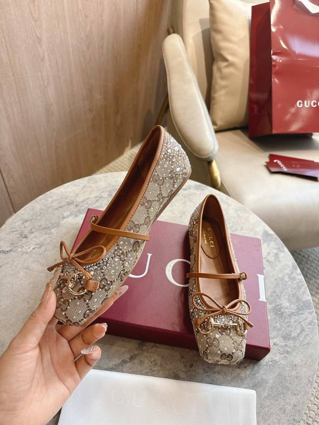 9099- 1 Apricot G Diamond DDD This iconic horsebit ballet flat pays homage to the original ballet shoe silhouette defined by square pleated hats and delicate bow details. This style is achieved in Gg canvas and a light gold-toned horsebit buckle adorned with colored rhinestones. The Sacchetto construction ensures a high level of comfort, also thanks to the soft, padded insole. DDD Sizes: Women's 35-42, Women's 41-42 Custom Made DDD Packaging: Full Set DDD