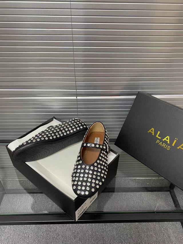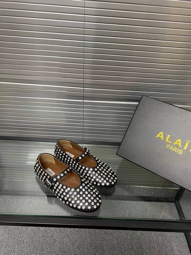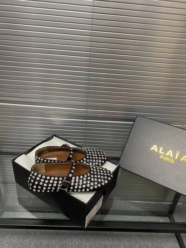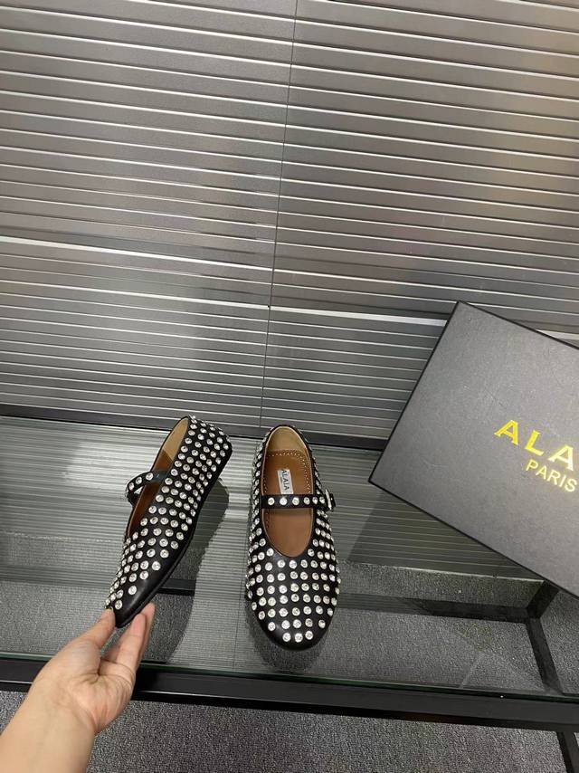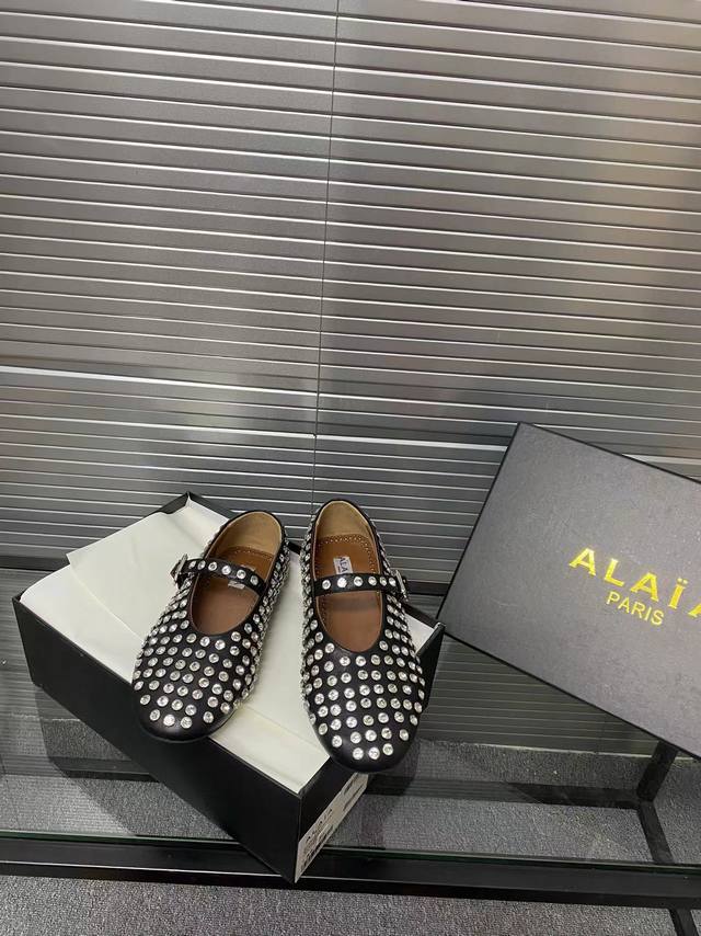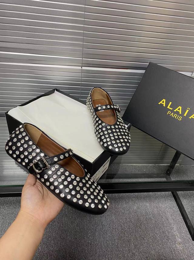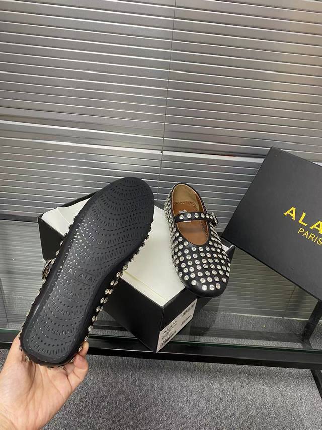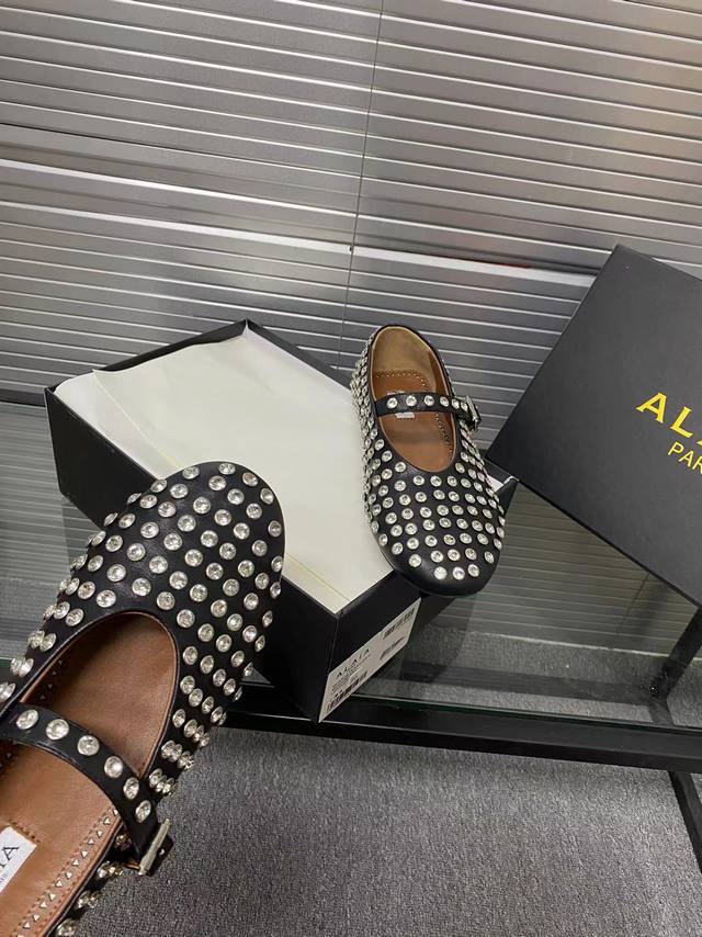 Alaia runway style flat ballet flats! A super popular ballet flat with a sweet and cool ballet style, romantic, charming, comfortable, and versatile. Made with original custom-made cowhide with Swarovski crystal upper, sheepskin lining, and custom-molded rubber non-slip outsole. Sizes: 35-41. Sizes 40 and 41 are custom-made and non-refundable.