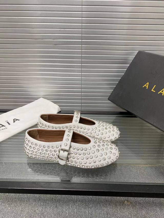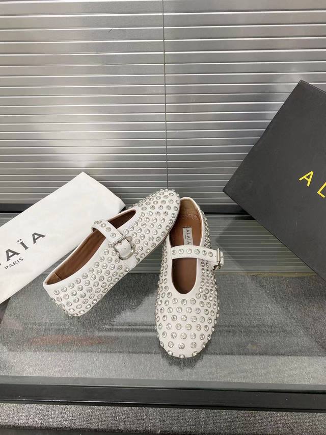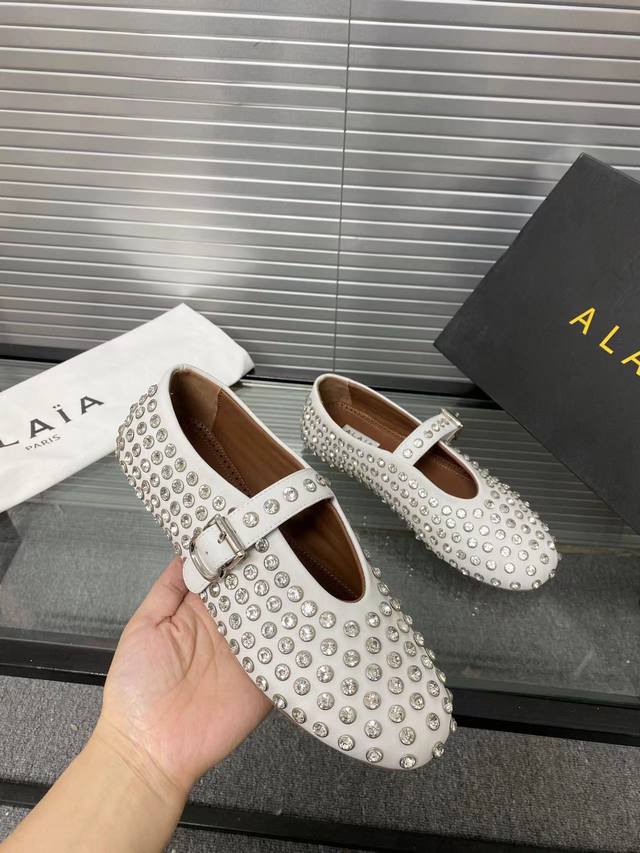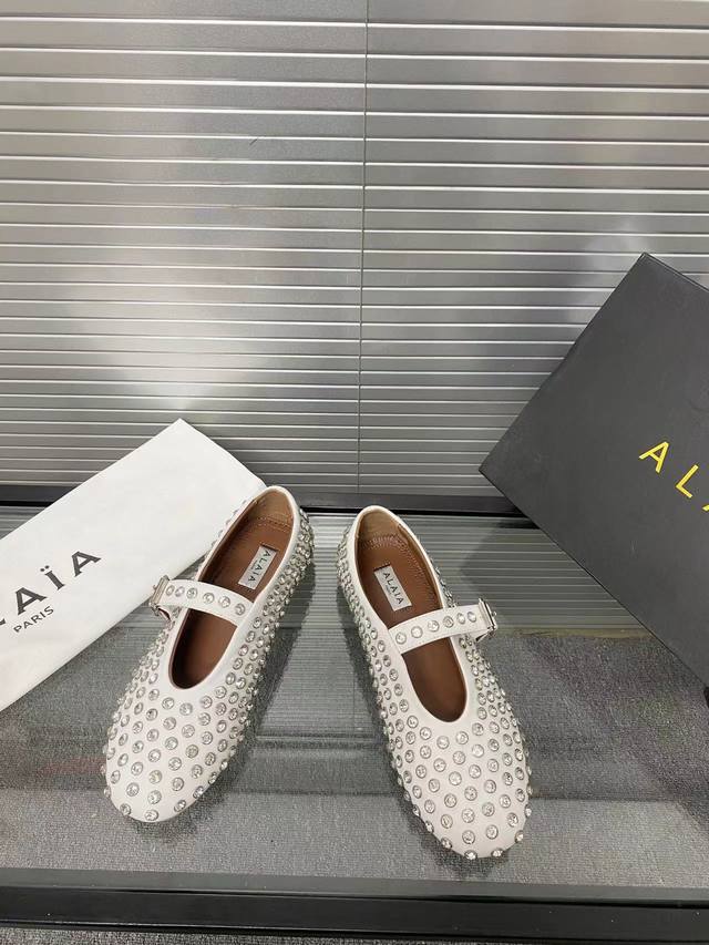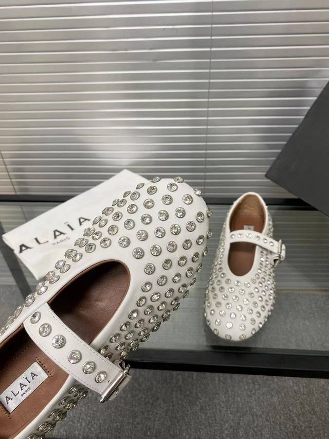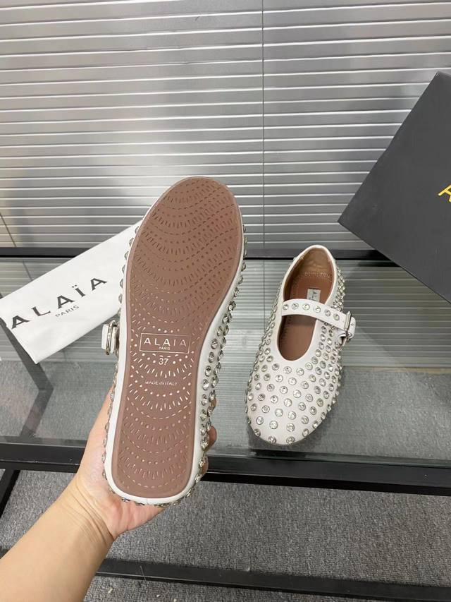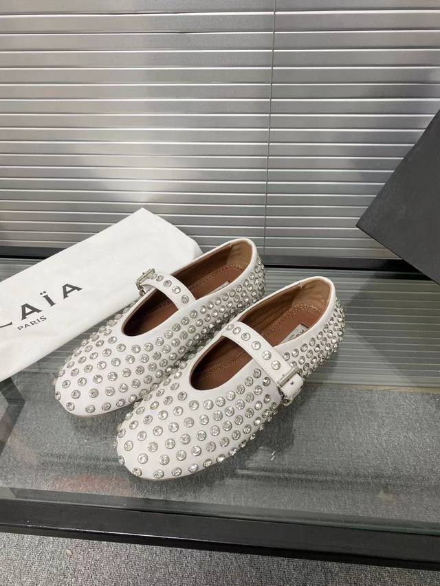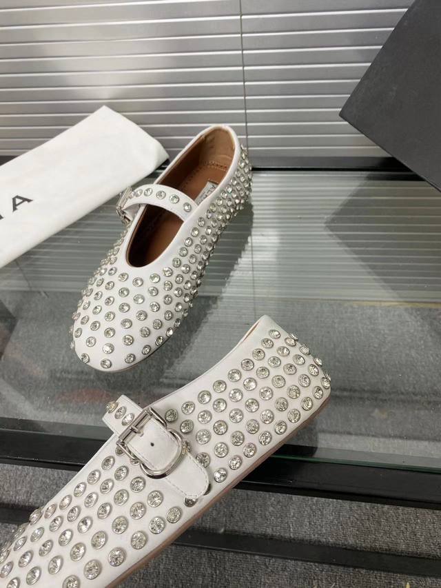 Alaia runway style flat ballet flats! A super popular ballet flat with a sweet and cool ballet style, romantic, charming, comfortable, and versatile. Made with original custom-made cowhide with Swarovski crystal upper, sheepskin lining, and custom-molded rubber non-slip outsole. Sizes: 35-41. Sizes 40 and 41 are custom-made and non-refundable.