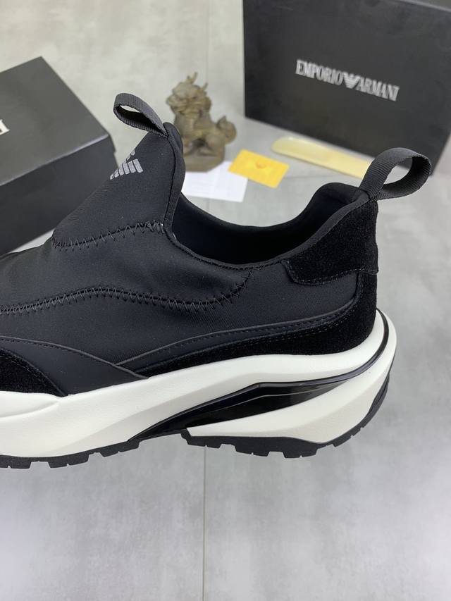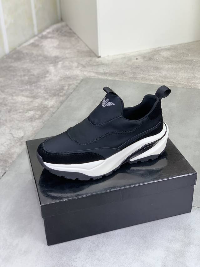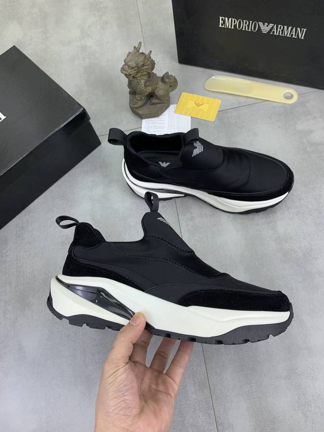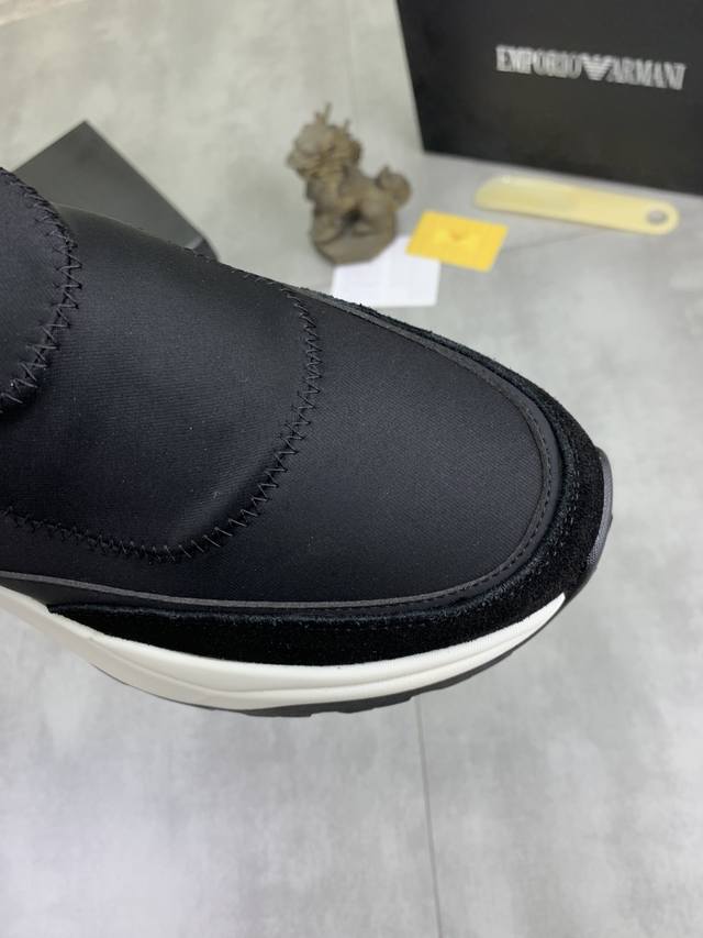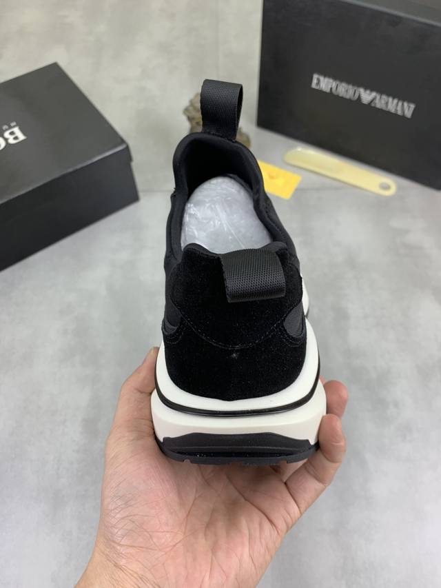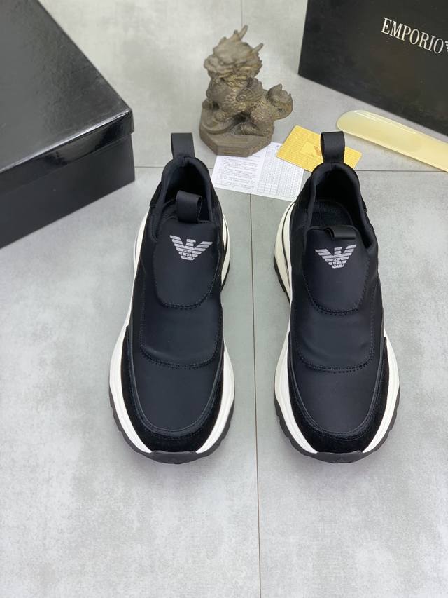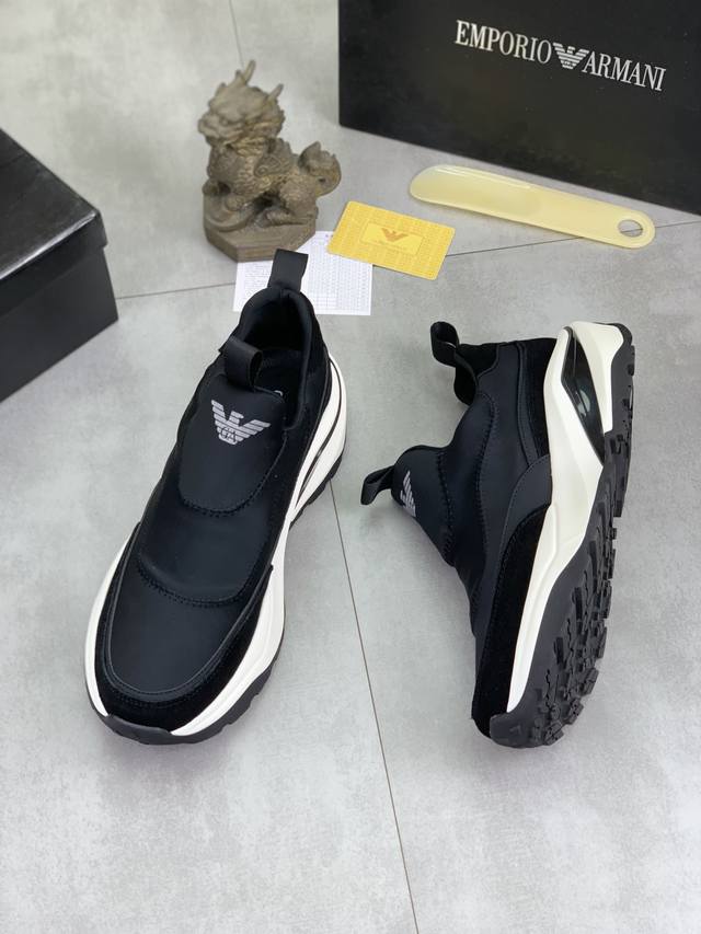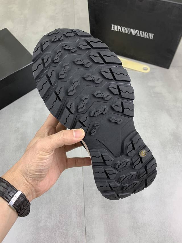 Factory direct price for men's sports shoes, original Giorgio Armani new casual sports shoes arrived, Kint-And-Leather Snakers debut! This shoe features an original design combined with innovative materials, including imported cowhide embossed leather for a three-dimensional look! It boasts a modern, high-tech style, making it the ideal footwear for urban life, exuding a dynamic vibe and youthful energy! The breathable washed sheepskin lining, non-slip, wear-resistant, high-elastic foam, and ultra-lightweight outsole ensure durability and support, providing exceptional comfort. It offers outstanding friction, shock absorption, and moderate support, providing exceptional comfort and superior performance
