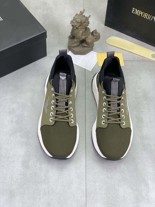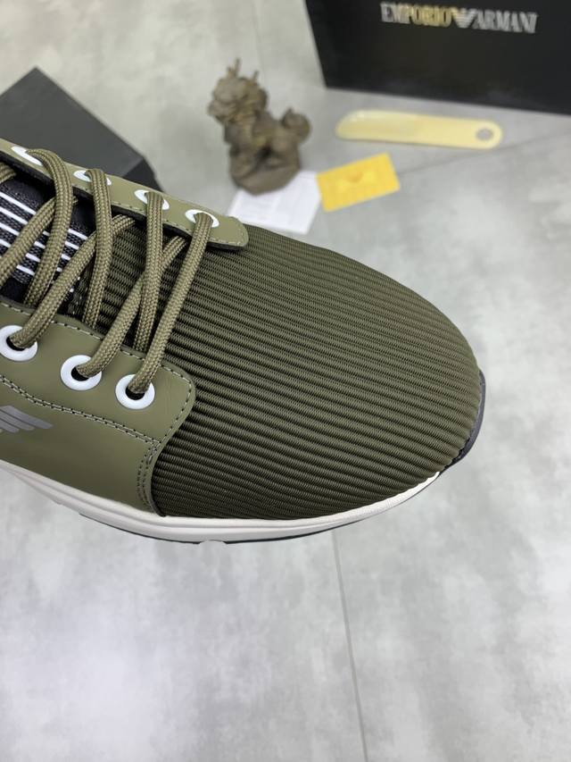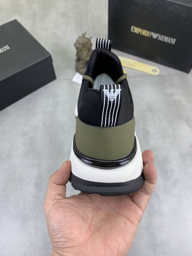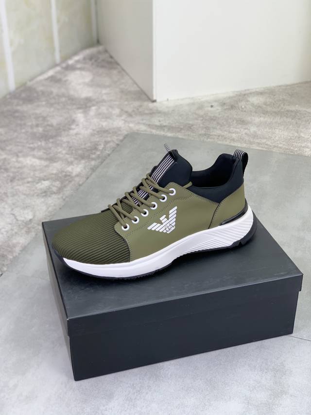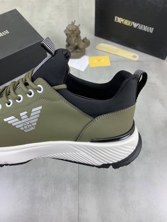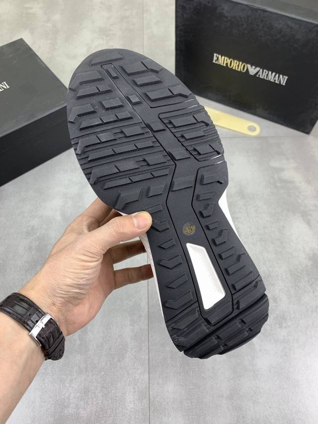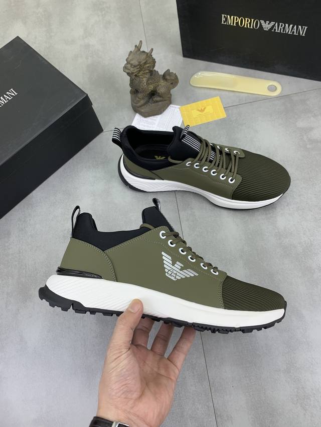 Factory direct price for men's sports shoes, original Giorgio Armani new casual sports shoes arrived, Kint-And-Leather Snakers debut! This shoe features an original design combined with innovative materials, including imported cowhide embossed leather for a three-dimensional look! It boasts a modern, high-tech style, making it the ideal footwear for urban life, exuding a dynamic vibe and youthful energy! The breathable washed sheepskin lining, non-slip, wear-resistant, high-elastic foam, and ultra-lightweight outsole ensure durability and support, providing exceptional comfort. It offers outstanding friction, shock absorption, and moderate support, providing exceptional comfort and superior performance
