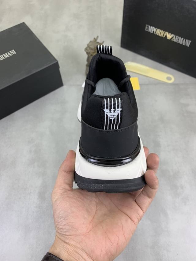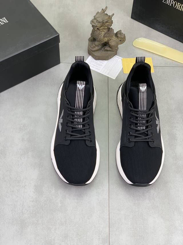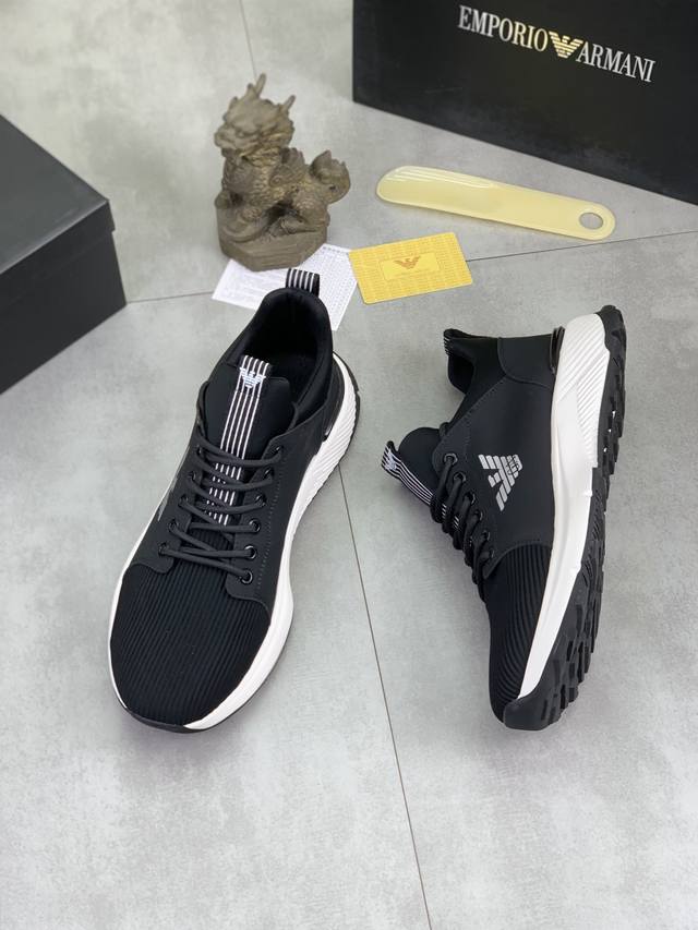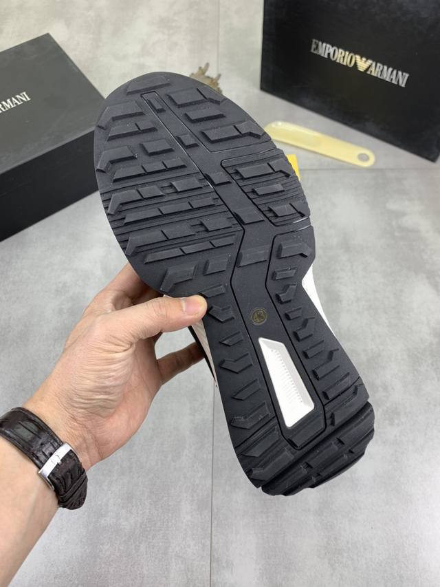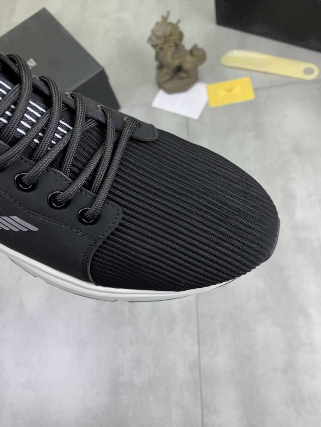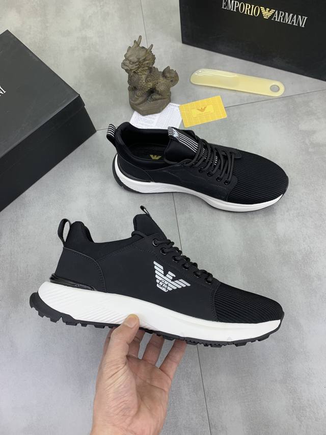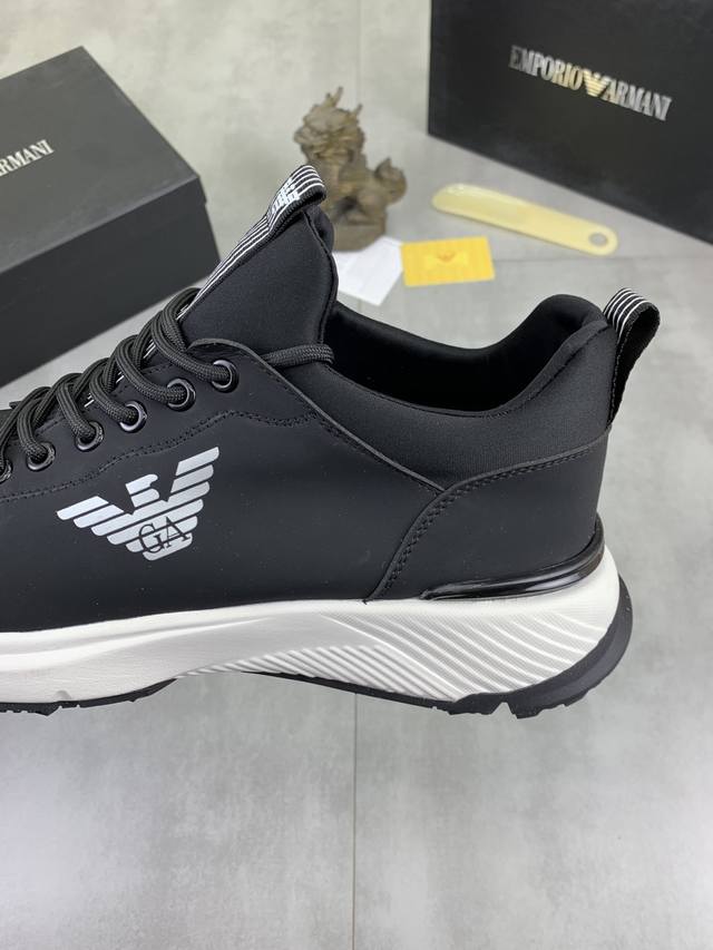 Factory direct price for men's sports shoes, original Giorgio Armani new casual sports shoes arrived, Kint-And-Leather Snakers debut! This shoe features an original design combined with innovative materials, including imported cowhide embossed leather for a three-dimensional look! It boasts a modern, high-tech style, making it the ideal footwear for urban life, exuding a dynamic vibe and youthful energy! The breathable washed sheepskin lining, non-slip, wear-resistant, high-elastic foam, and ultra-lightweight outsole ensure durability and support, providing exceptional comfort. It offers outstanding friction, shock absorption, and moderate support, providing exceptional comfort and superior performance