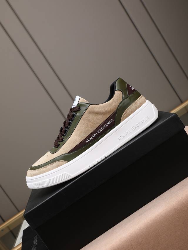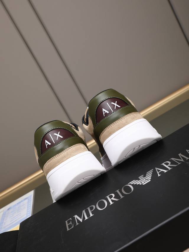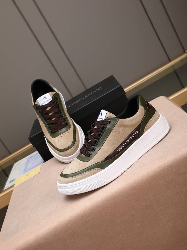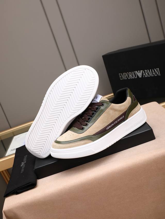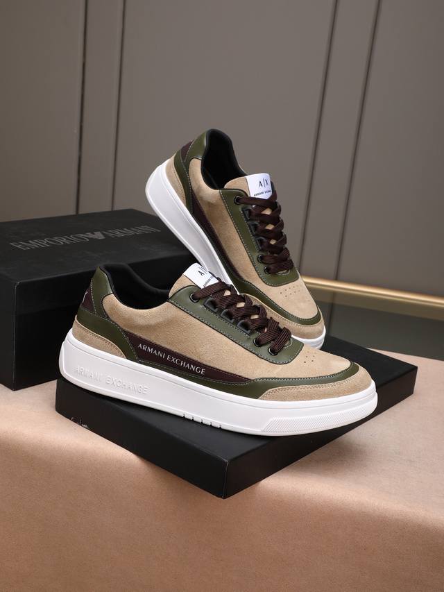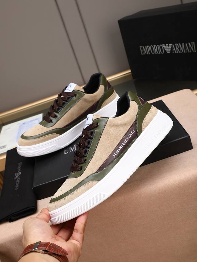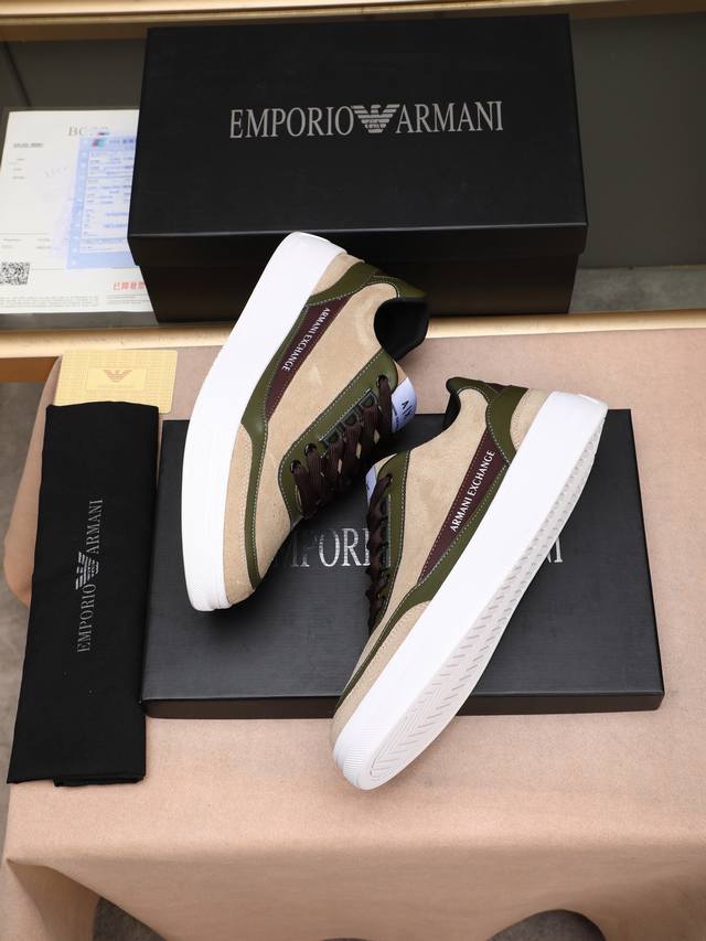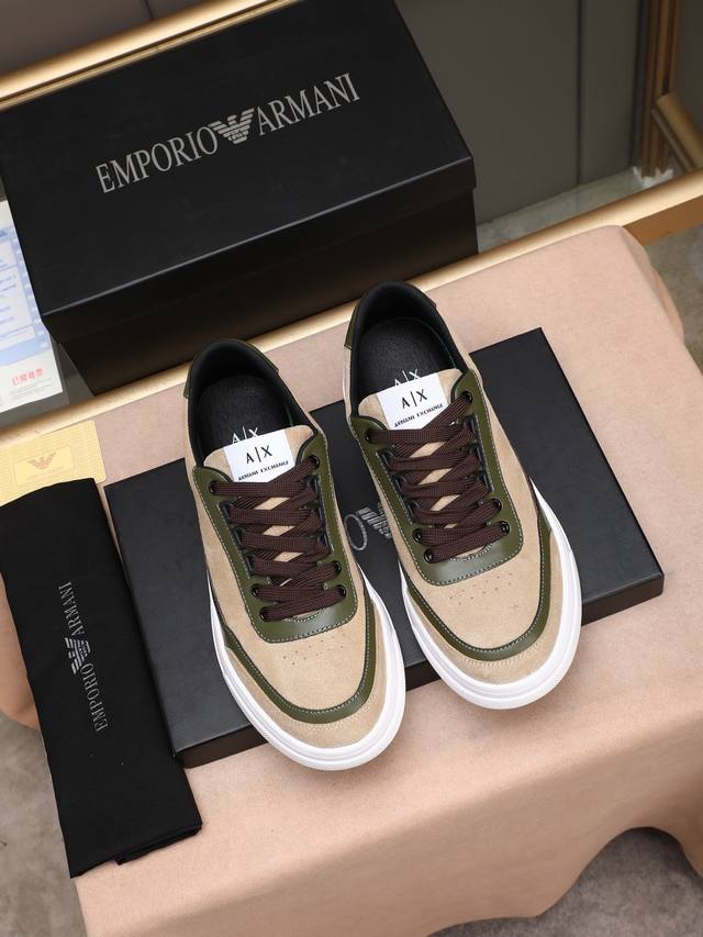 p Giorgio Armani men's casual shoes feature a breathable sheepskin lining with a top-grain nubuck calfskin. The heel is wrapped in smooth calfskin, creating a soft, comfortable, and breathable leather. The tongue and side heel are embellished with the brand's logo. The rubber outsole is non-slip and wear-resistant, ensuring a comfortable and stylish look. Sizes: 38-44, 45, custom-made