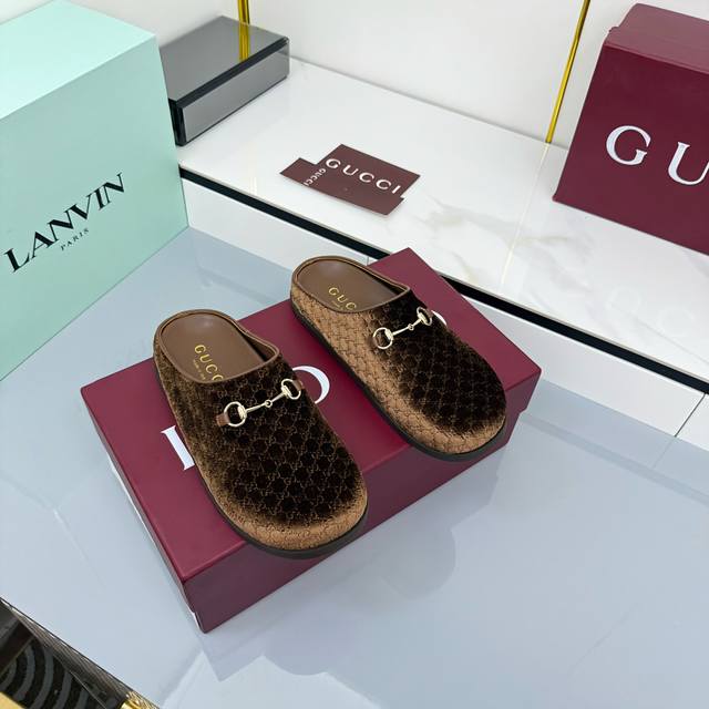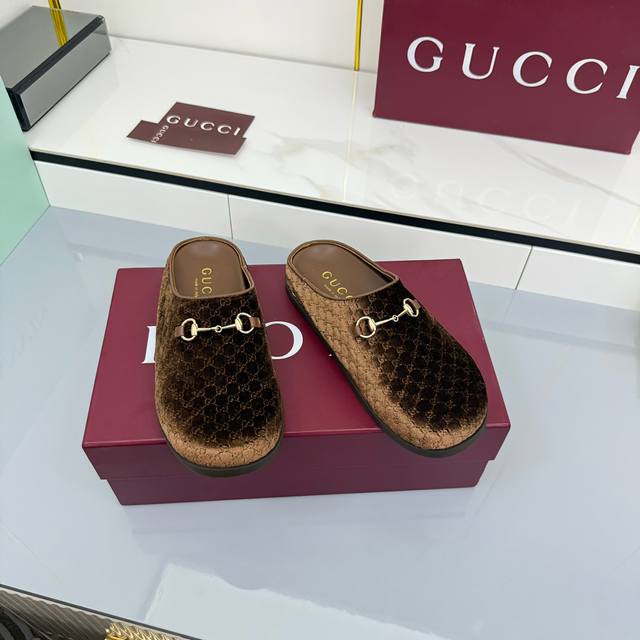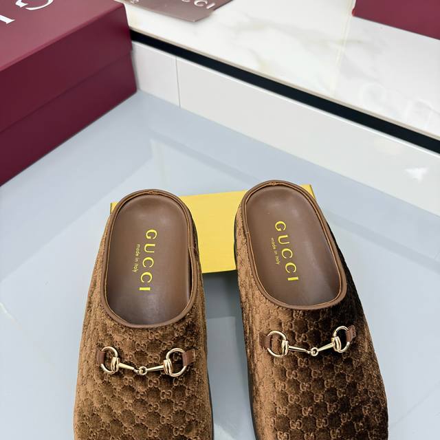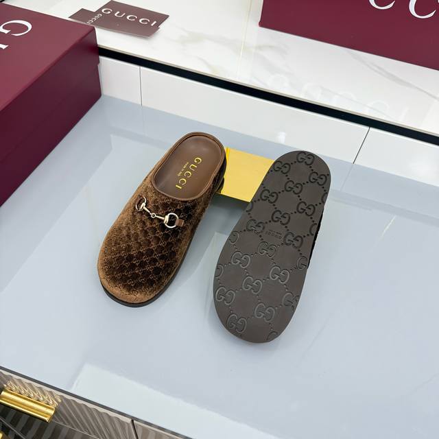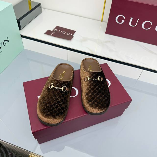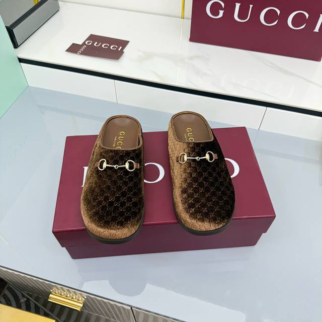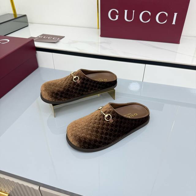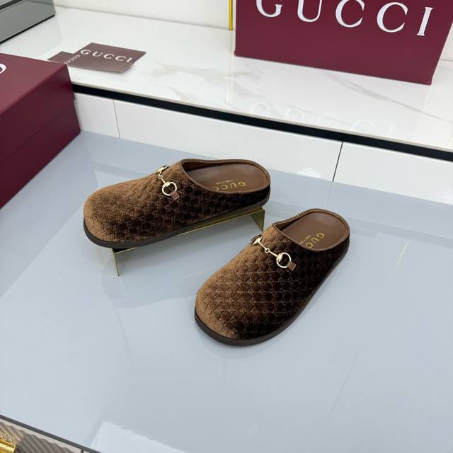 Autumn/Winter New Suede Cowhide Horsebit Wool Slippers DDD Gg The Horsebit hardware, reminiscent of the brand's equestrian heritage, appears on these Camel and high-frequency embossed Gg mules. DDD Brown suede Gg embossed DDD Horsebit trim DDD Gold-tone hardware DDD Wool lining DDD Round toe DDD Rubber sole DDD Flat sole DDD Made in Italy DDD Sizes: 36-42 DDD