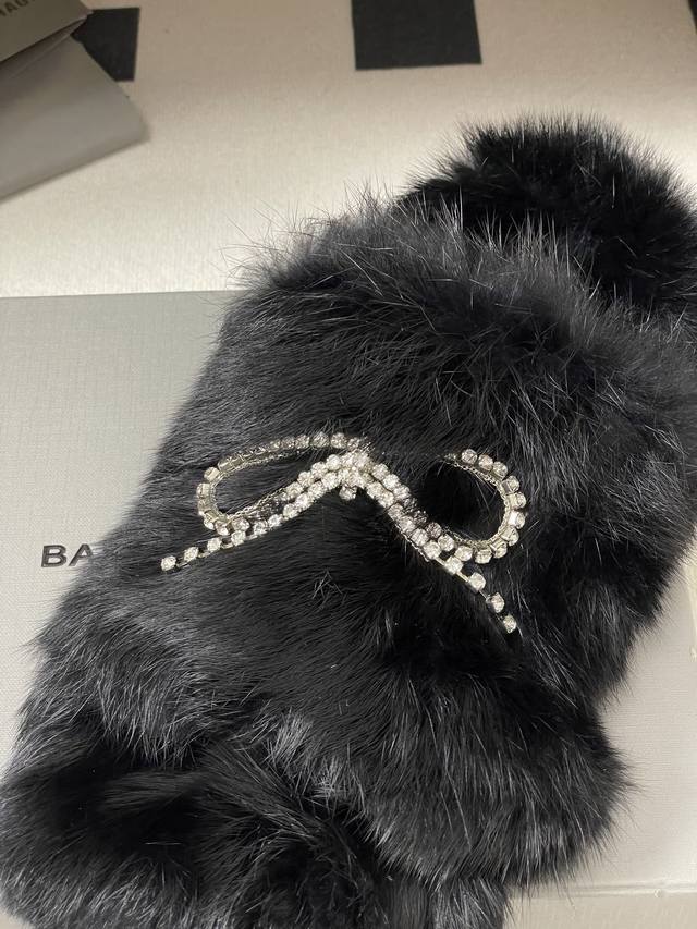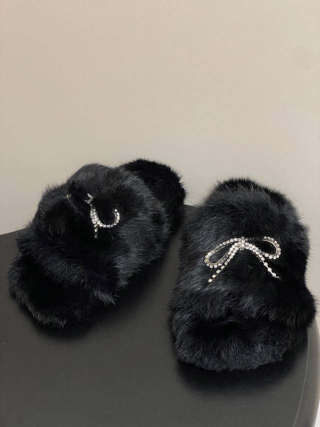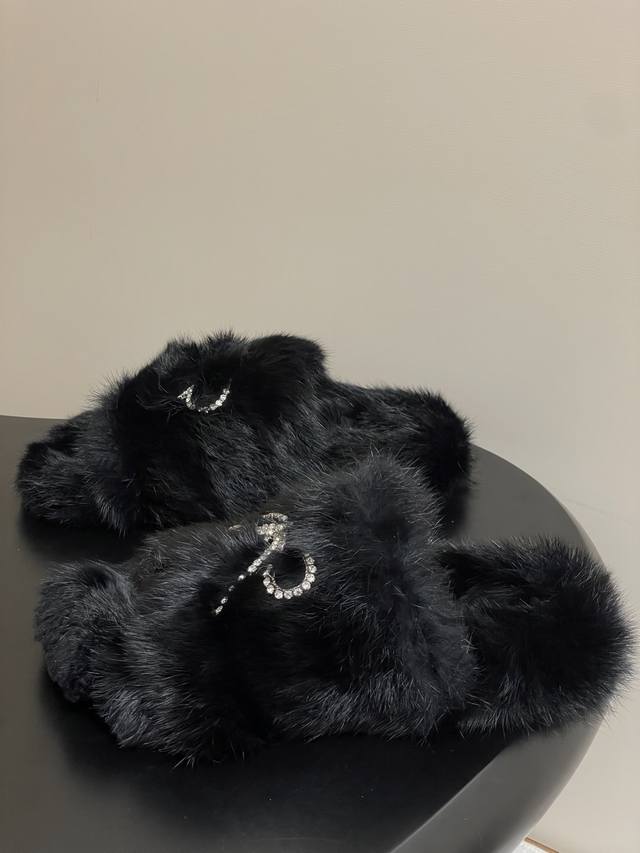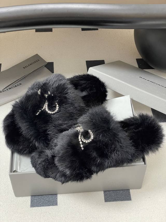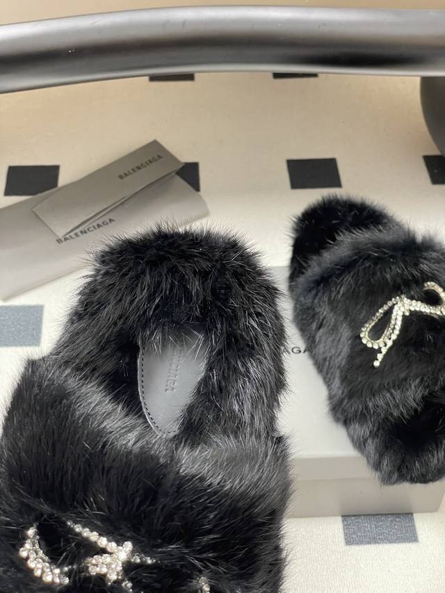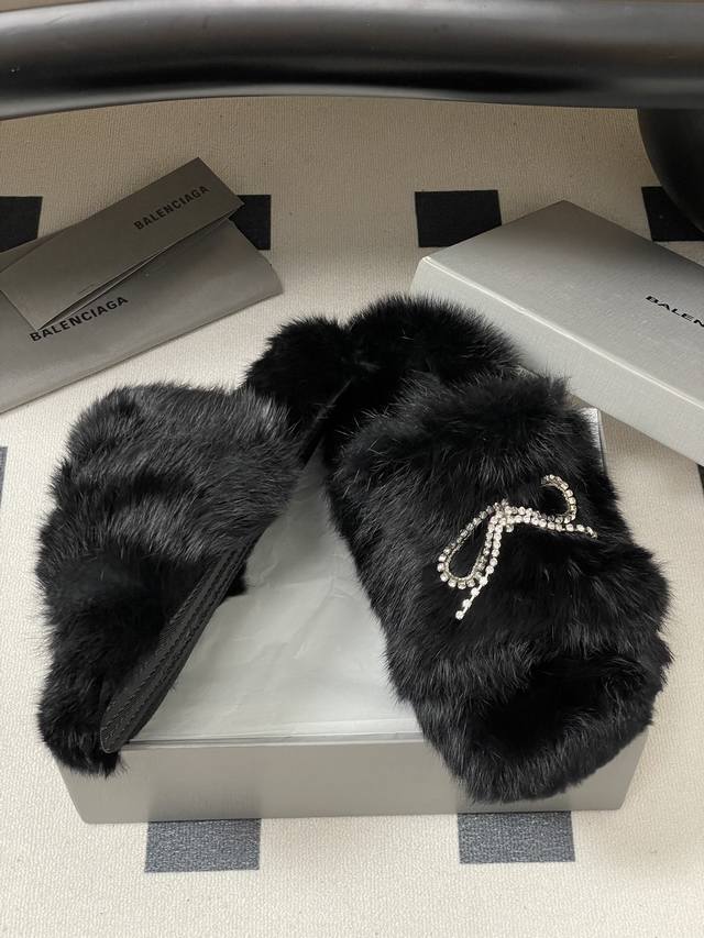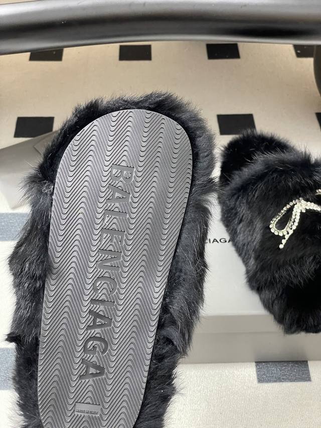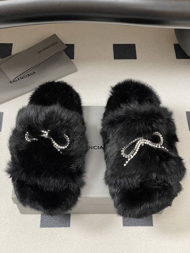 25S New Fall/Winter Balenciaga Paris Family's latest crystal diamond bow and diamond chain furry shoes thick-soled rabbit fur slippers