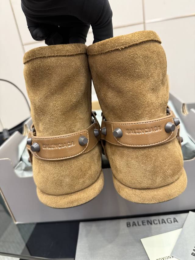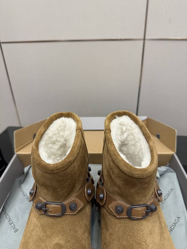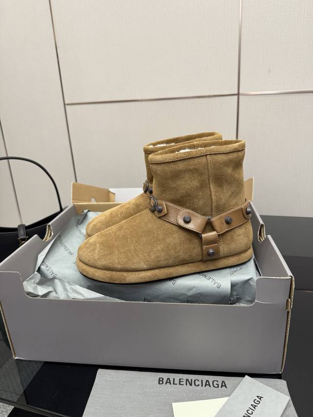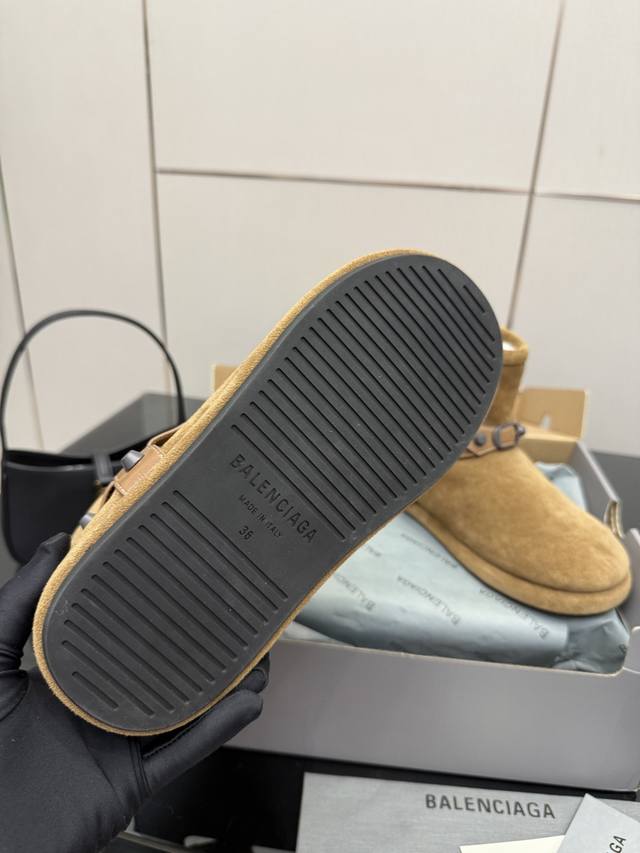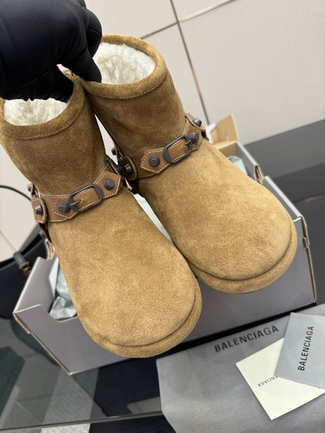 Balenciaga 2025 Fall/Winter New Belt Buckle Rivet Snow Boots are absolutely stunning! The design is incredibly stylish, breaking away from the traditional dullness and bulkiness of snow boots. The upper is made of silky cow suede, exuding a delicate and luxurious feel. The entire lining is made of pure wool for warmth and comfort. The rubber outsole is non-slip and wear-resistant, adding an extra layer of security for wet winters. Size: 35-40, 40 custom-made.