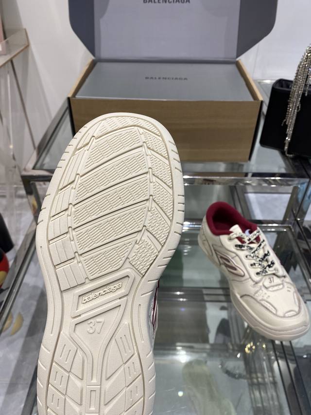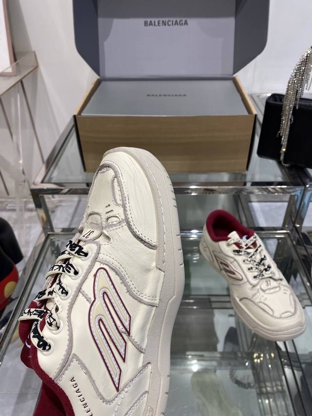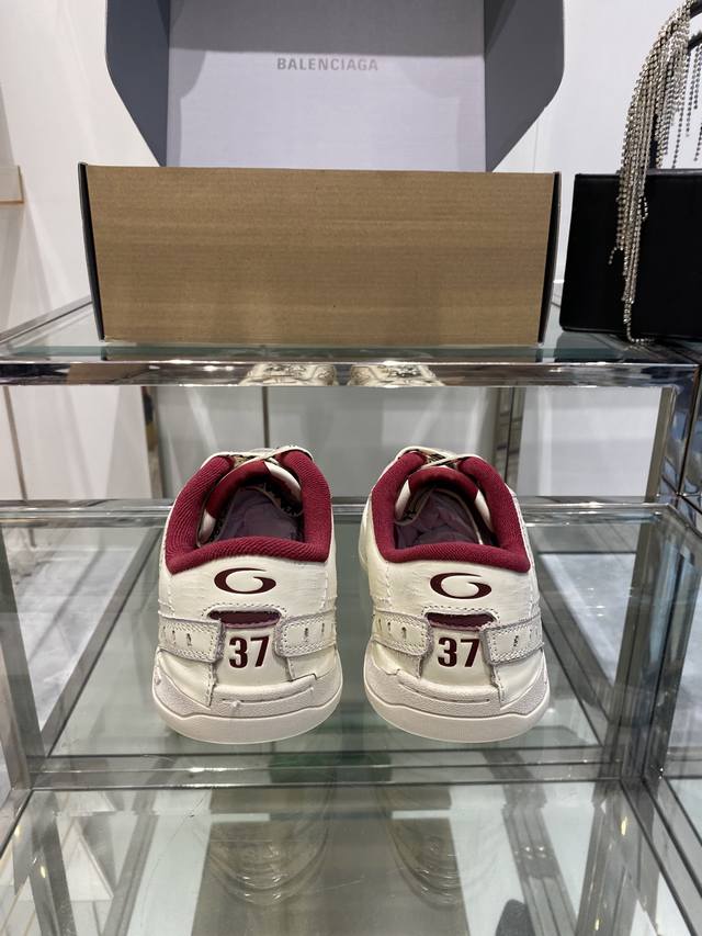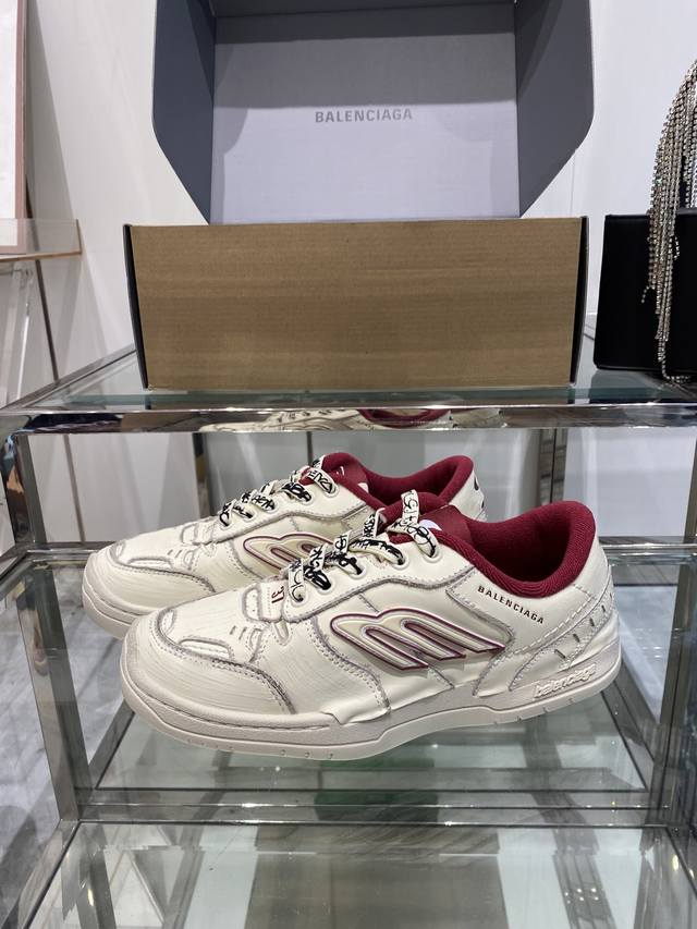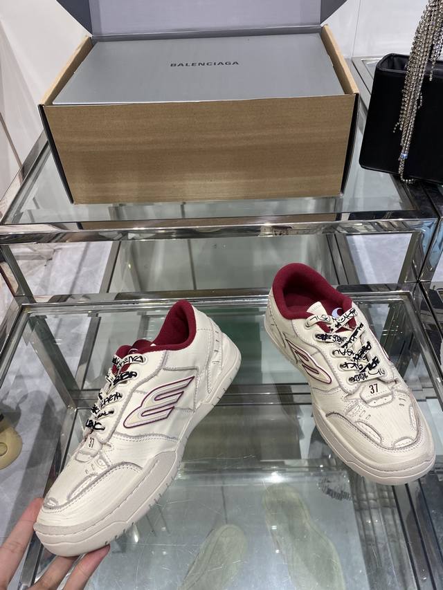 Original Purchase and Re-production Hamptons Sneaker This new shoe continues the consistent aesthetic style of creative director Demna, incorporating frayed edges, exposed stitching, asymmetrical details, scratches, graffiti-style shoelace lettering, and a distinct toe curve. Unlike the previous exaggerated and heavy 3XL and Cargo styles, the Hamptons Sneaker has a more restrained silhouette, adopting a more traditional sole structure rarely used by Balenciaga, and featuring a patchwork leather upper, making the overall look more casual yet still unique