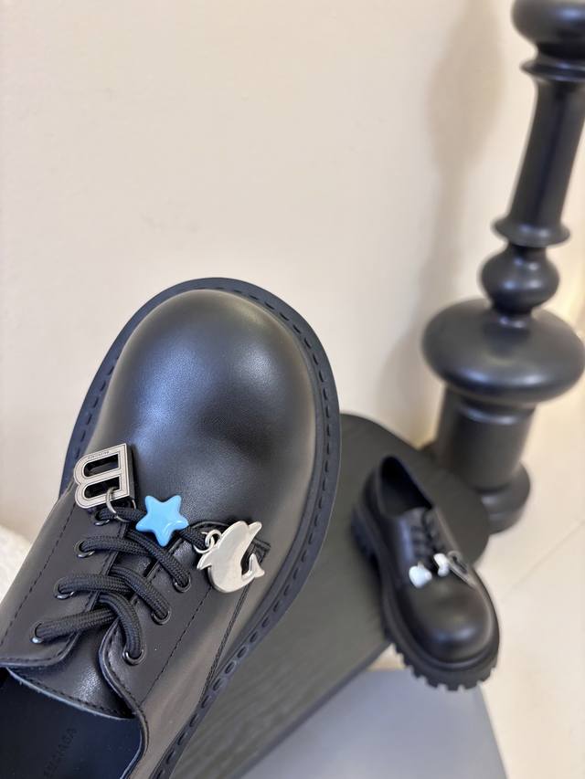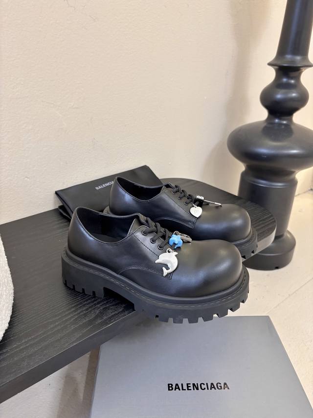 Balenciaga 26 Hummer Derby Shoes with Keychains and Charms. These shoes stand out with their unique charm. The typical hardware finish not only highlights the marks of time but also gives them a distinctive character. The carefully chosen embellishments, including keys, charms, and badges, undoubtedly add endless detail and visual richness. Comfortable and stylish on the feet, they offer a comfortable fit. Outer material: Black full-grain calfskin. Lining: Black calfskin. Original molded sole. Heel height: 5cm. Sizes: 35-40.
