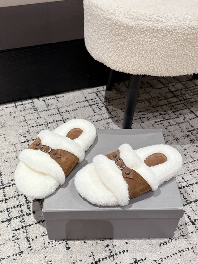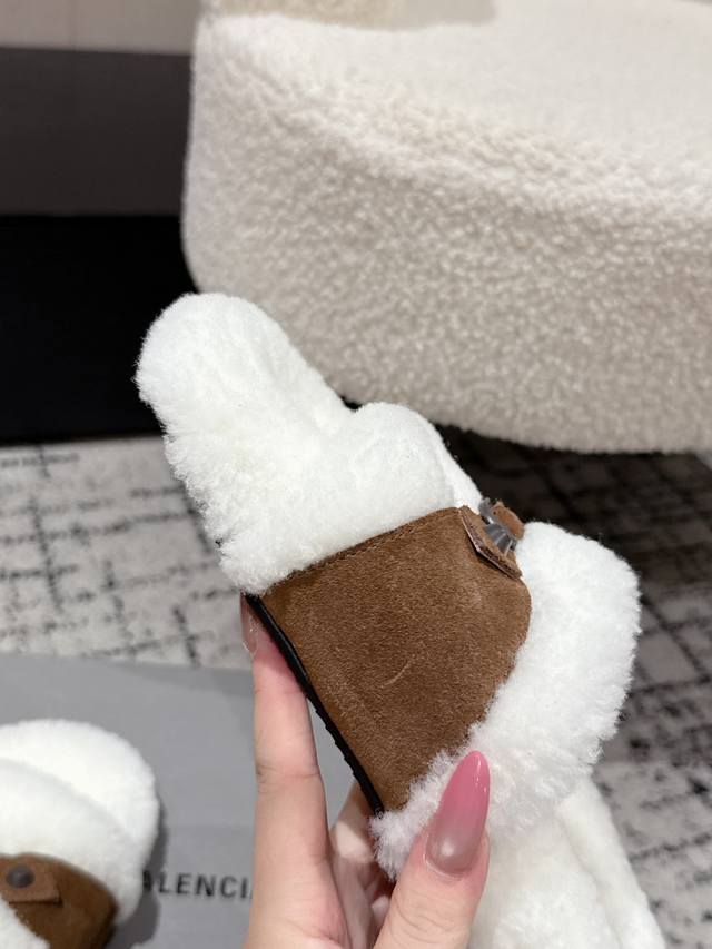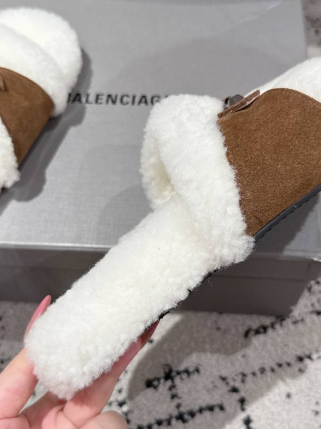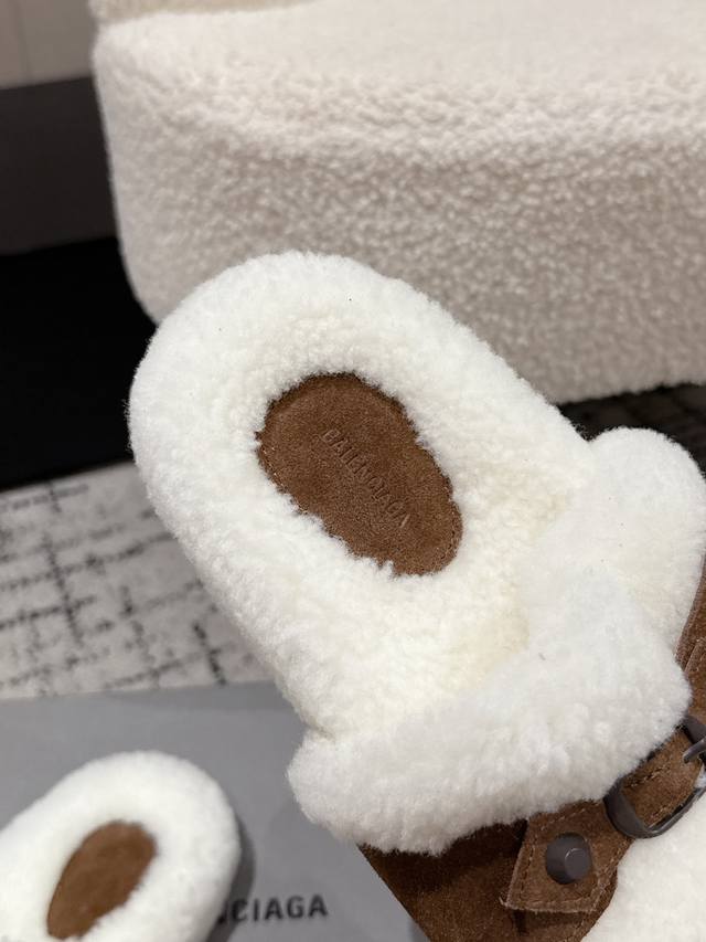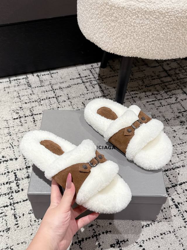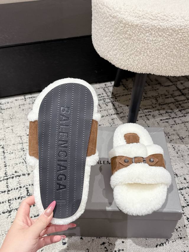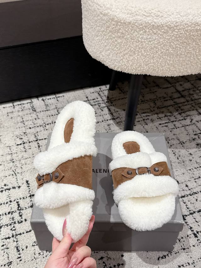 Balenciaga Fall/Winter 2023 Wool Slippers - Classic Buckle Studded Wool Slippers. These uniquely designed slippers feature straps and other details that not only provide a secure fit but also allow for adjustable tightness. The brand's signature distressed hardware is present throughout, subtly creating a vintage, worn effect that exudes personality. The thick, serrated rubber sole ensures comfort while enhancing the overall style and recognizability. Undoubtedly a must-have fashion item this season, these slippers will add a unique charm to fashionistas' outfits and lead a new wave of trends. Material: Suede; Lining: Wool; Outsole: Molded Rubber Outsole; Size: #35-40 (40 sizes are custom-made and non-refundable).