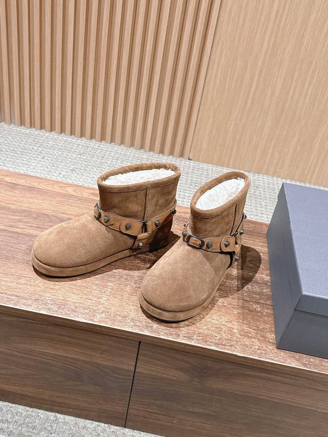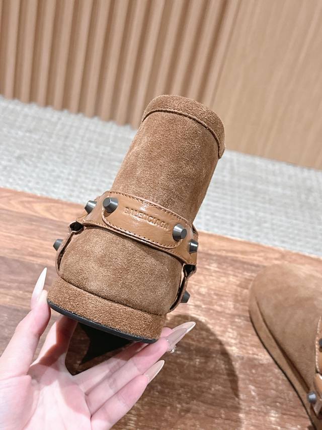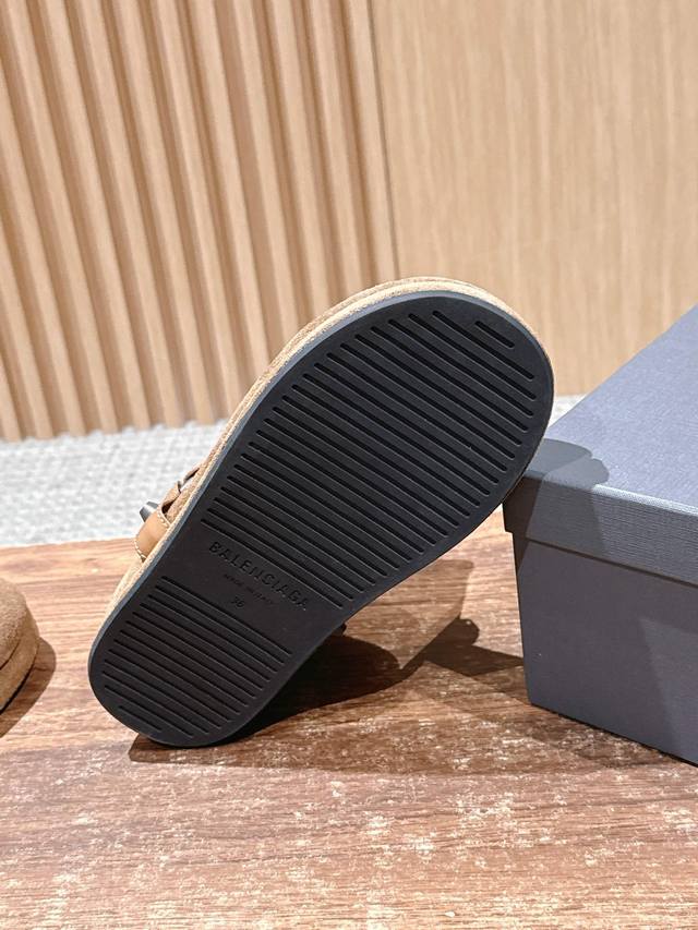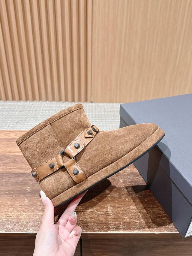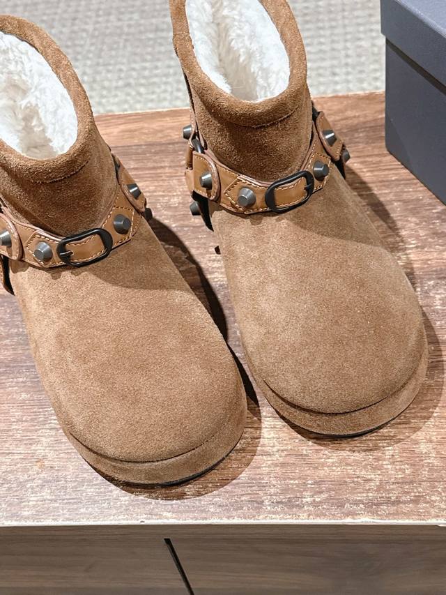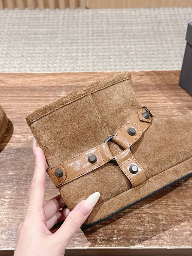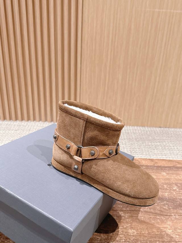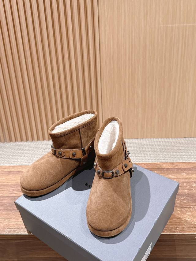 Balenciaga Fall/Winter Studded Belt Buckle Snow Boots DDD These boots blend street style with winter warmth. The suede upper, adorned with a metal studded belt buckle, breaks away from the traditional "soft and cute" image of snow boots, adding a rebellious and individualistic edge. The soft plush lining provides both warmth and comfort. DDD The upper is mostly made of high-quality suede, with a delicate touch and a vintage feel; the plush lining is usually made of sheepskin or faux fur, providing long-lasting warmth in the cold winter; the sole is sturdy, offering both slip resistance and support. DDD Upper: Cow Suede DDD Lining: Wool DDD Outsole: Original Mold Outsole DDD Size: 35, 40 (Custom sizes 40 are non-refundable and non-exchangeable) DDD