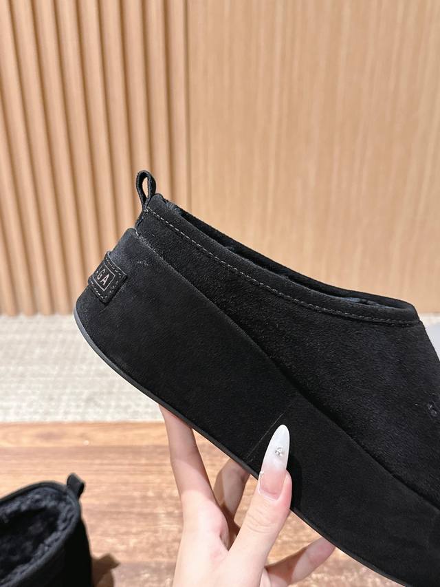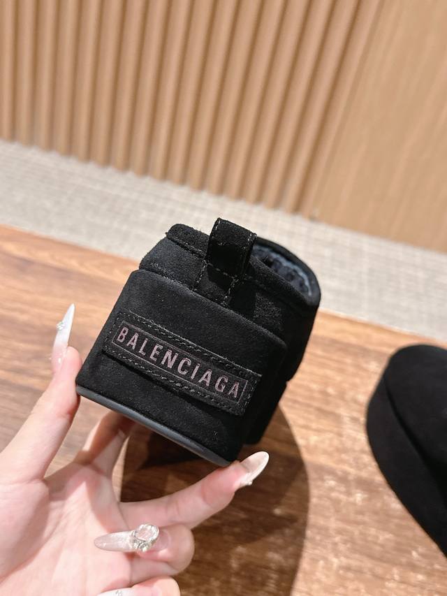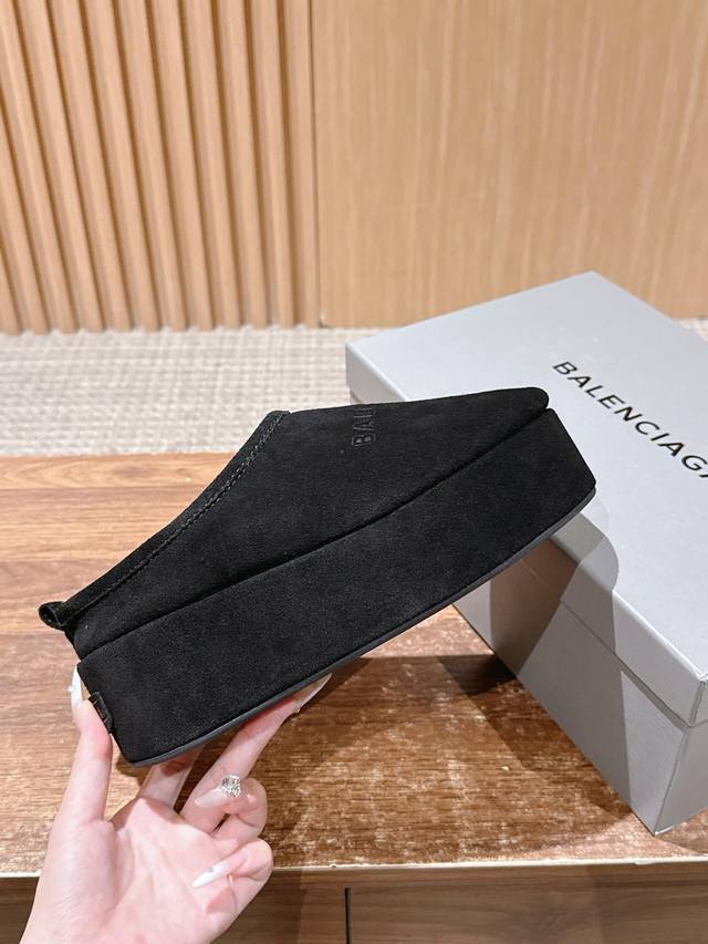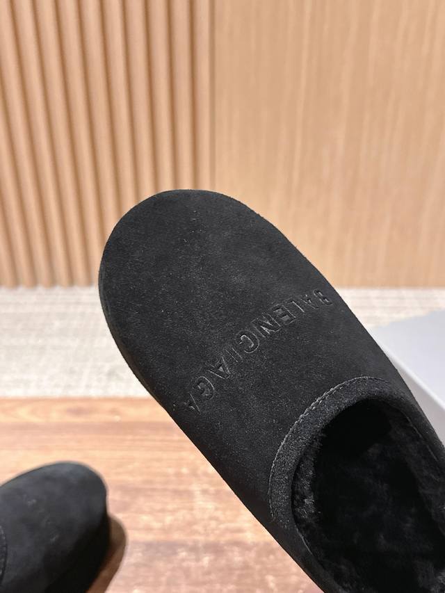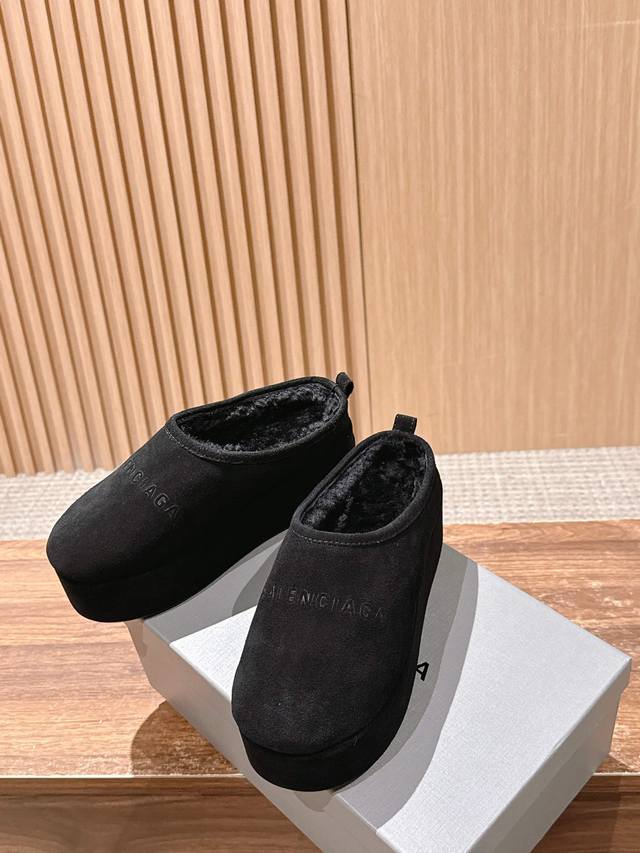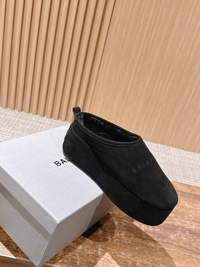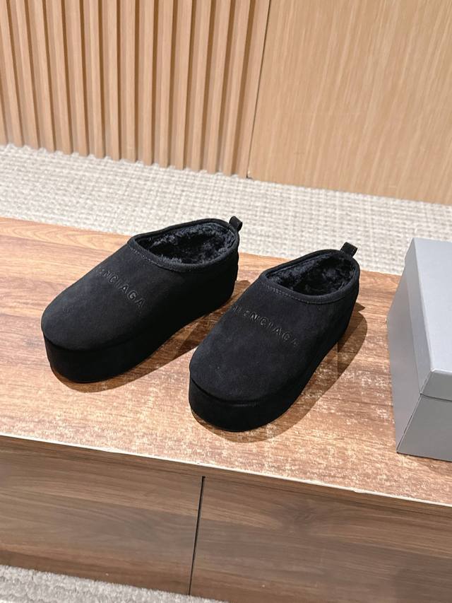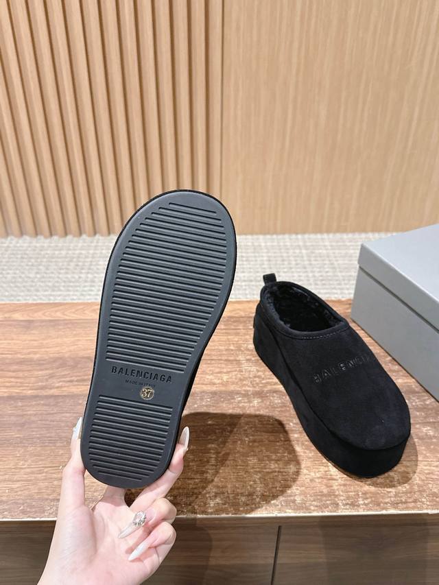 Balenciaga New Platform Plush Slippers DDD The upper is crafted from khaki suede, offering a delicate texture and a retro feel; the lining is filled with plush material, providing both warmth and comfort. DDD The exaggerated platform sole instantly elevates the style and adds a sense of sophistication; the iconic "Balenciaga" logo is embossed on the upper, a direct representation of the brand's identity; a small pull tab at the heel makes them easy to put on and take off, adding a subtle detail to the overall design. DDD Upper: Denim Suede DDD Lining: Wool DDD Outsole: Original Mold Outsole DDD Size: 35-39 Size 40 (Custom orders are non-refundable and non-exchangeable) DDD