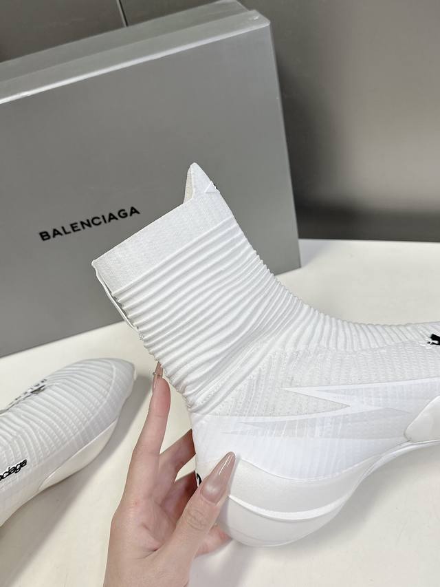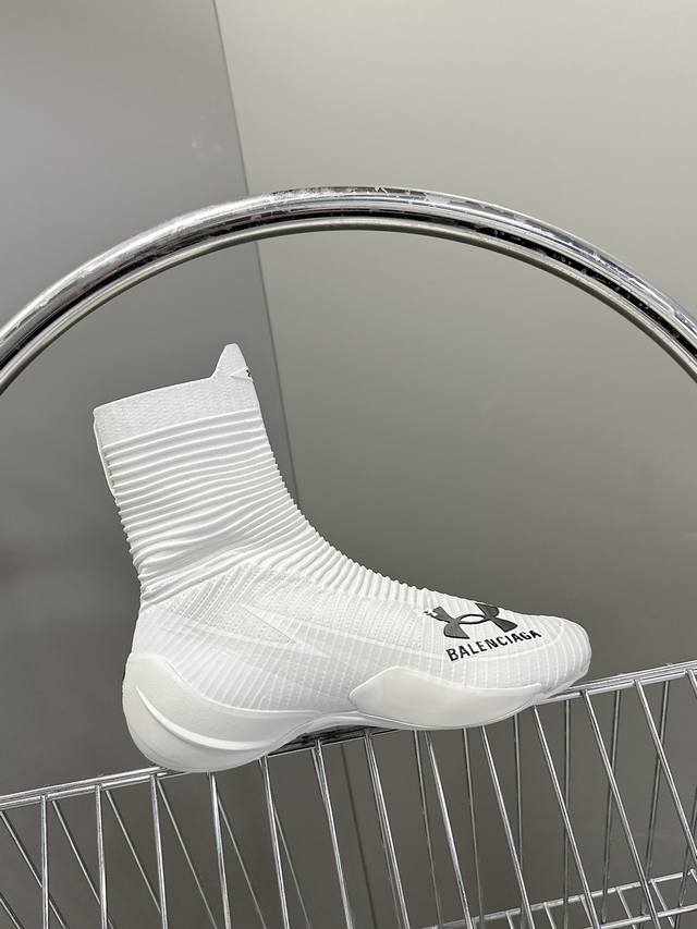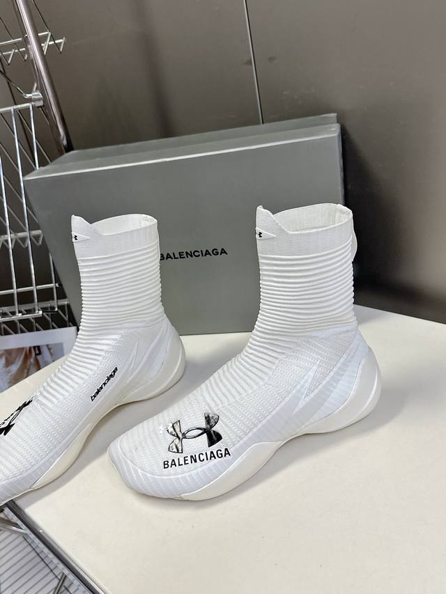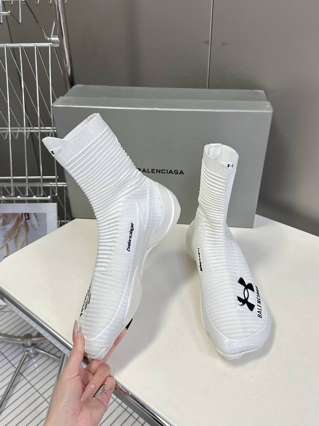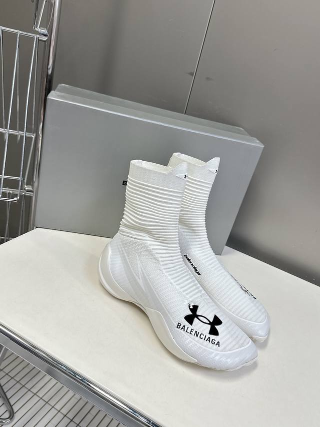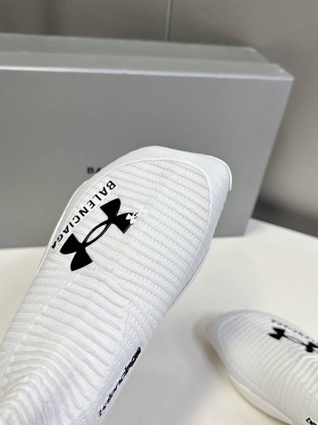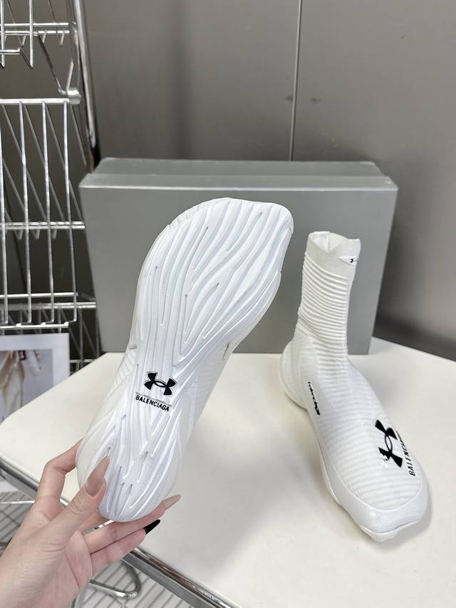 Balenciaga Spring/Summer Runway Collection Under Armour Collaboration Couple Sock Shoes, purchased from a department store for 10,310 RMB. The Balenciaga and Under Armour capsule collection is a bold collaboration between a high-end luxury brand and a sportswear brand. This collection includes oversized hoodies, shorts, and modern accessories, embodying the fusion of high fashion and sportswear. Balenciaga is known for its avant-garde approach, while Under Armour is renowned for its performance gear; together, they created pieces suitable for both streetwear enthusiasts and high fashion lovers. The collaborative collection features a minimalist design with dual branding, showcasing a seamless blend of Balenciaga's luxury and Under Armour's athletic aesthetics. Original custom flyknit upper with exclusive private mold rubber PU combination outsole. Sizes: 35-40, 39-45, 40, 45 (Customized).