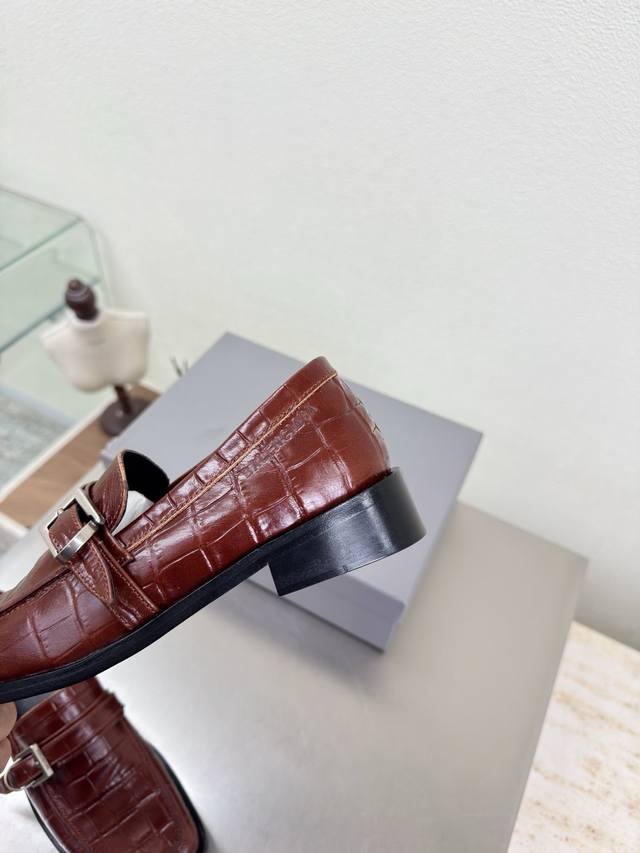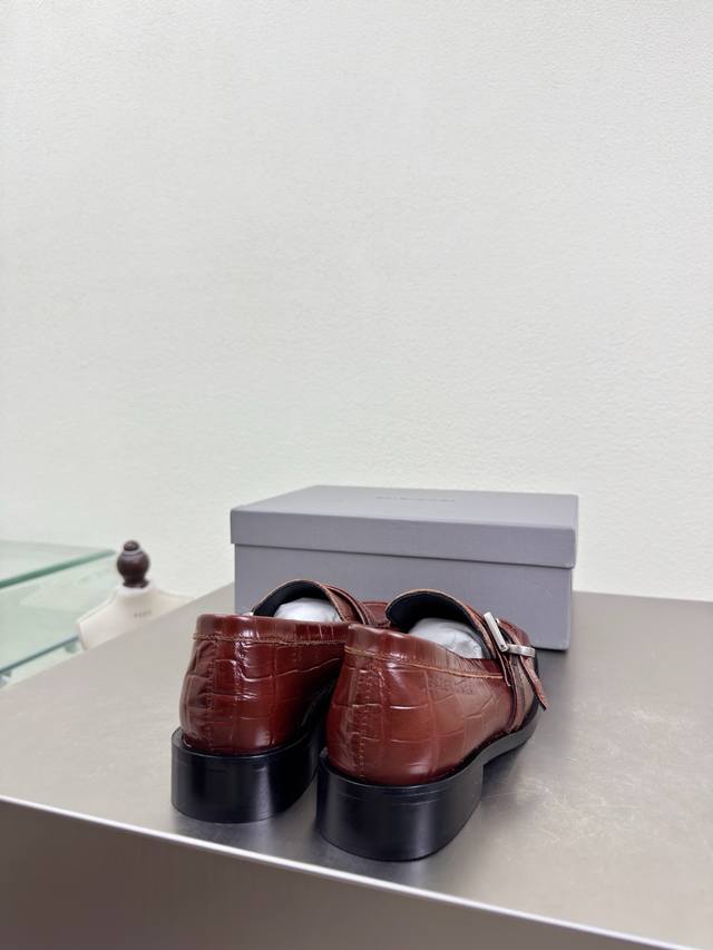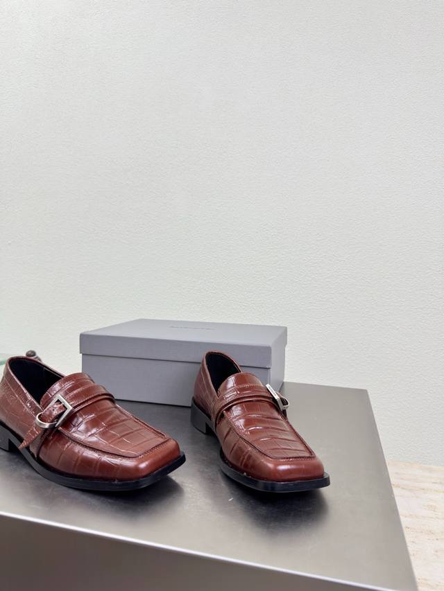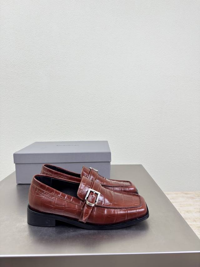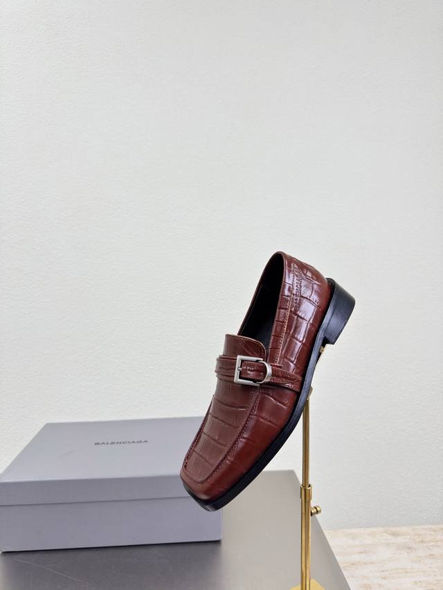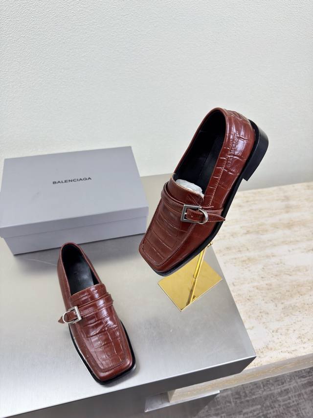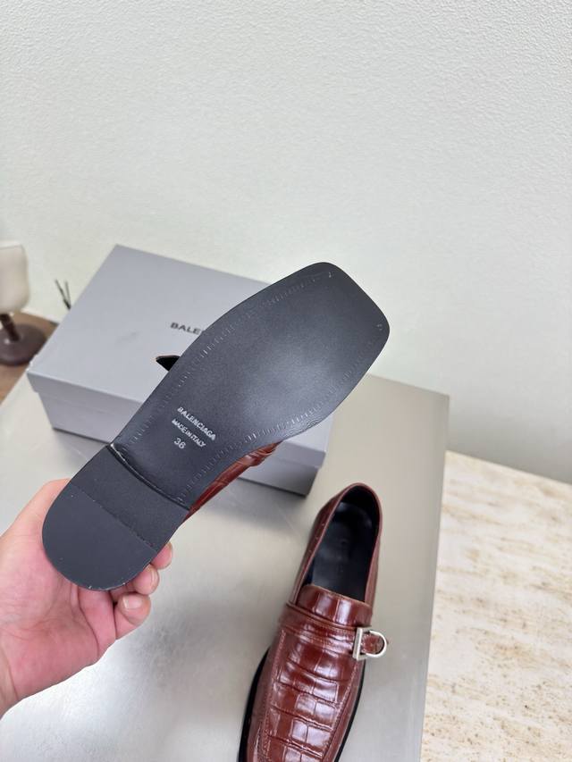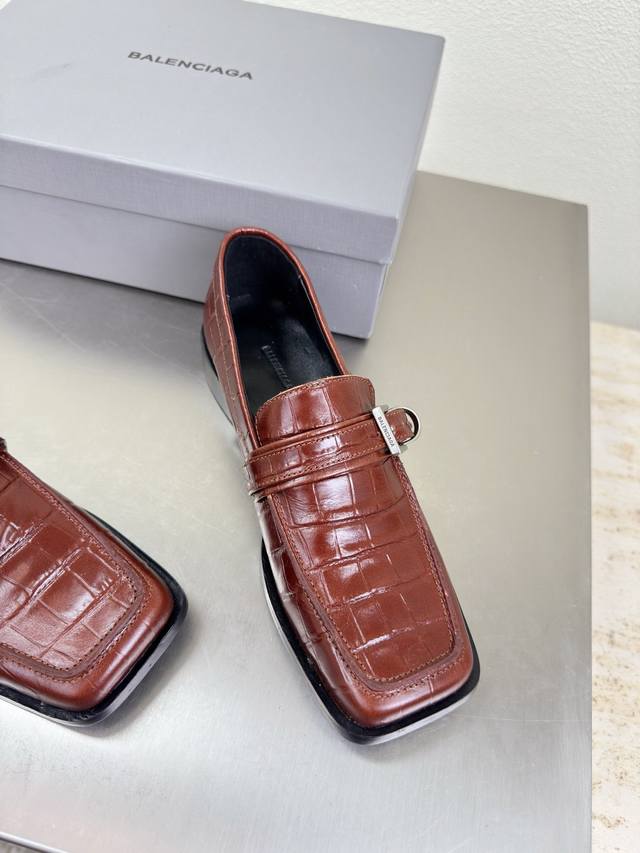 Balenciaga Square Toe Loafers, Haute Couture Series. Features exclusive Balenciaga metal sphere embellishments, reddish-brown crocodile-embossed cowhide leather upper, lambskin lining, and black upper. Top-tier version with all materials matching the original. Continues Demna's rebellious attitude against mainstream glamorous fashion. Features a translucent dyeing process, a large logo, a special heel design with the family logo, and an Italian genuine leather outsole. Sizes 34, 35, 36, 37, 38, 39, 40, 41. Custom orders are non-refundable and non-exchangeable. Comes with original packaging.