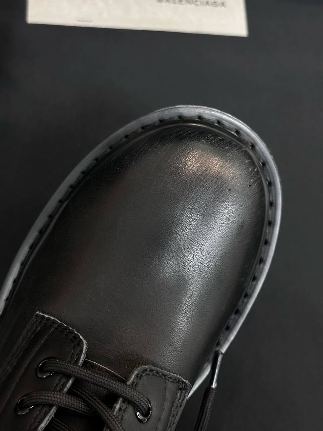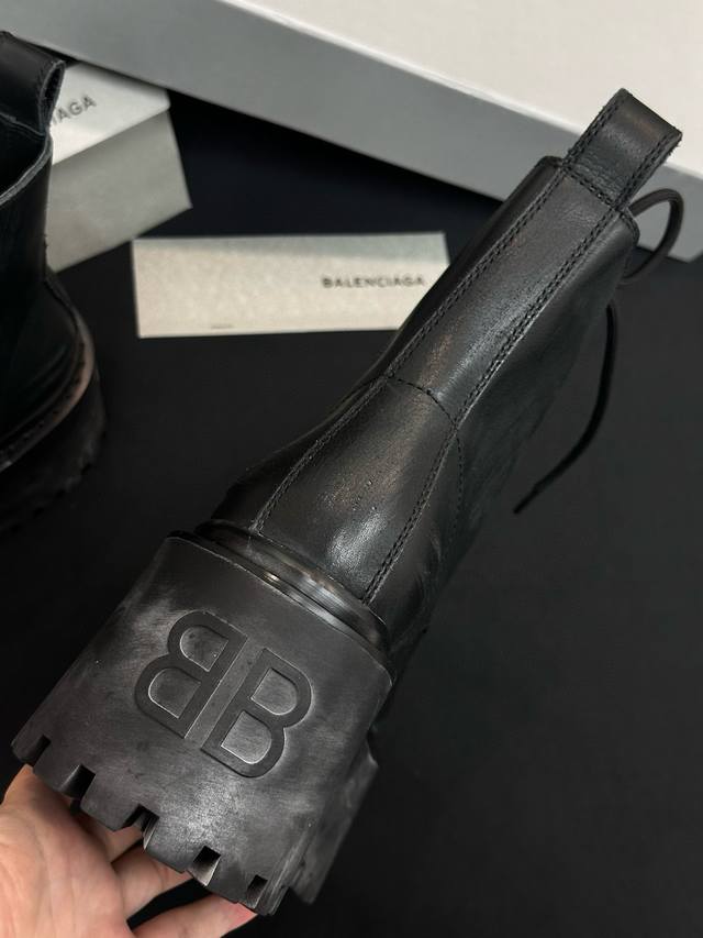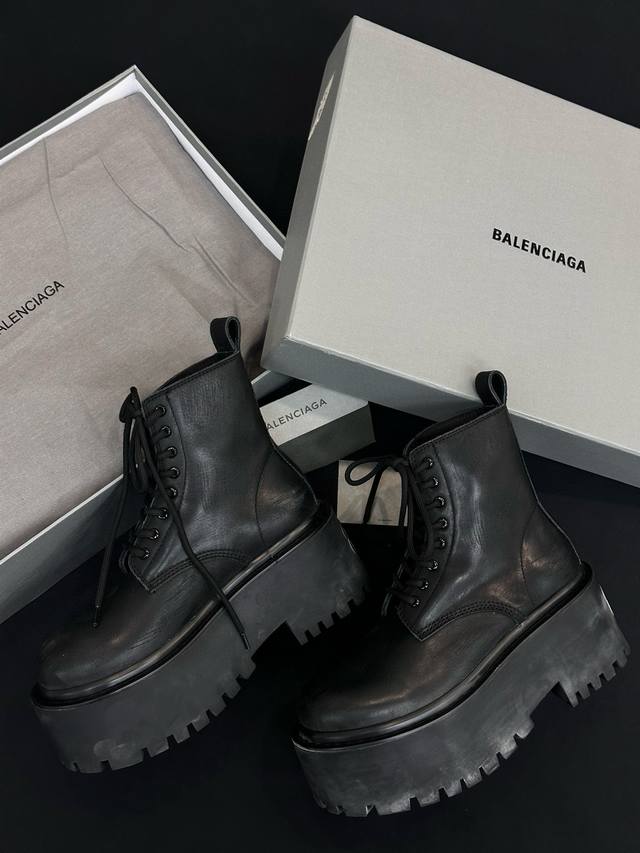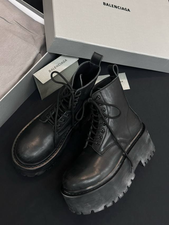 Balenciaga Strike Women's Platform Ankle Boots, New Arrival (Style 25). Features an embossed Bb logo on the heel and a distressed, polished upper for a premium feel. The boots boast a subtle yet luxurious sheen, offering both comfort and style. Whether paired with skinny jeans for a cool street style or with a unique skirt for a different look, these boots effortlessly pull it off. Wearing them will make you the most eye-catching person on the street, perfectly embodying your fashion attitude. Material: Original tree-plastered cowhide. Lining: Silk cowhide. Sole thickness: 8cm. Sizes: 35, 36, 37, 38, 39, 40. Sizes 40 and 40 are non-refundable.