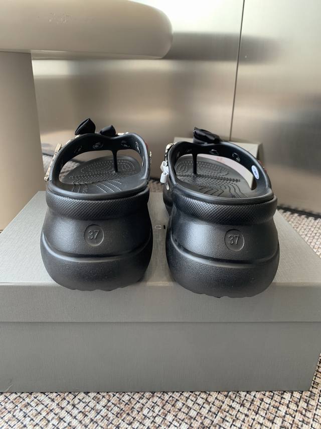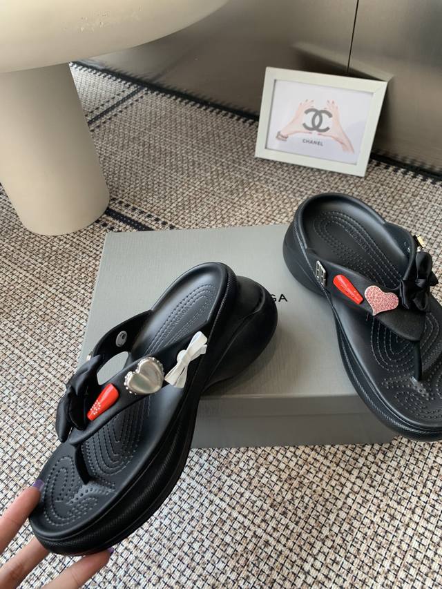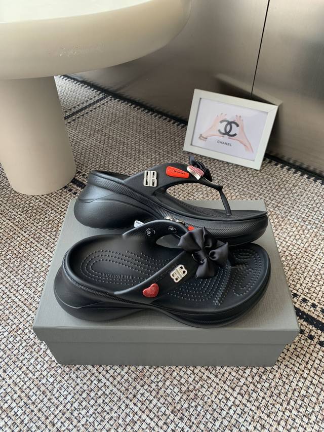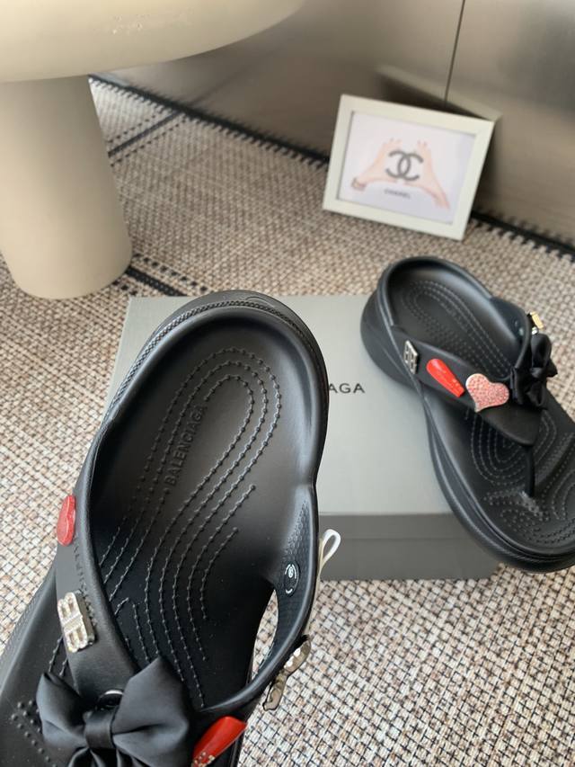 Balenciaga's new summer 25Ss bow-knot platform sandals. The upper is adorned with playful bow elements and pink diamond heart letters, creating a delicate and eye-catching look. The thick sole not only subtly increases height but also allows you to walk with confidence, creating a trendy look without appearing bulky. The material is soft and skin-friendly, making it so comfortable it feels like walking on clouds. Whether paired with casual shorts and a T-shirt, or a beautiful dress, it seamlessly complements the look, instantly elevating the style. Sizes: 35-40. 40 Made to order.