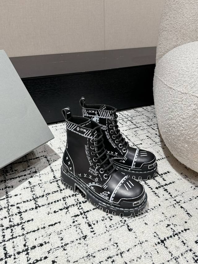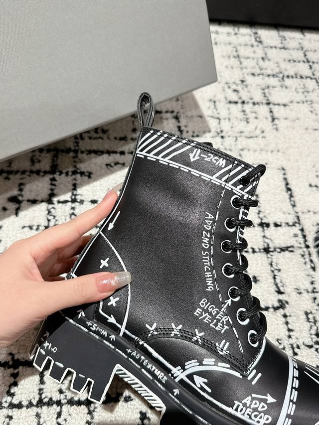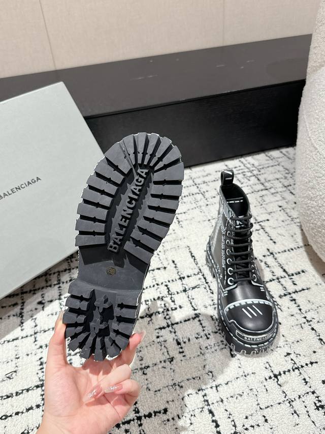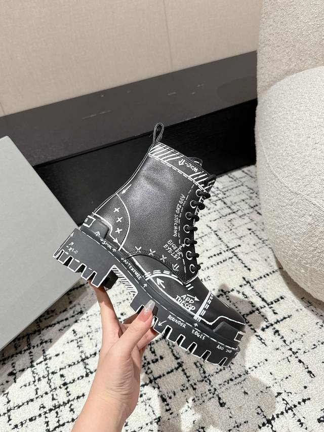 Couple Style DDD Balenciaga 24 Bulldozer Boots Graffiti Ankle Boots DDD Balenciaga's design style has always been distinctive, dark, biker, and exaggerated, taking an unconventional approach. The Bulldozer series is both stylish and suitable for everyday wear. DDD Material: Black grained calfskin DDD Lining: Black cowhide DDD Outsole: Coarse-toothed rubber combination outsole instantly adds 8cm in height DDD Size: #Women's 35-40 Men's 39-44 Women's 40 Made to order, no returns or exchanges DDD
