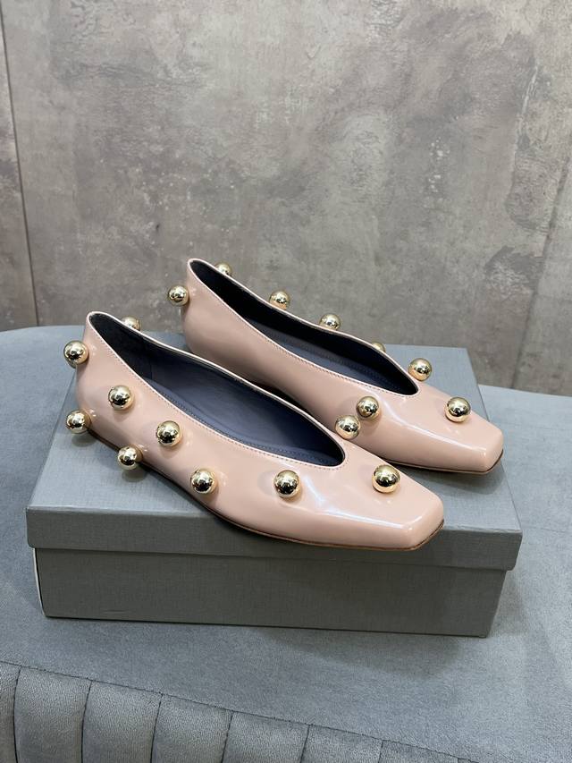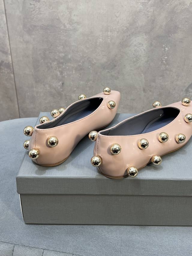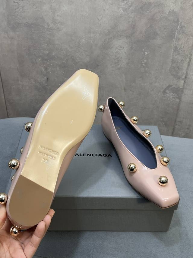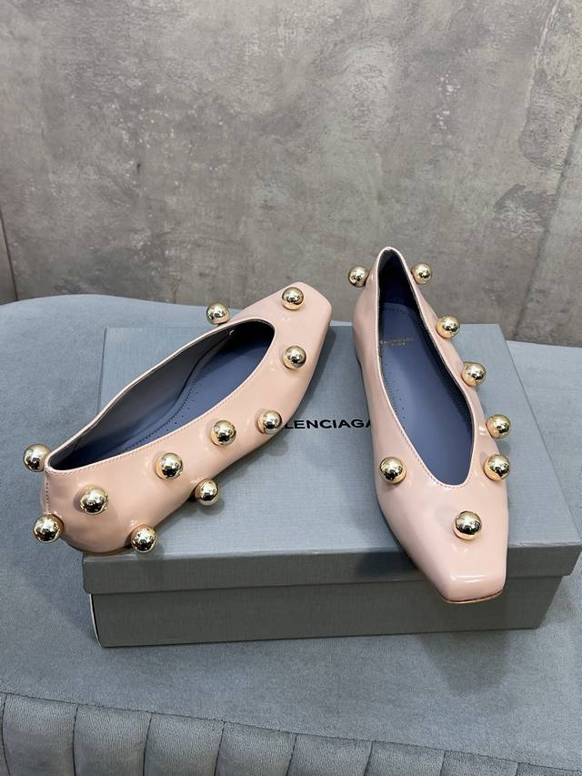 Factory Direct. Balenciaga's latest runway model, metal-studded biker punk ballet flat Mary Jane shoes. Made of glossy cowhide leather, adorned with metal studs; studs are a common decorative technique used by the brand to enhance the look's power and recognizability. Neutral, cool, and strong, the contrast between the cowhide leather and gold studs gives the shoes a modern and rebellious feel; the square toe shape has been making a comeback in recent years, emphasizing fashion and individual expression. Upper: Custom-made split beaded cowhide. Insole: Sheepskin. Outsole: Italian genuine leather. Sizes: 35-39 (34, 40, 41). Custom-made, no returns or exchanges.