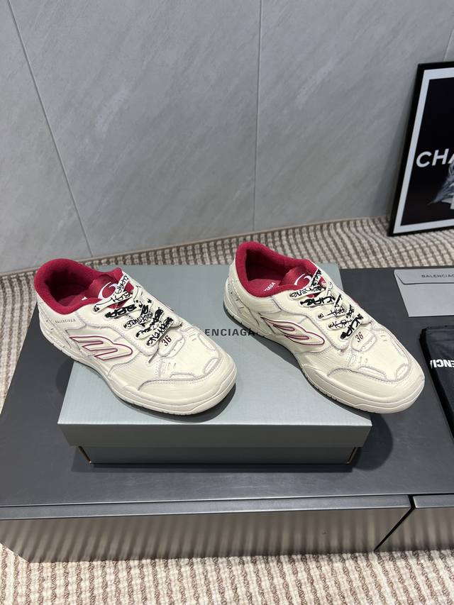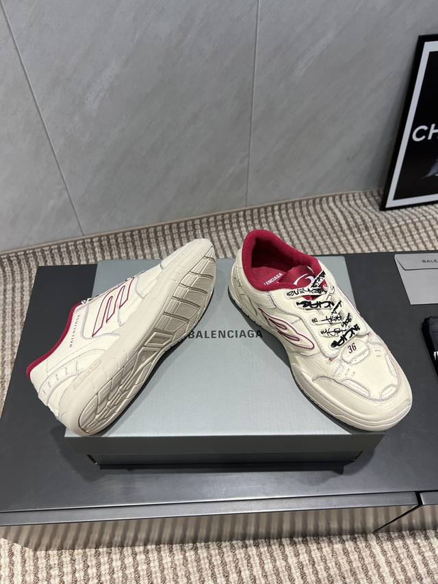 Original purchase and development, one-to-one production Balenciaga 3Xl Sneaker The overall shoe shape draws inspiration from the Balenciaga Track and Balenciaga Runner shoes, which is equivalent to removing the outer frame of the Track shoe while inheriting the Runner's streamlined shape and the Track's flat toe. A pair of tied shoelaces are added to the front of the shoe for concave shape