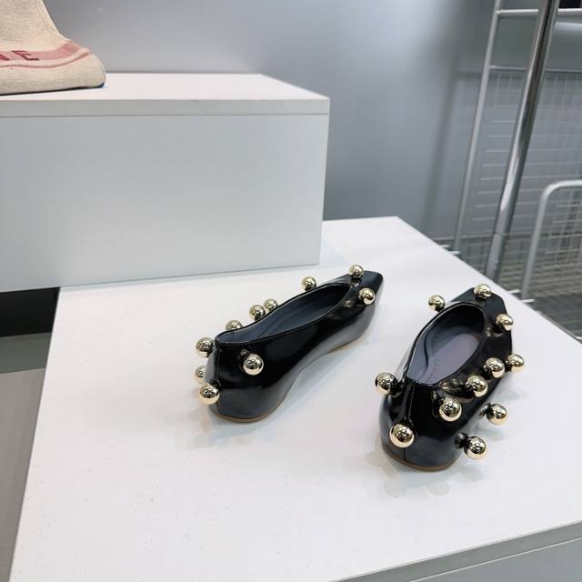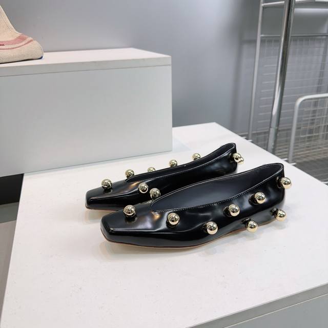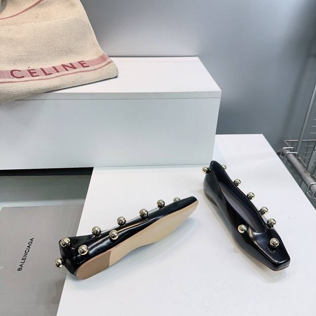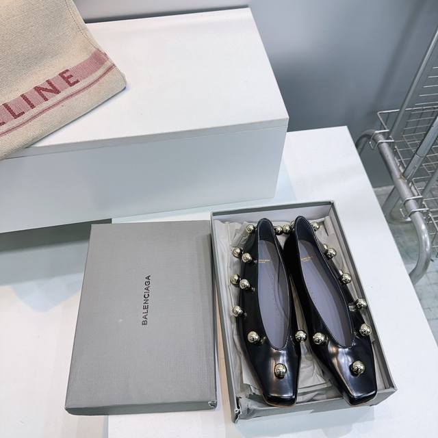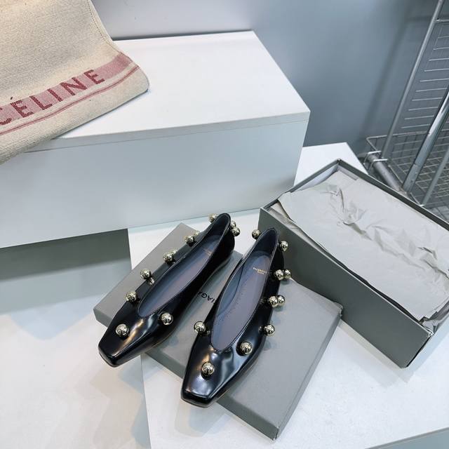 High-quality factory! Top-quality Balenciaga 26SS Spring/Summer new runway style metal studded biker punk ballet flat Mary Jane shoes with beaded sole and square toe. Made of glossy cowhide leather with metal stud embellishments; studding is a common decorative technique used by the brand to enhance the power and recognizability of the design. Neutral, cool, and strong, the contrast between cowhide leather and gold studs gives the shoes a modern and rebellious feel; the square toe shape has been making a comeback in recent years, emphasizing fashion and individual expression. The upper is made of imported calfskin with split edges, the insole is made of sheepskin, and the outsole is made of imported Italian genuine leather. Sizes: 35-41. Sizes 40 and 41 are custom-made and non-refundable. Comes with original packaging.