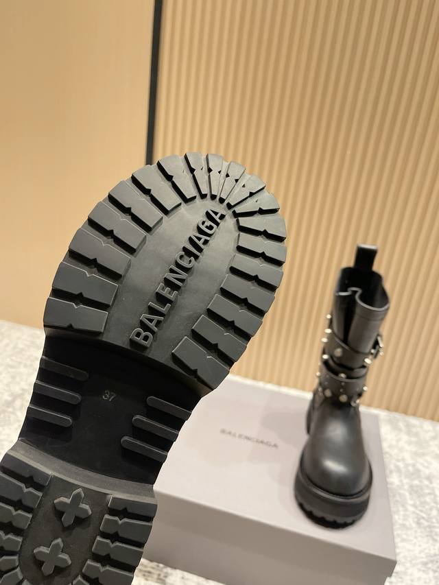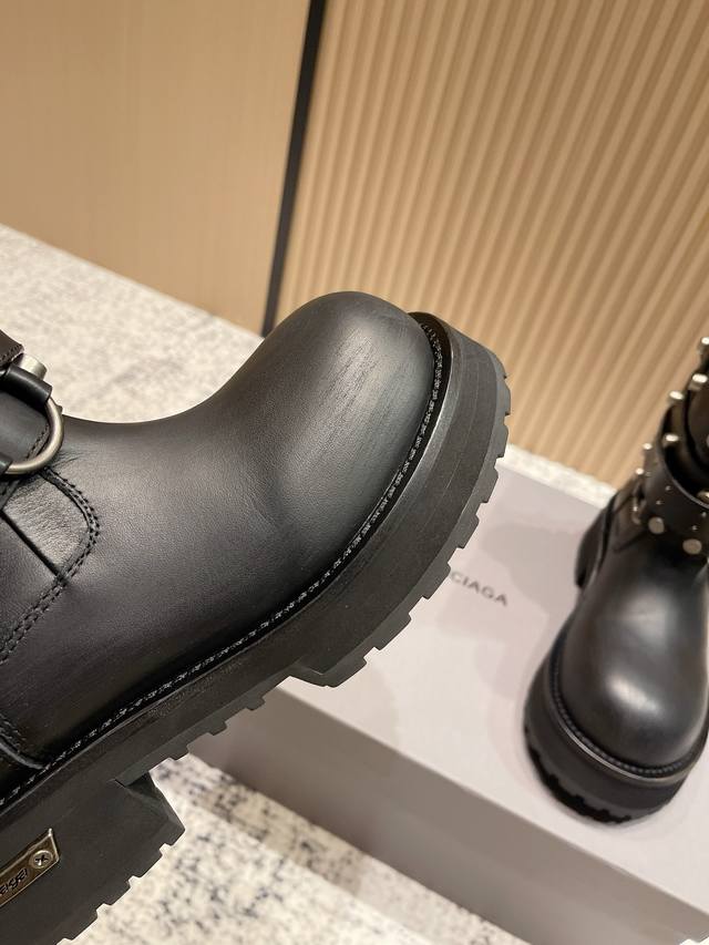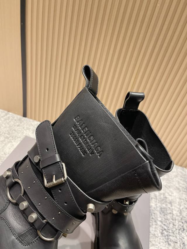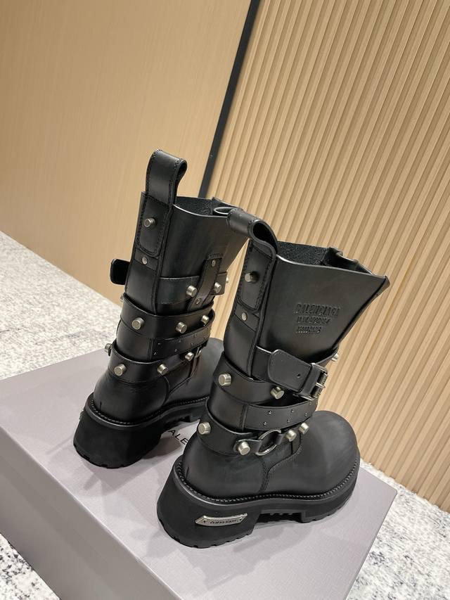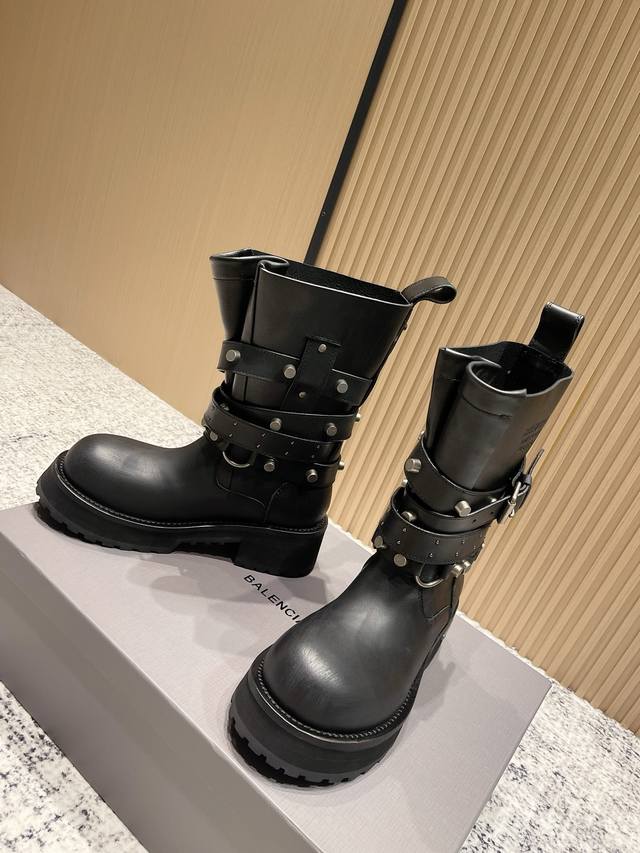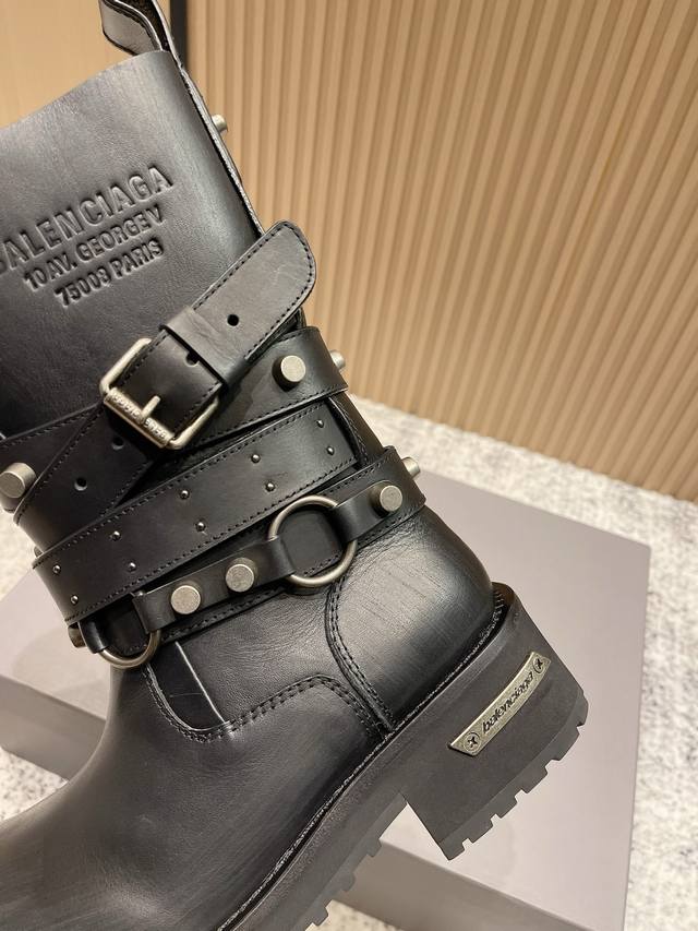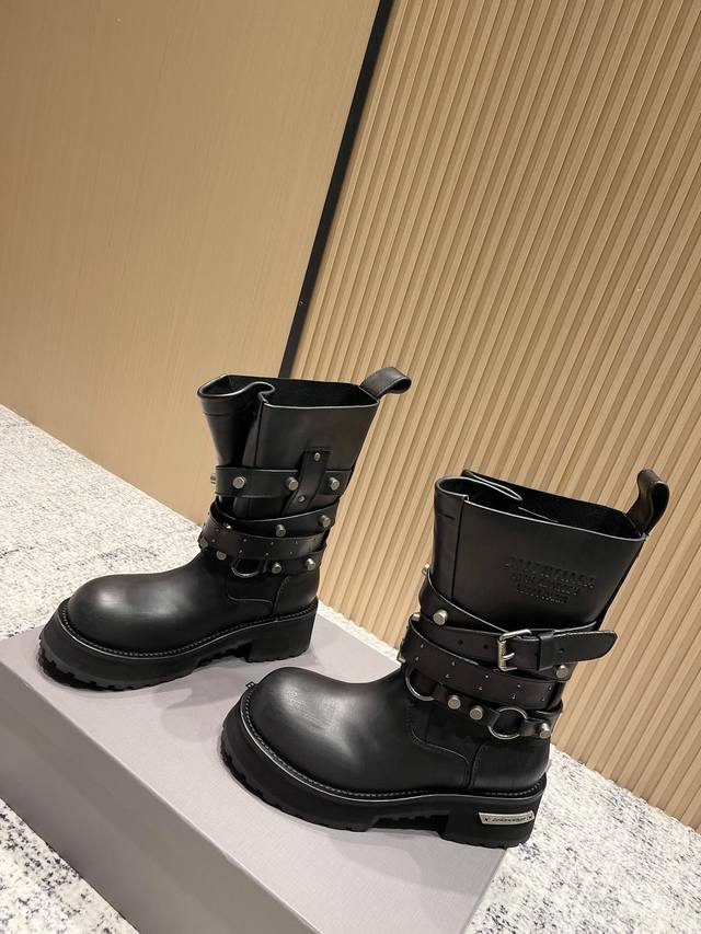 2025 Autumn/Winter New Balenciaga 25Fw Venom Mid-Calf Boots, Motorcycle Punk Style Martin Ankle Boots, Buckle, Thick Sole, Long Boots