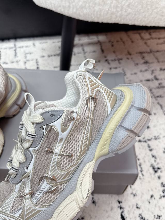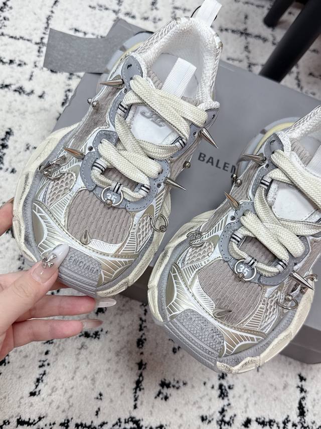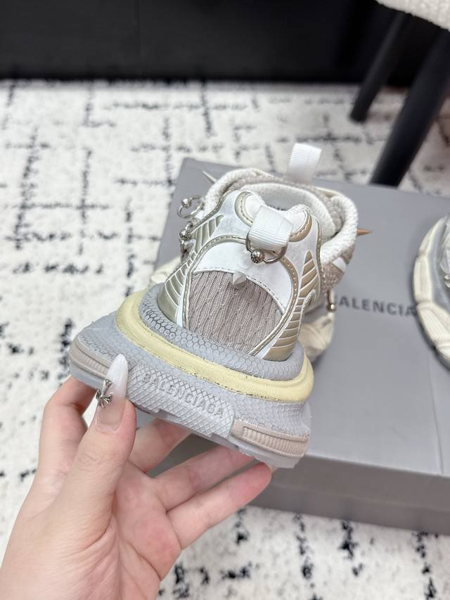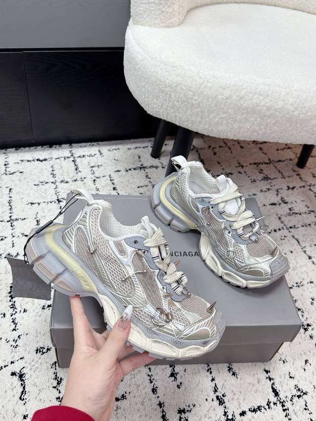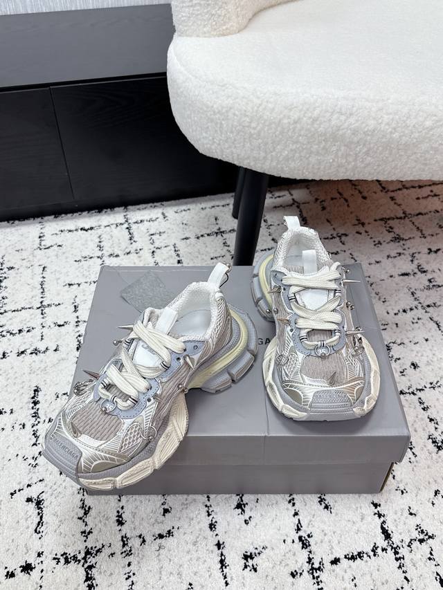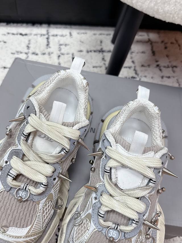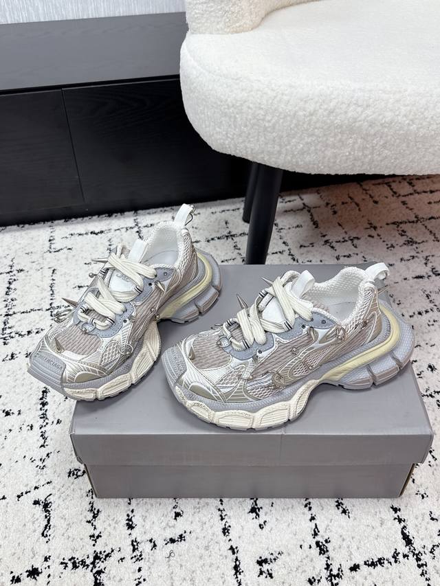Top-tier couple's version Balenciaga 3XL Sneaker, latest studded lace-up chunky sneakers. These Balenciaga 3XL studded chunky sneakers feature a retro design with metal studs, perfectly blending futuristic and retro styles. The upper is made of mesh and leather, offering breathability and support. The platform sole adds approximately 4cm in height, making legs appear slimmer! The wrap-around laces add a touch of personality, easily complementing everyday wear or streetwear. Size: #35-45 (Women's 40, Men's 45, custom-made).