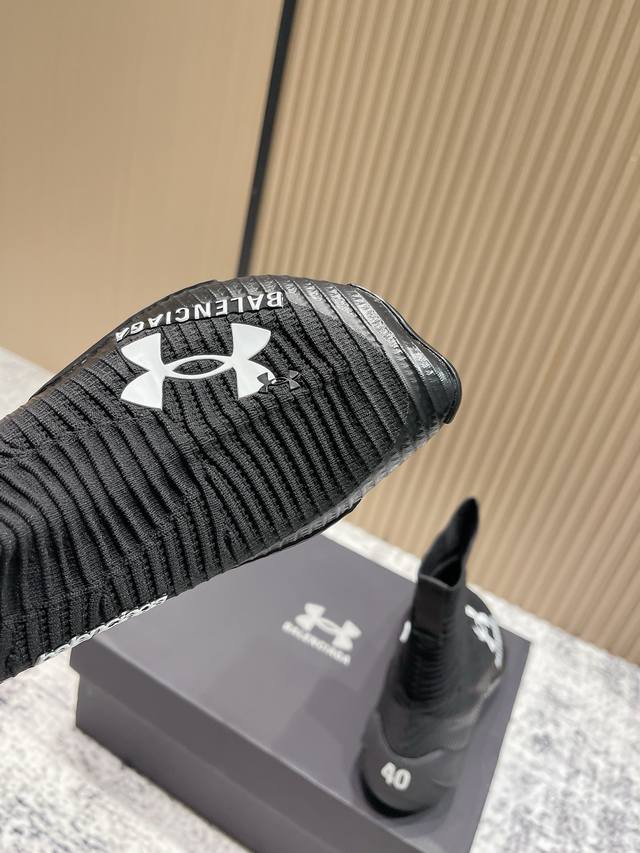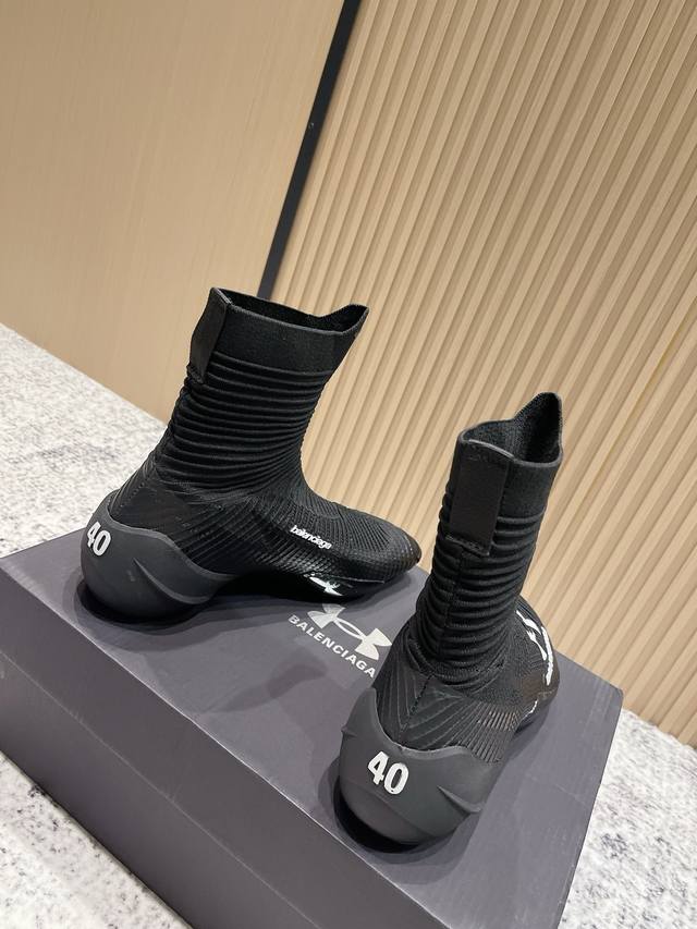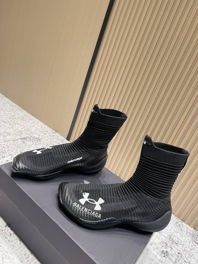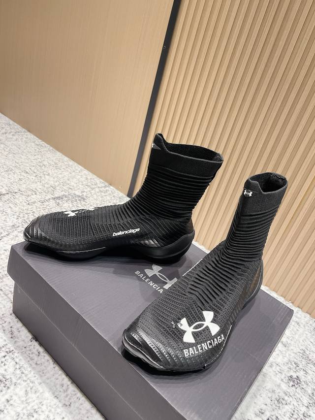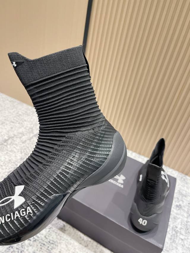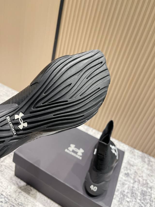 Top-tier version: Couple's pair of Balenciaga and Under Armour 2025 collaboration sock shoes. The Balenciaga and Under Armour capsule collection is a bold collaboration between a high-end luxury brand and a sportswear brand. This collection includes oversized hoodies, shorts, and modern accessories, embodying the fusion of high fashion and sportswear. Very lightweight and fits the foot perfectly; should be a very comfortable style. [Smiling face emoji] The black and white color scheme is very sophisticated! Upper: Original custom-made Flyknit epoxy resin process. Sole: Exclusive private mold rubber PU combination outsole. Size: Women's 35-40, Men's 39-45. Sizes 40 and 45 are custom-made and non-refundable.