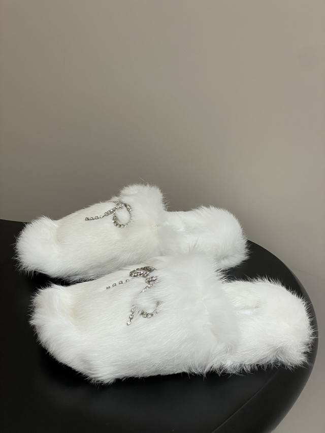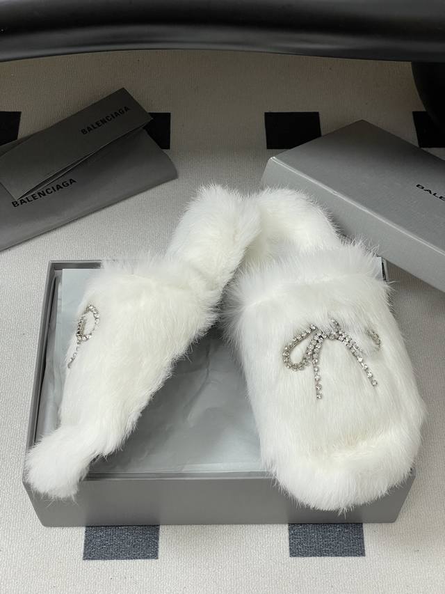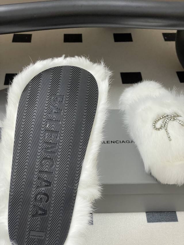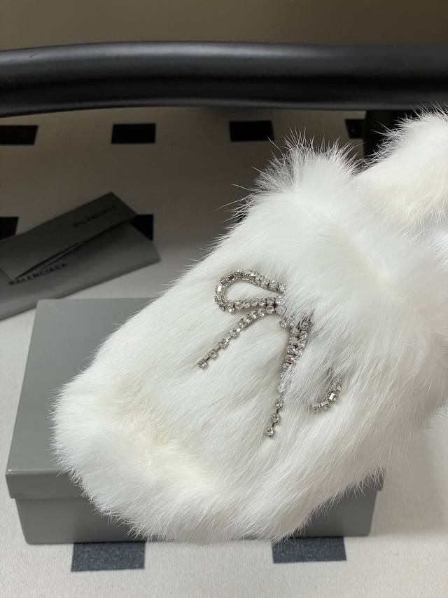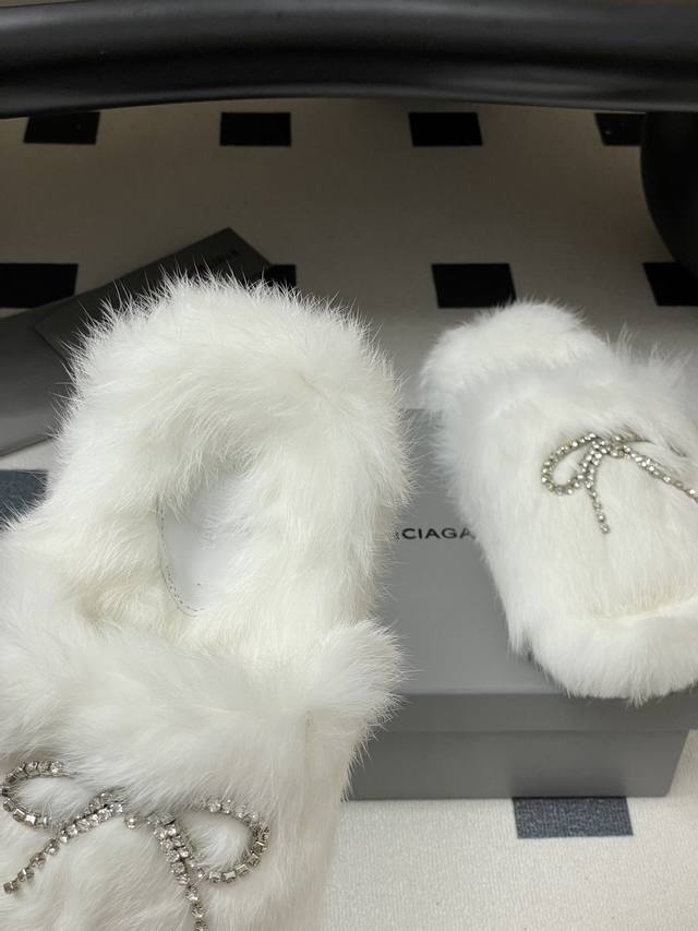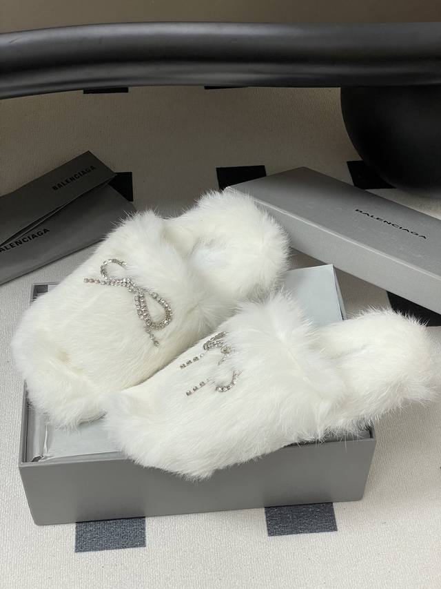 25S Autumn/Winter New Balenciaga Crystal Rhinestone Bow Chain Fur Slippers, Thick-Soled Rabbit Fur Sandals. How can you not love these fashionable fur sandals! They fit the current trend of a relaxed style, making walking more comfortable and casual. The upper features an exquisite rhinestone bow design; the sparkling rhinestones instantly make the shoes glamorous, adding highlights to the overall look and enhancing the sense of luxury and sophistication. These sandals are both casual and glamorous, easily matching various fashionable styles. Upper: Rabbit fur; Sole: Original mold TPU outsole; Sizes: 35-39, 40.41 (Made to order, no returns or exchanges).