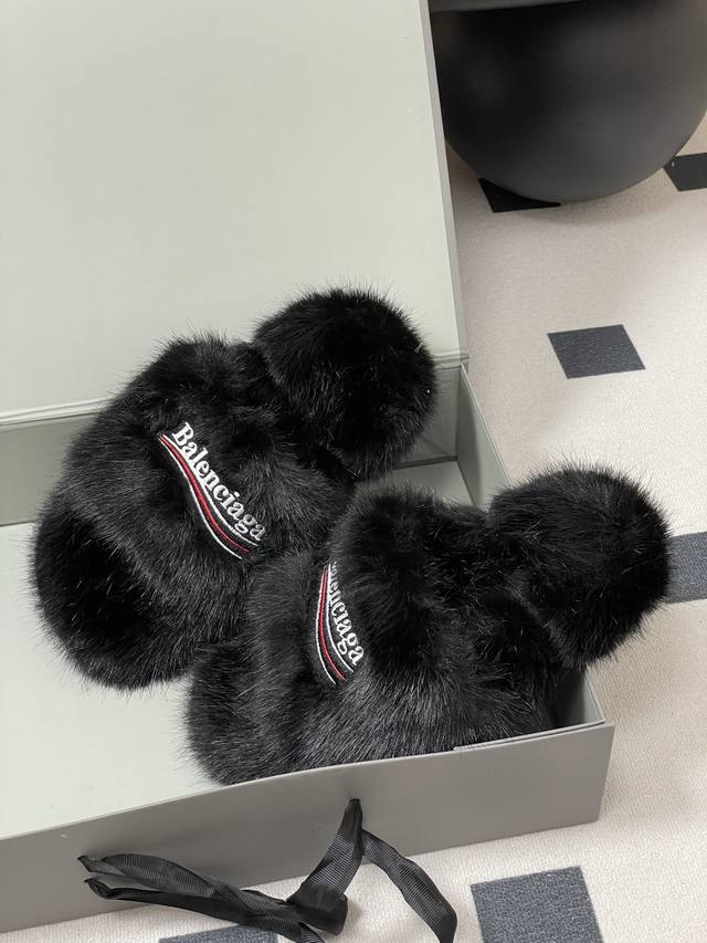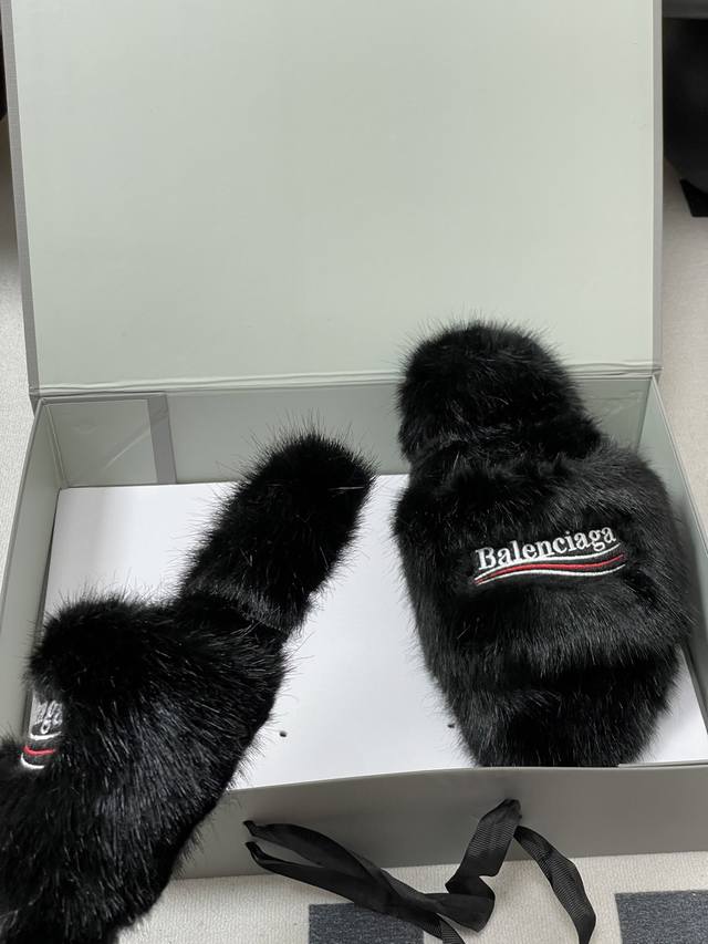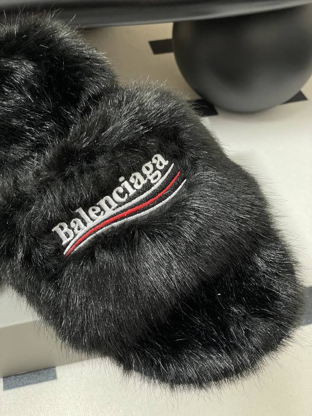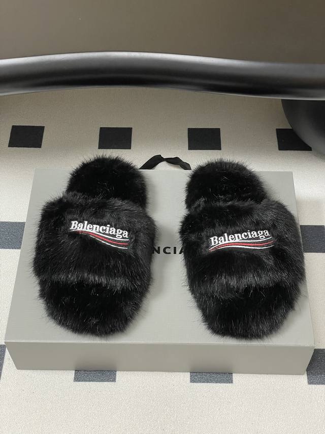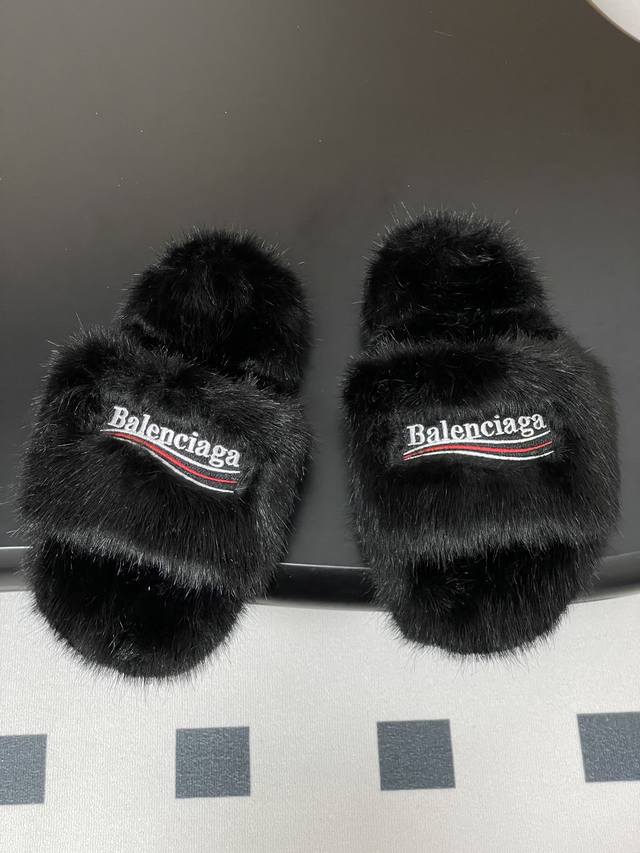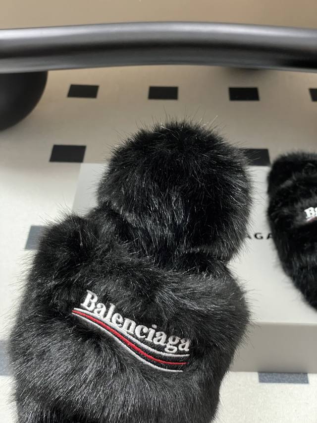 25S Autumn/Winter New Balenciaga Latest Letter Embroidered Furry Slippers, Thick-Soled Rabbit Fur Slippers