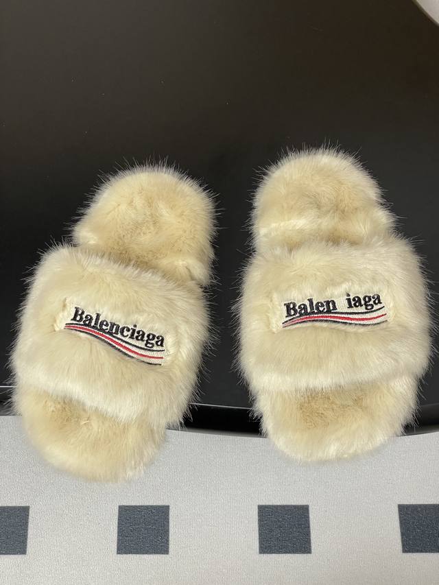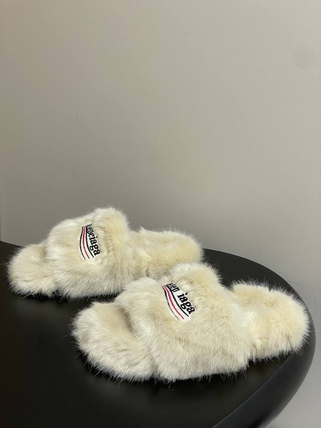 25S Autumn/Winter New Balenciaga Latest Letter Embroidered Furry Slippers, Thick-Soled Rabbit Fur Sandals