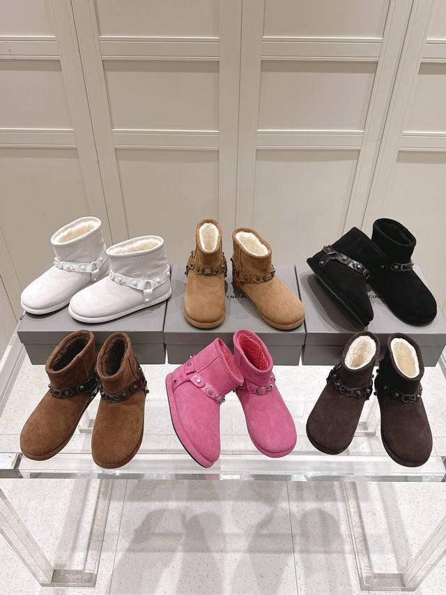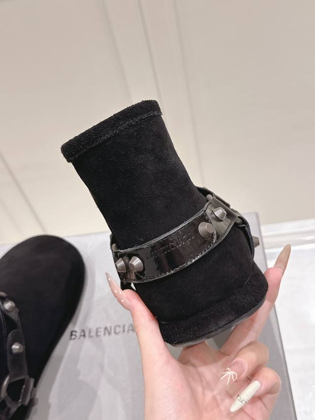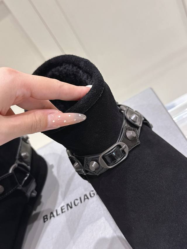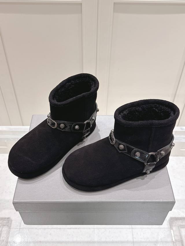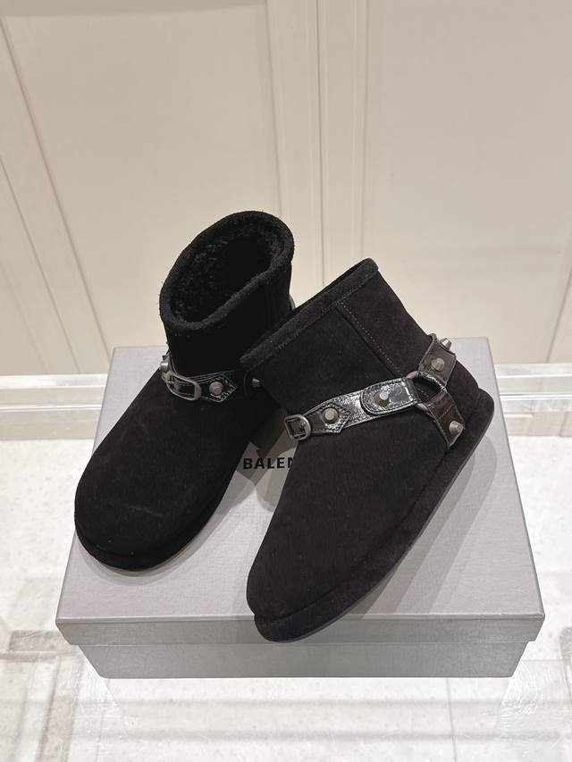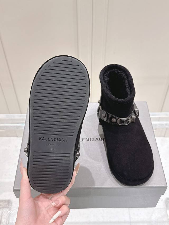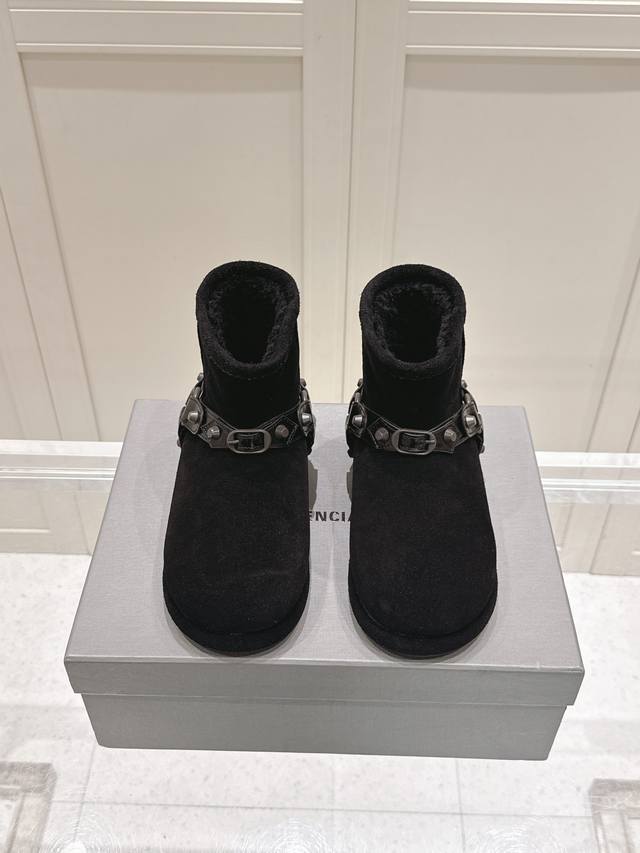 Balenciaga 2025 Fall/Winter New Belt Buckle Rivet Snow Boots. A captivatingly chic aesthetic. Breaking away from the traditional dullness of snow boots, the clean lines avoid bulkiness. Rivets and belt buckles add a touch of high-end street style, ensuring you're always on the cutting edge of fashion. The upper is made of silky cow suede, with a delicate touch and a subtly luxurious sheen. The 100% pure wool lining is lightweight and warm, making you feel like you're walking on clouds. The rubber outsole is slip-resistant and durable, allowing for worry-free walking even in wet and cold winters. Available in chestnut, black, white, brown, pink, and dark brown. Sizes 35-40, designed for those who appreciate quality and style. This winter, prioritize both warmth and style.