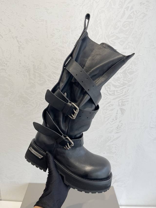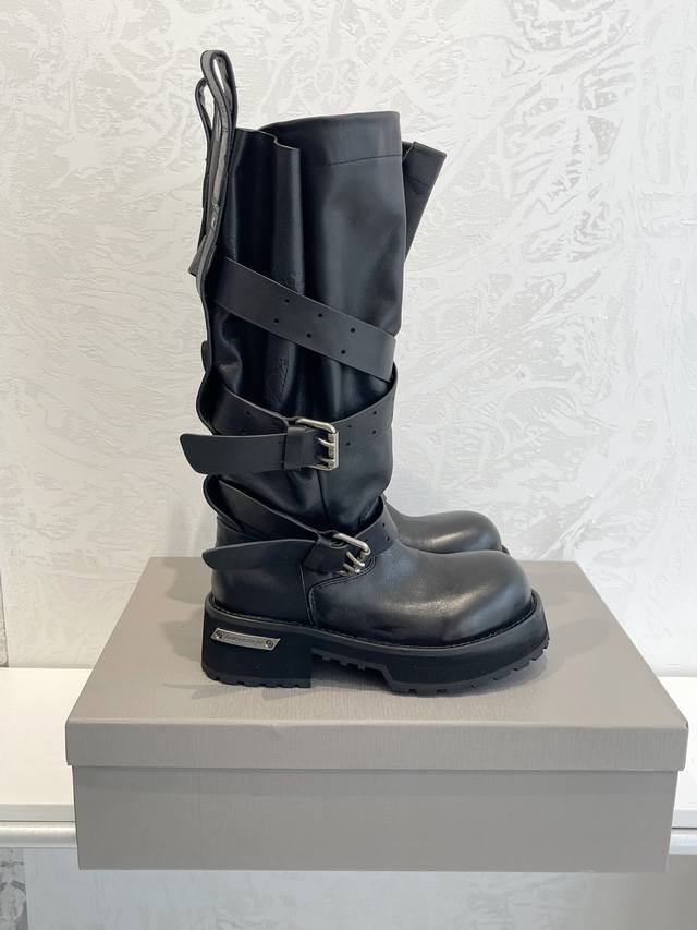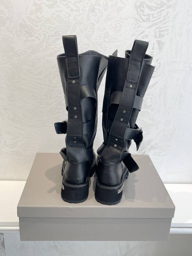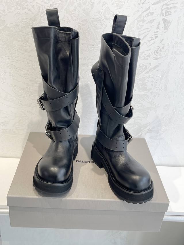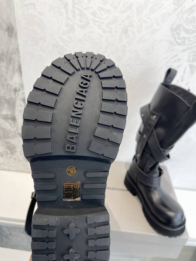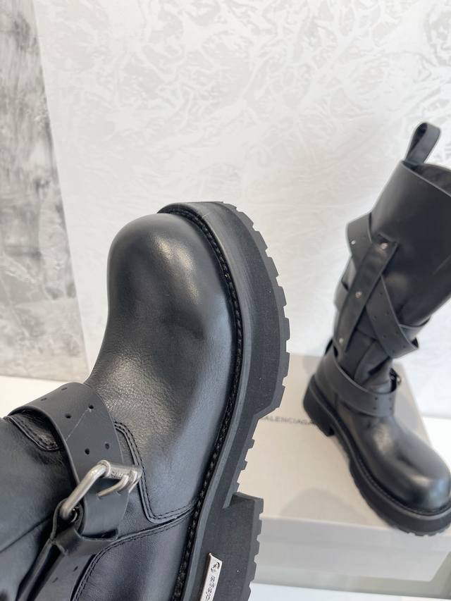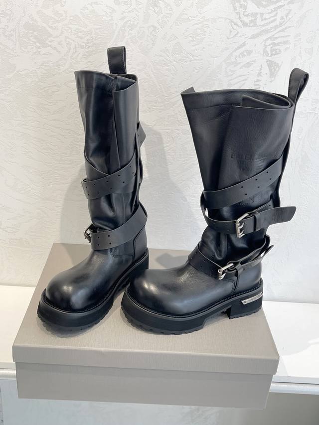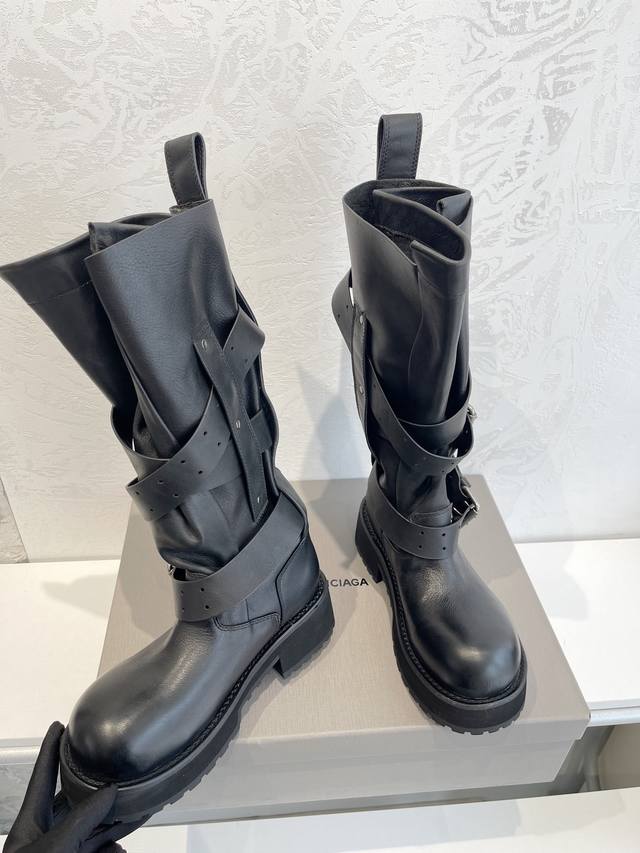 Factory Direct Sales Balenciaga Venom High Boots 25Fw These boots feature a unique design with laces and leather straps that not only securely fit the foot but also allow for adjustable tightness. The brand's signature distressed hardware is consistently used throughout, subtly creating a vintage, worn effect that showcases individuality. The thick, serrated rubber sole ensures comfort while enhancing the overall style and recognizability. The Venom mid-calf boots are undoubtedly a must-have fashion item this season, adding a unique charm to fashion enthusiasts' outfits and leading a new wave of trends. Upper: Top-grain cowhide with distressed finish. Lining: Imported water-dyed cowhide. Outsole: Original molded genuine leather welt combination, outsole thickness 5cm. Sizes: 35-40.