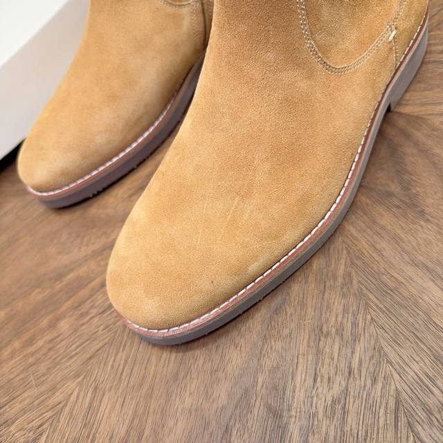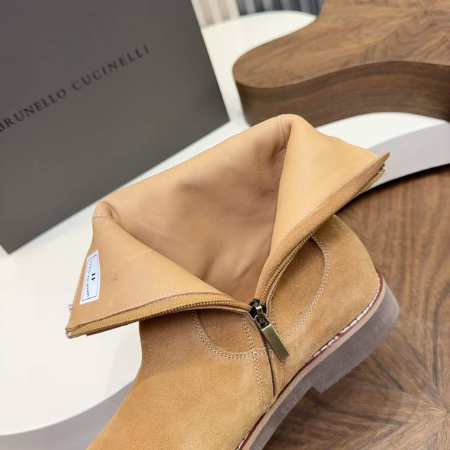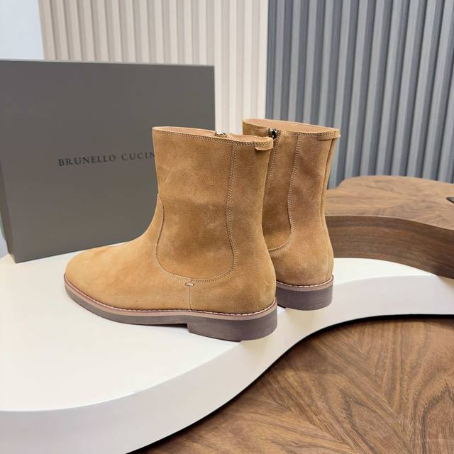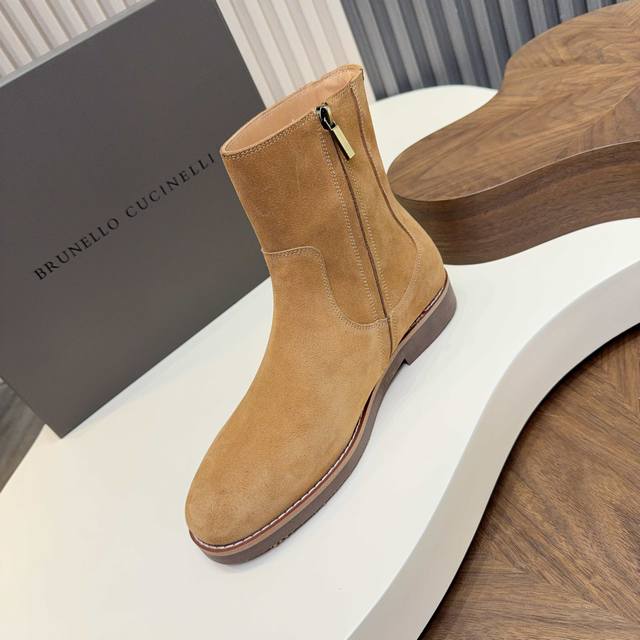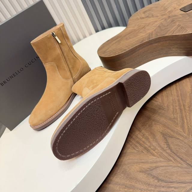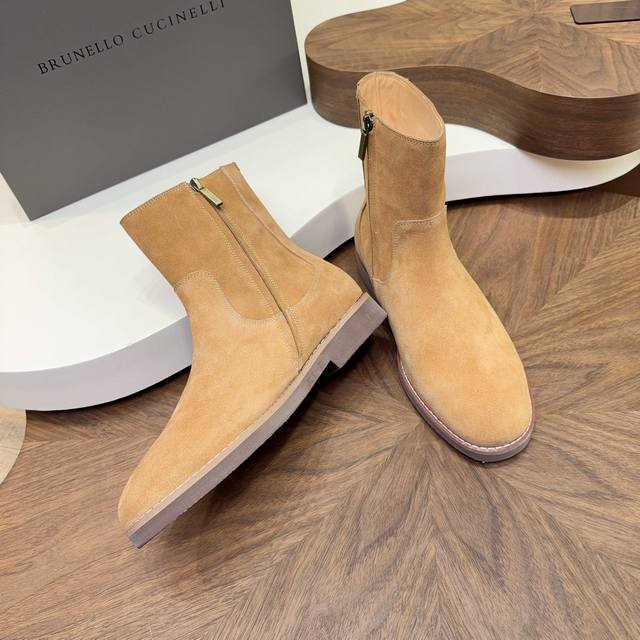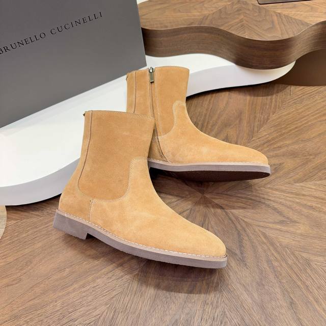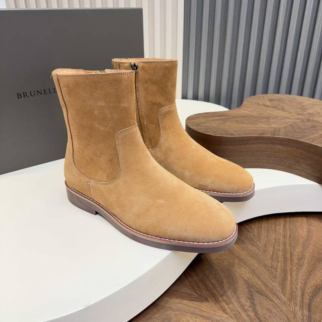 2025 Brunello Cucinelli Suede Chelsea Boots are made with high-quality top-grain calfskin, soft and delicate, with a superb texture. The classic elastic side design makes them super easy to put on and take off, conforming to the foot shape for comfort and style. The thickened rubber sole is non-slip and wear-resistant, making them perfect for autumn and winter wear. The warm brown color is understated and versatile, easily matching jeans and dress pants, suitable for both business and casual occasions! With Goodyear welt construction, they are durable and textured, a must-have classic item in any wardrobe, always a safe bet.