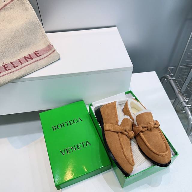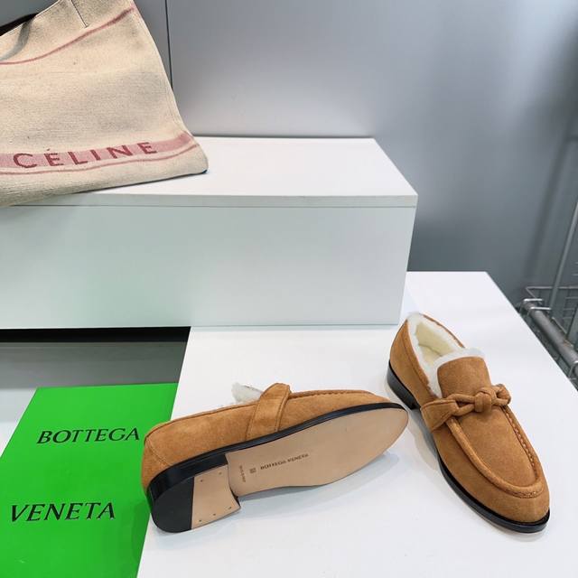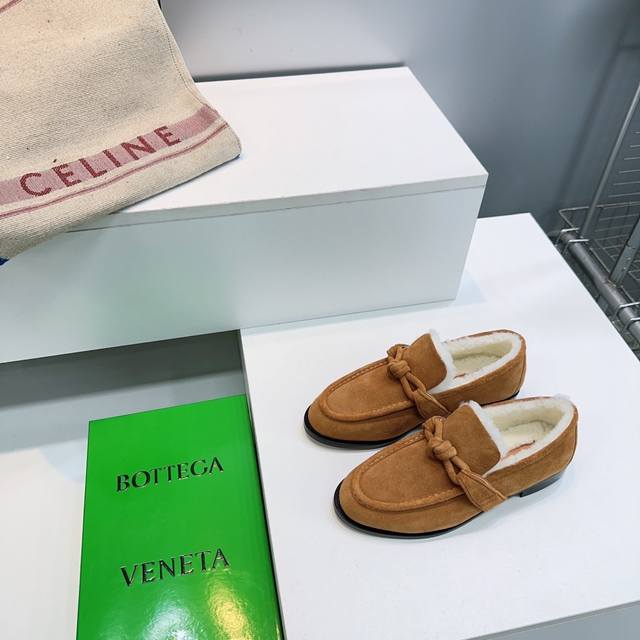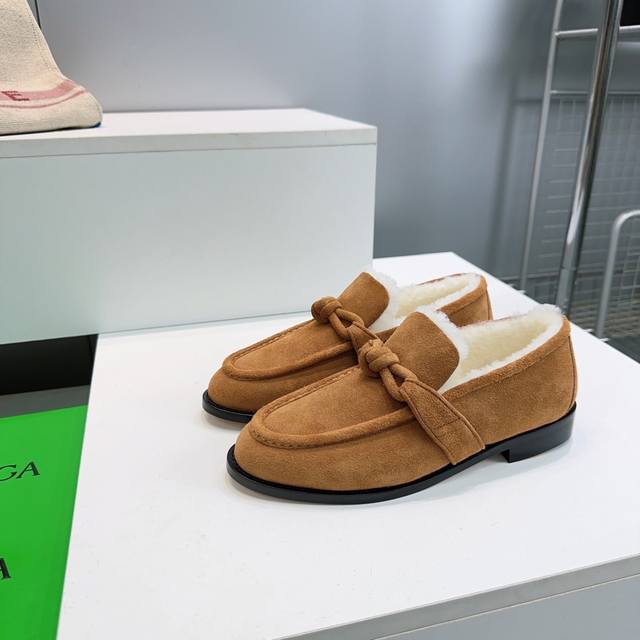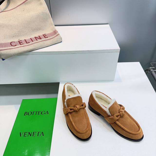 High-quality factory release! Top-quality Bottega Veneta Fall/Winter 2025 new arrival cable knit metal buckle unisex retro loafers! Warm wool fleece shoes! Top-tier version with the iconic metallic knot design, perfectly capturing the old-money style! Imported cow suede upper, imported lamb wool lining, Italian imported original color thickened genuine leather outsole. Sizes: 35-42. Orders of 40, 41, and 42 are non-refundable and non-exchangeable. Comes with original packaging.