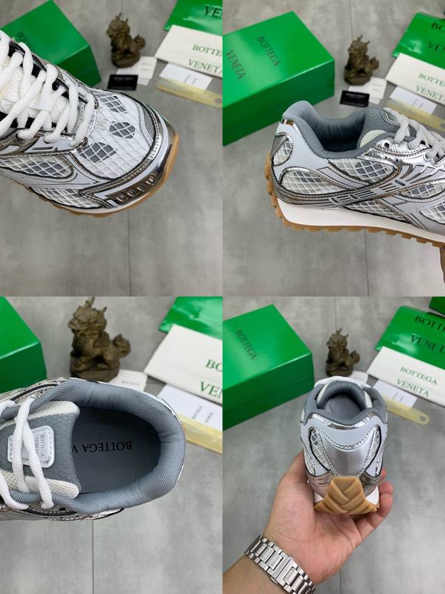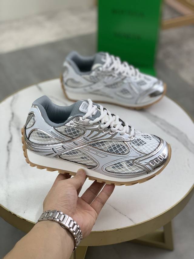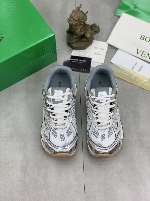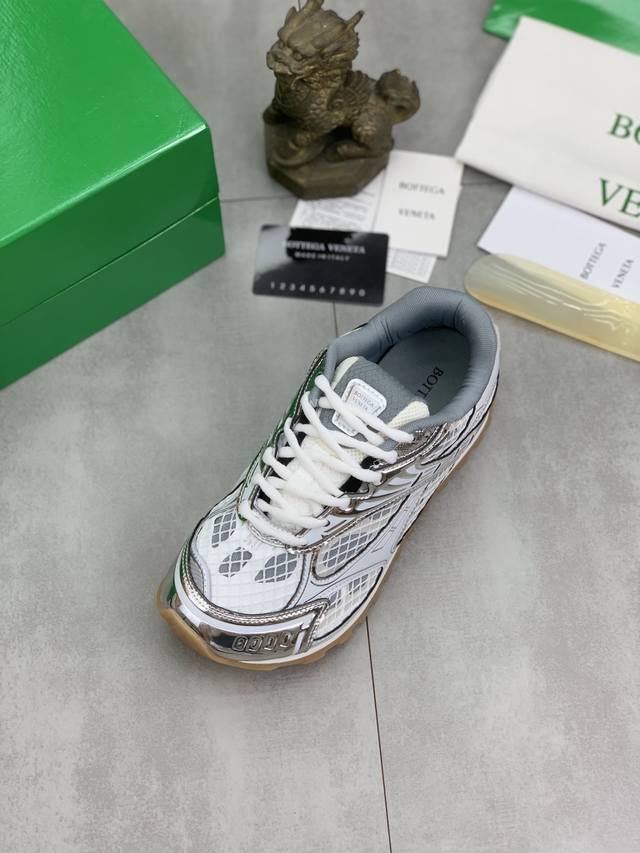 Factory direct price for men's sports shoes, original Bottega Veneta Orbit sneakers, couple style. Inspired by the silhouette of 90s sneakers, this shoe features a mesh texture and a cross-over upper made of different materials, undoubtedly paying homage to the brand's famous Intrecciato pattern. The sole is also slender and elegant, extending to the heel, cleverly combining athletic elements and fashion inspiration. Made with lightweight technical metal leather and mesh fabric. Women's sizes 35-40 (40 custom-made). Men's sizes 39-45 (45 custom-made). Comes with original packaging.