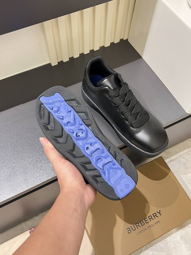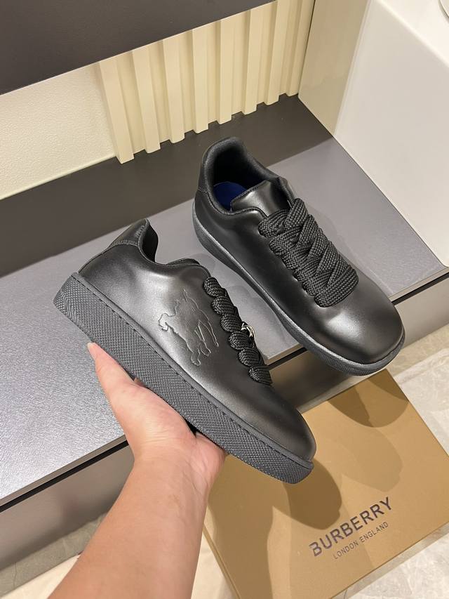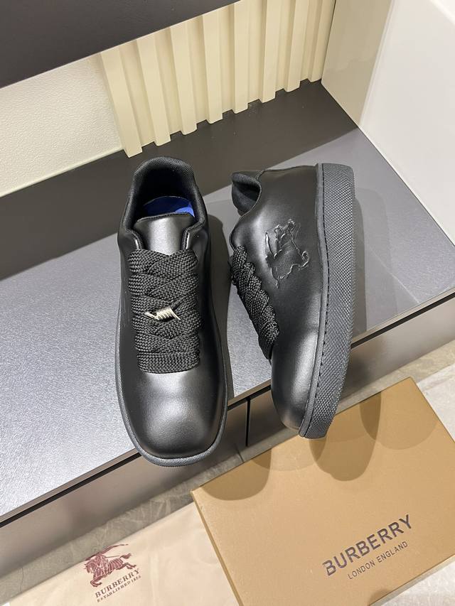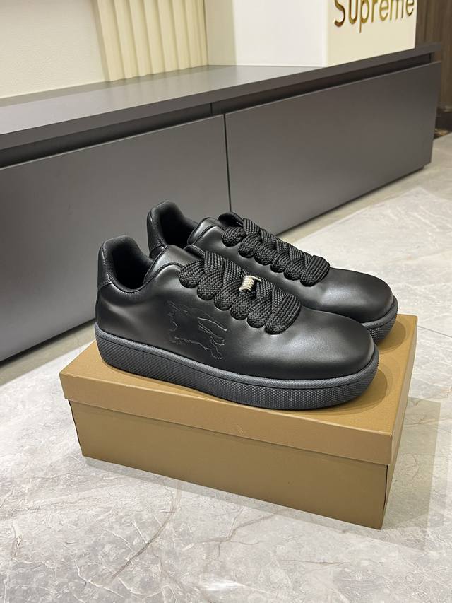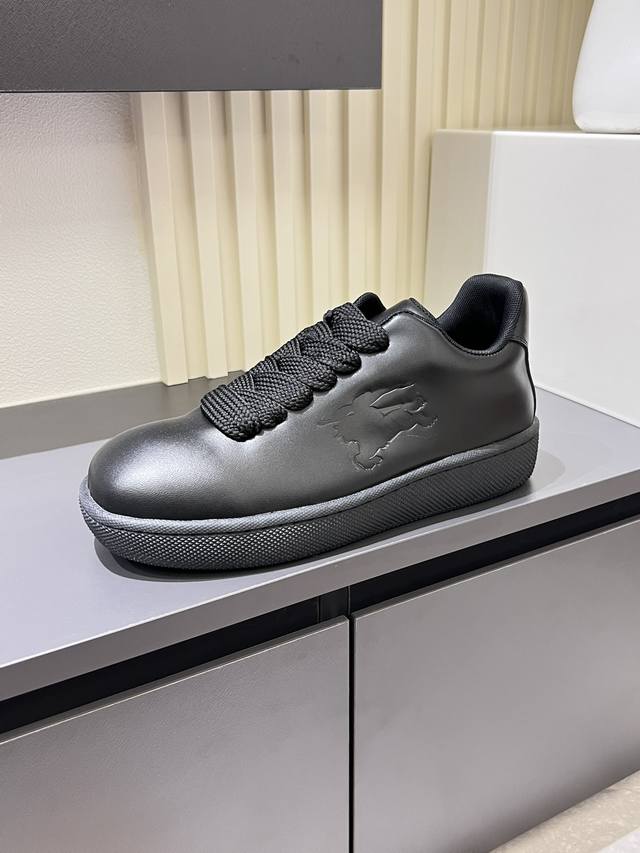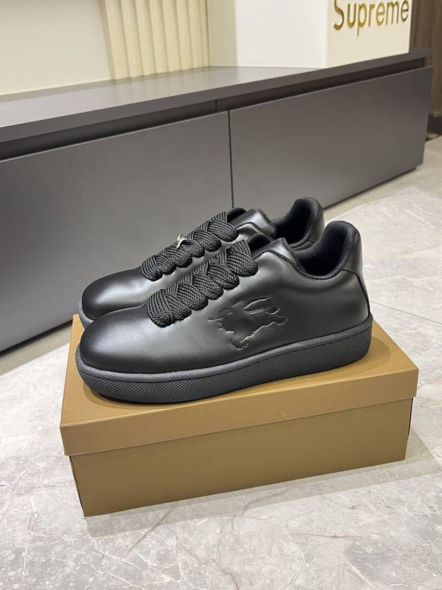 Burberr* New men's platform casual sneakers, trendy and cool sneakers, developed from original stock, top-tier version of the Box series sneakers, crafted from smooth calfskin leather, adorned with an embossed equestrian rider logo (Ekd). Features a mesh lining, laces with metal coil details, a rubber outsole embellished with the iconic Burberry logo, and an original 3.5cm two-tone TPU outsole! Men's sizes 38-44, 45 custom-made.