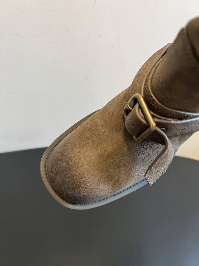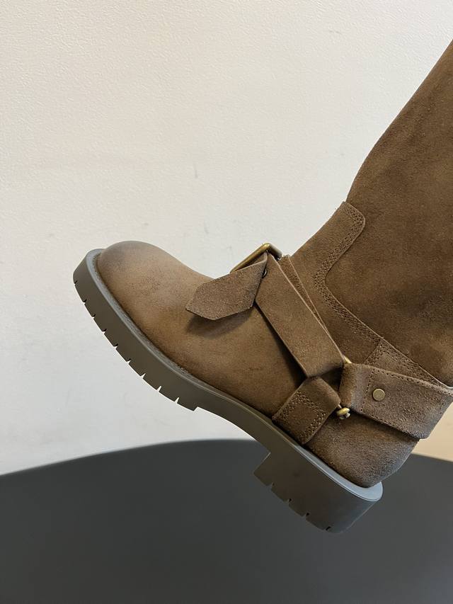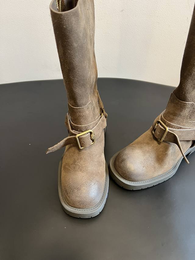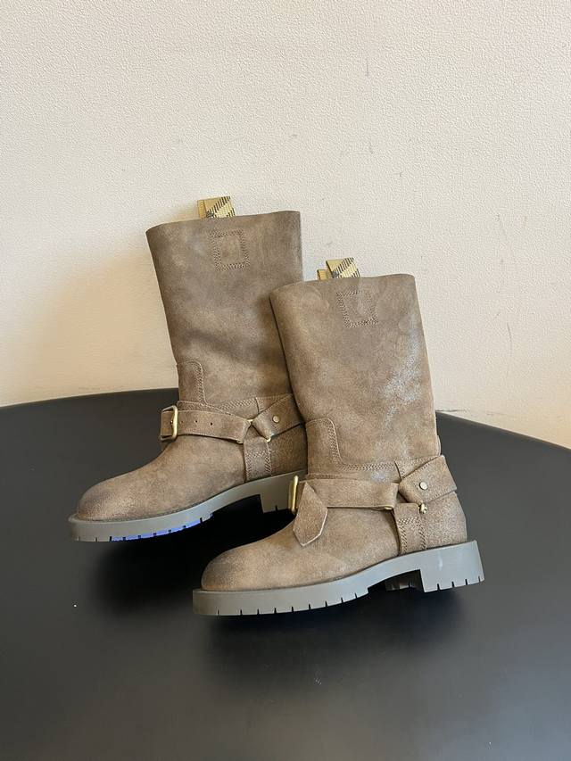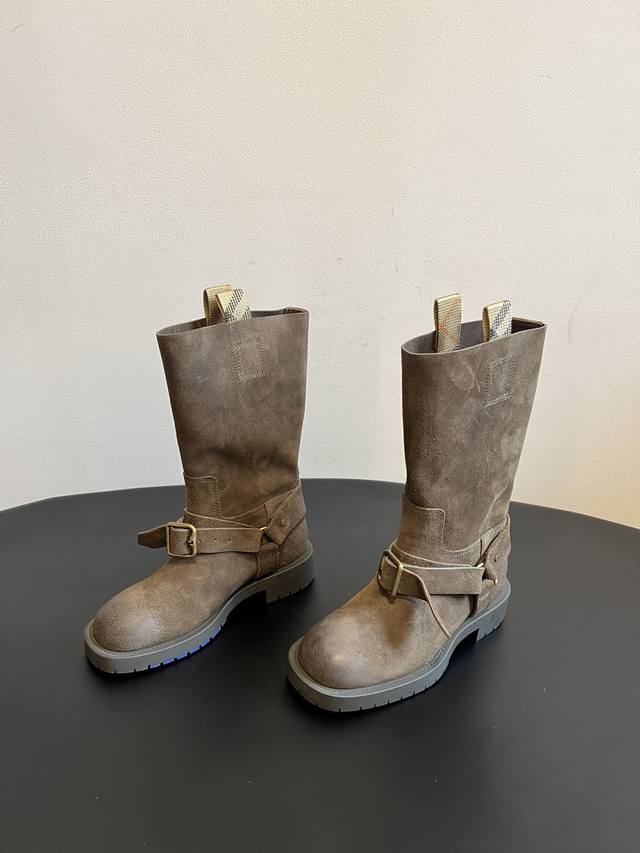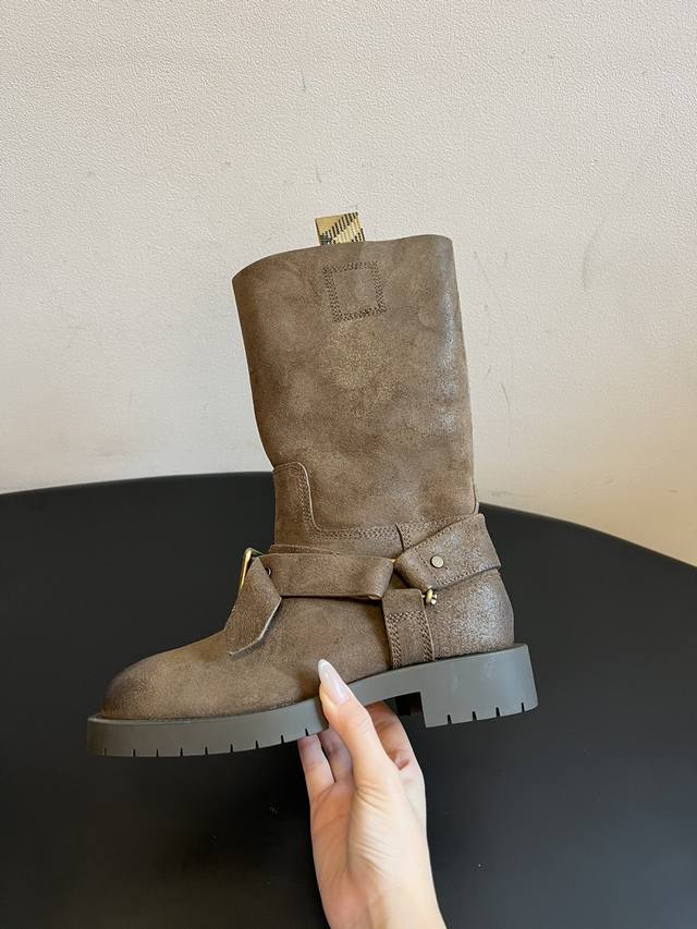 Burberr*25Ss Retro Thick-Soled British Style Mid-Calf Boots DDD Made in Italy with both calfskin and suede, these boots boast a delicate and luxurious feel. The boot opening features a classic Burberry check pull tab, a highly recognizable element of the brand. DDD The sides are decorated with square stitching and a metal buckle strap engraved with the brand logo, echoing equestrian inspiration. The mid-calf boot shape and slightly wide opening accommodate different leg shapes. The thick rubber sole provides height, slip resistance, and durability, balancing comfort and style. DDD Material: Cowhide DDD Lining: Cowhide DDD Outsole: Rubber DDD Height Increase: 3.5cm DDD Size: Sizes 35-40, Size 40 is custom-made and non-refundable DDD