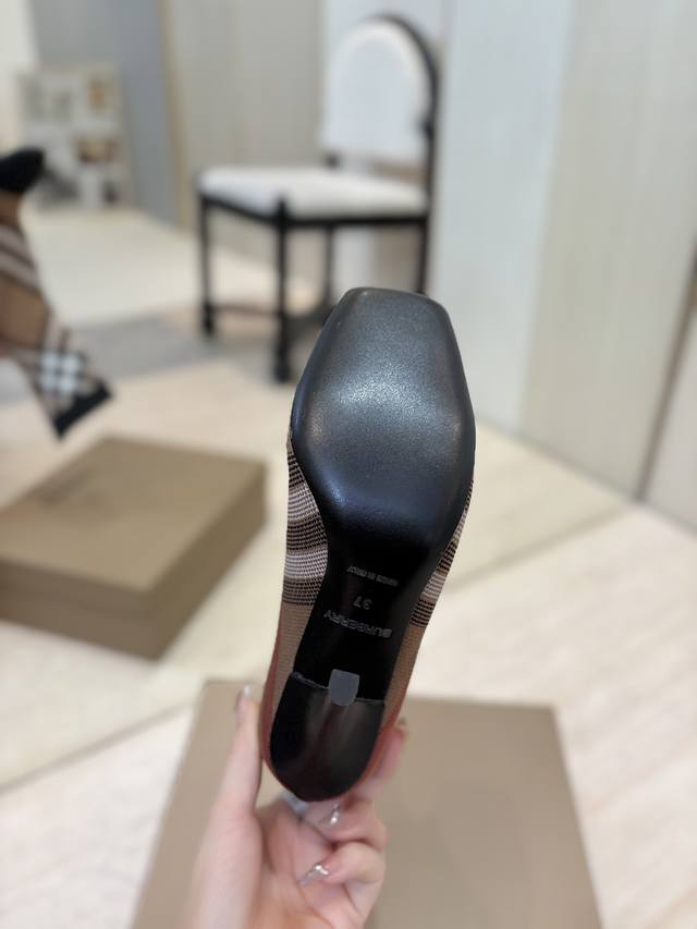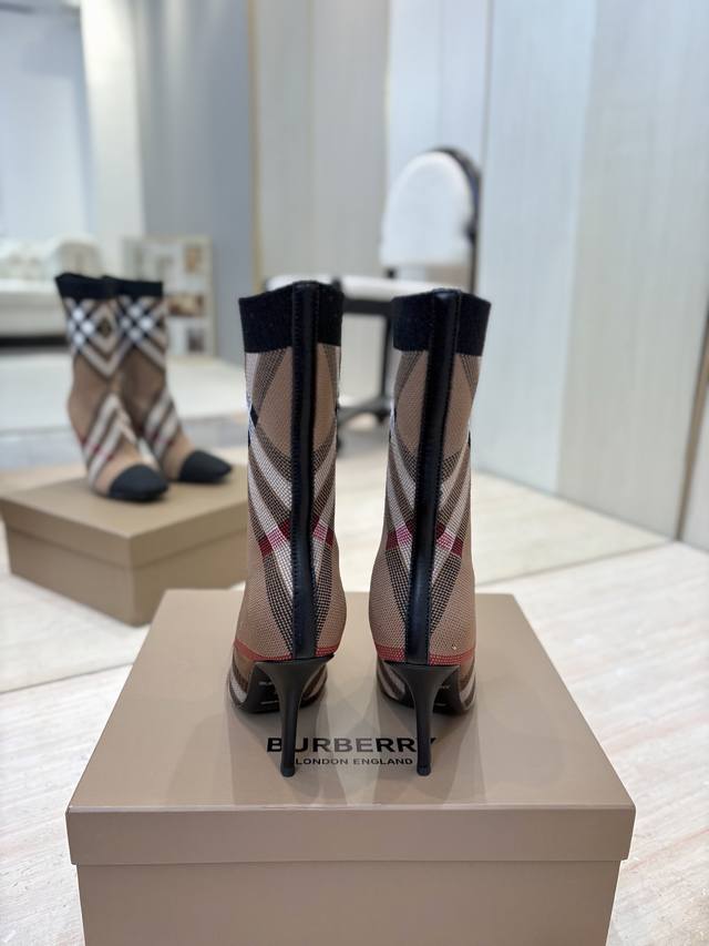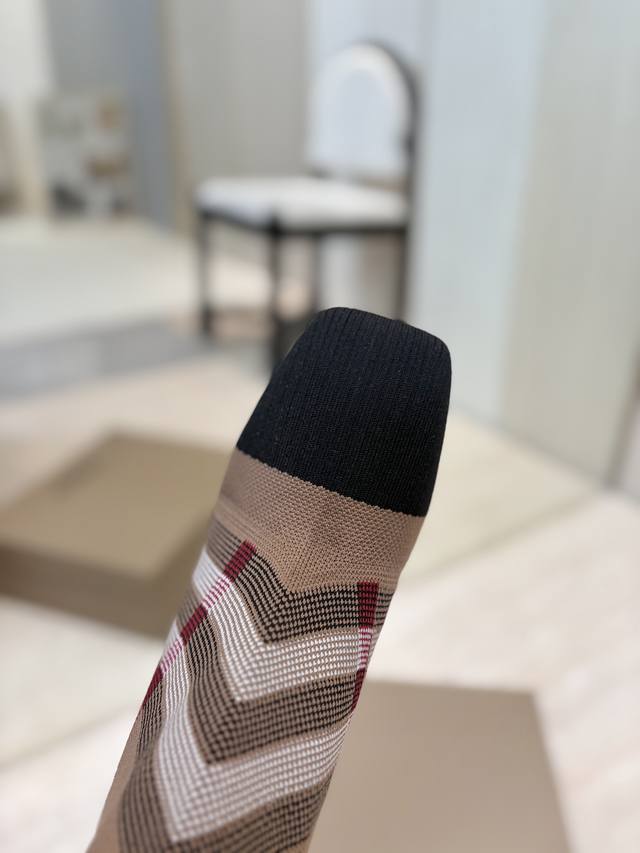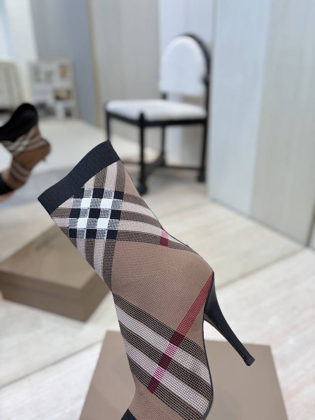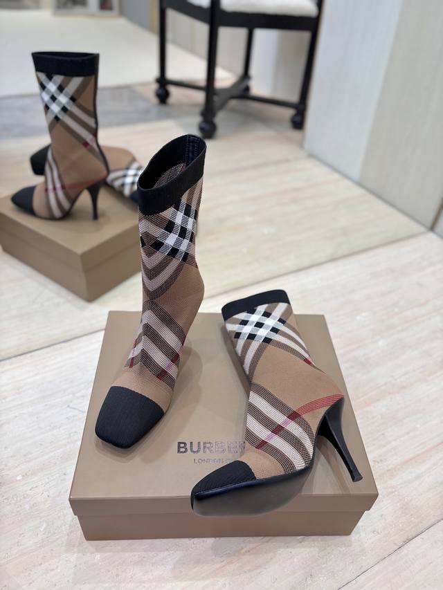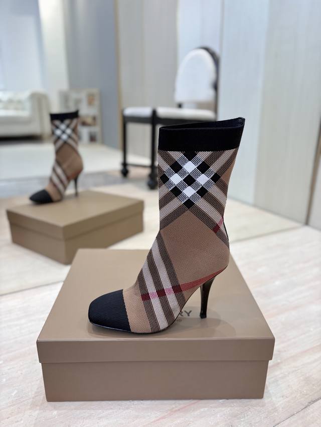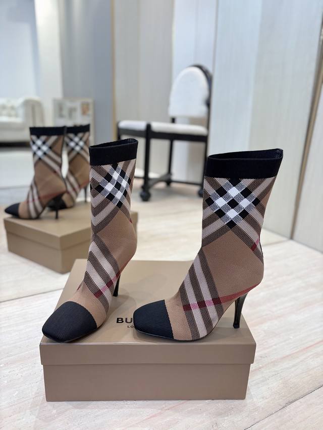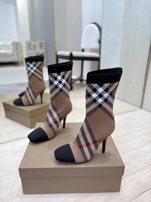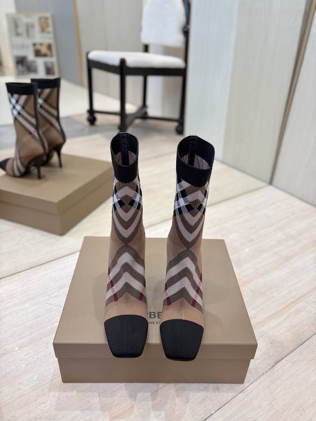 Burberry Exclusive Square Toe Stiletto Heel Check Stretch Knit Sock Boots