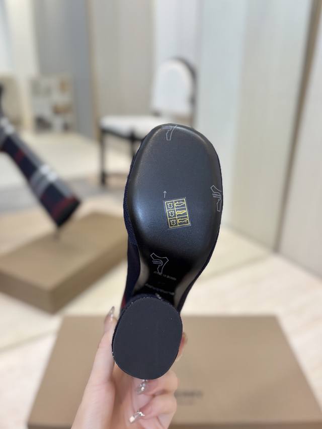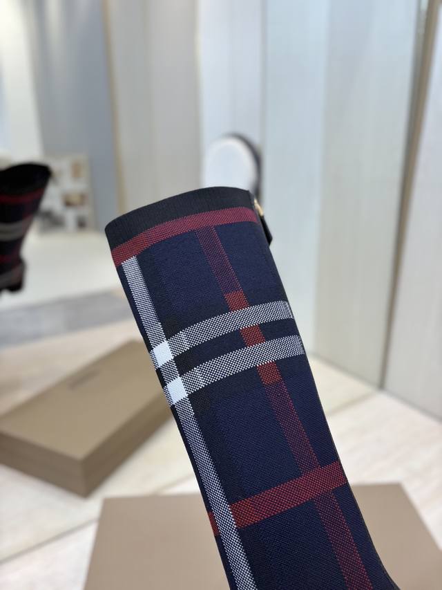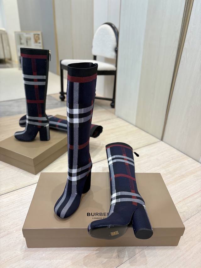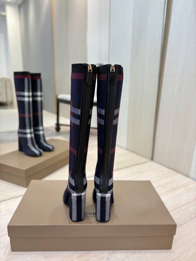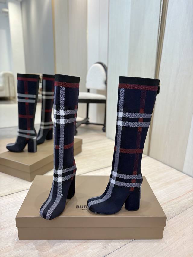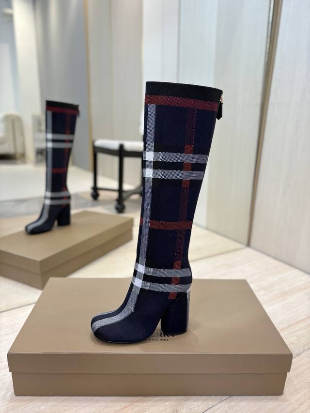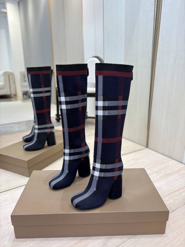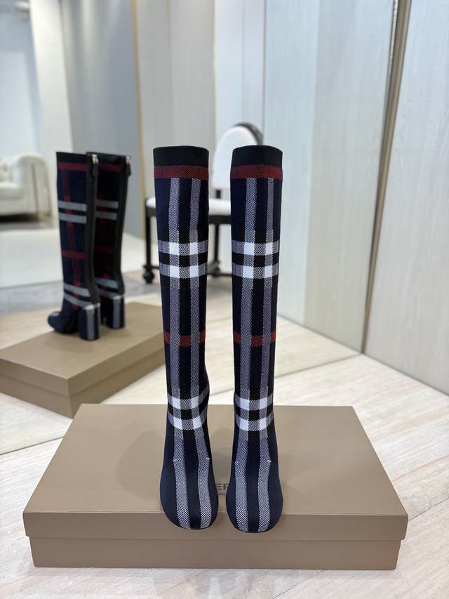 Burberry, a British luxury brand, classic beige, 1:1 replica of the original, fitted stretch knit knee-high boots, featuring a round toe, chunky heel, and the brand's signature check pattern.