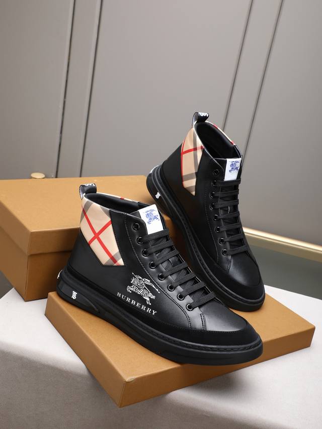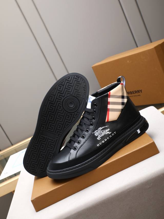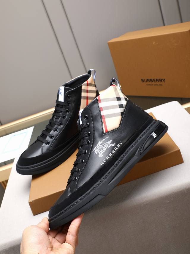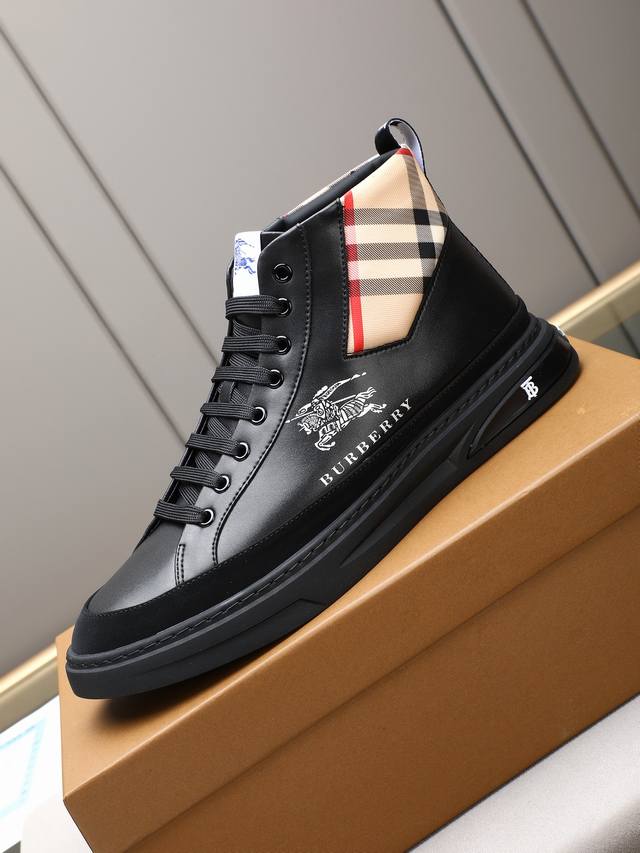 New high-top Burberry style, a top-selling high-end product from the world-renowned luxury brand. These casual men's shoes feature imported cowhide leather with a breathable sheepskin lining and a custom-cut rubber outsole for durability and lightweight comfort. The overall design is harmonious yet stylish