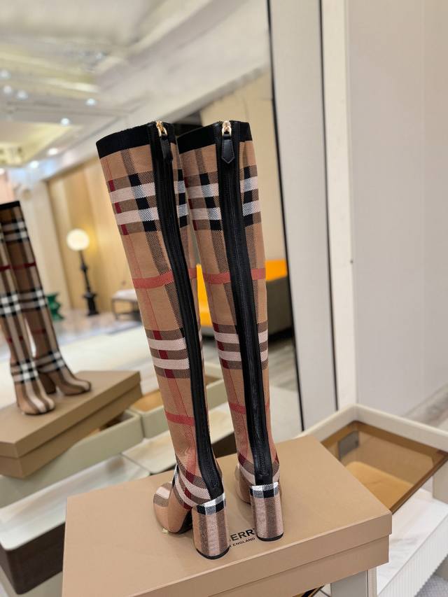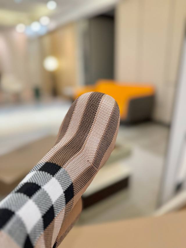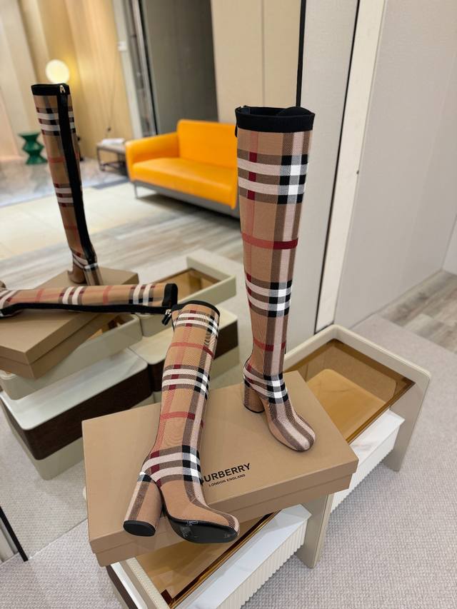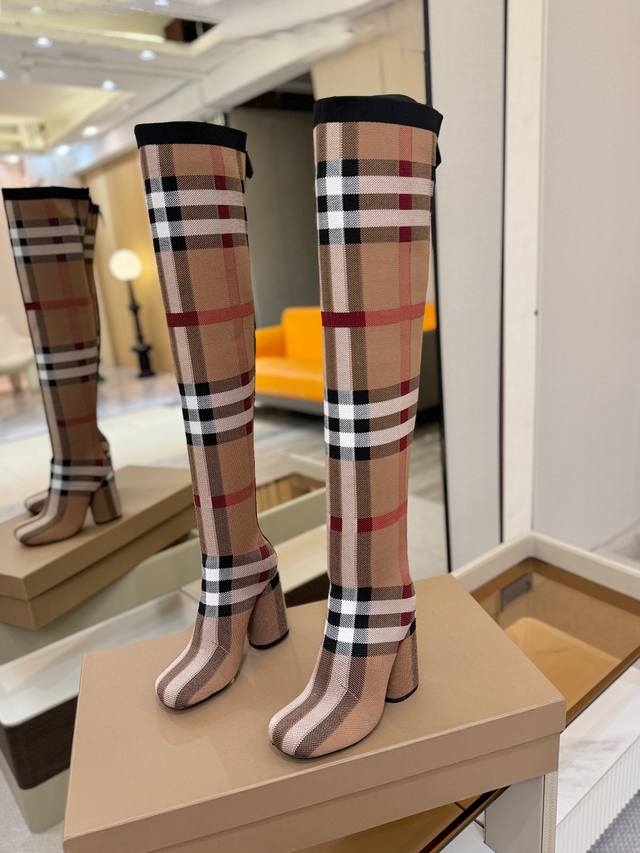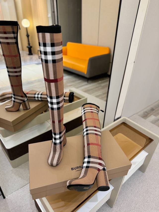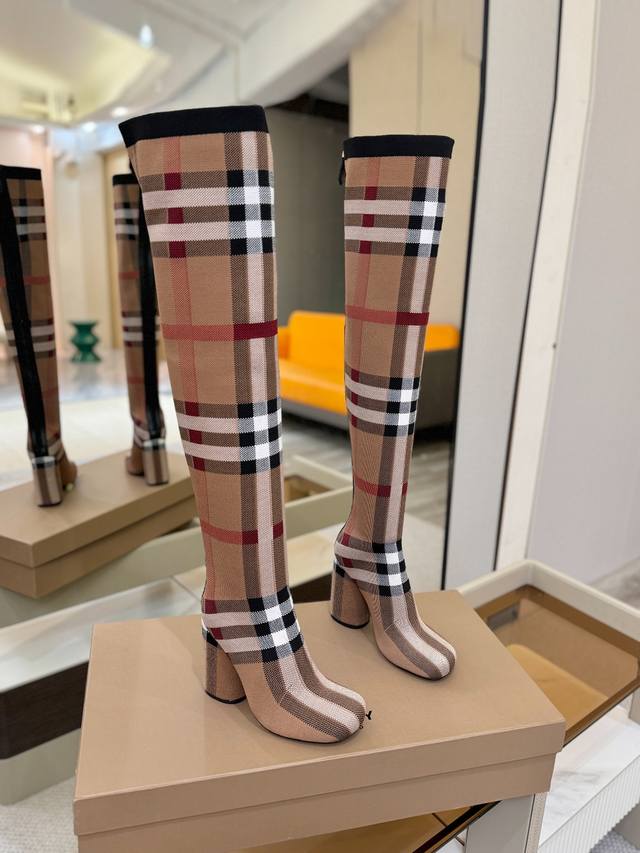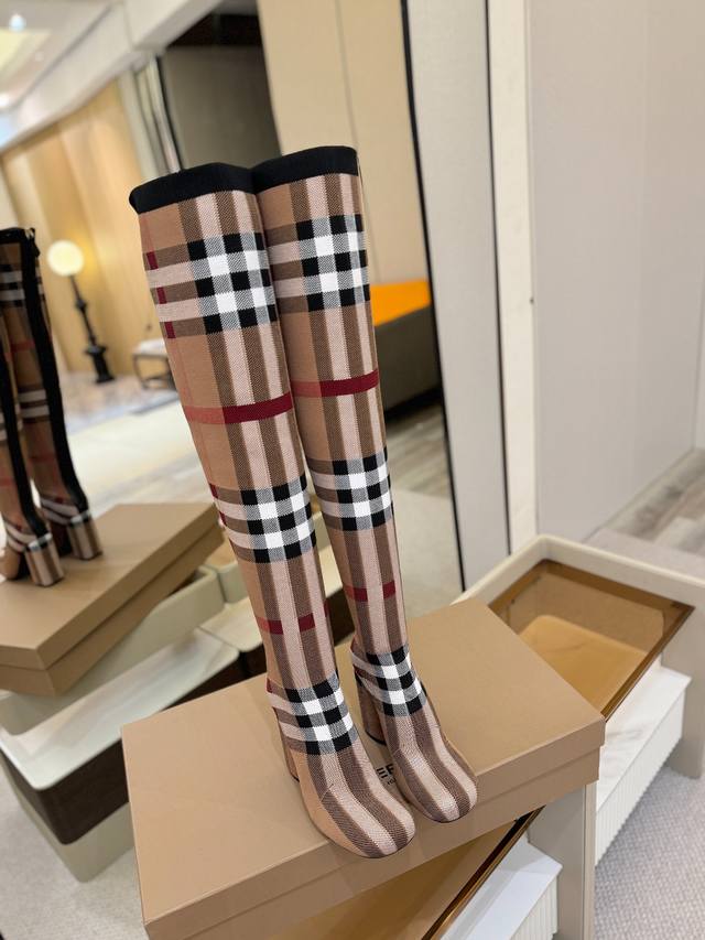 Price: DDD Exclusive Launch of Round Toe Chunky Heel Check Stretch Knit Sock Boots DDD Burberry, a British luxury brand, classic beige, 1:1 replica of the original, fitted stretch knit knee-high boots with a round toe and chunky heel, decorated with the brand's signature check pattern. DDD Upper: 92% polyester, 8% elastane, sheepskin lining, Italian genuine leather outsole!!! DDD Material: Original custom-made yarn DDD Outsole: Original genuine leather outsole DDD Heel height: . DDD Size: - ..Custom made DDD Boot height: DDD Boot opening circumference: DDD