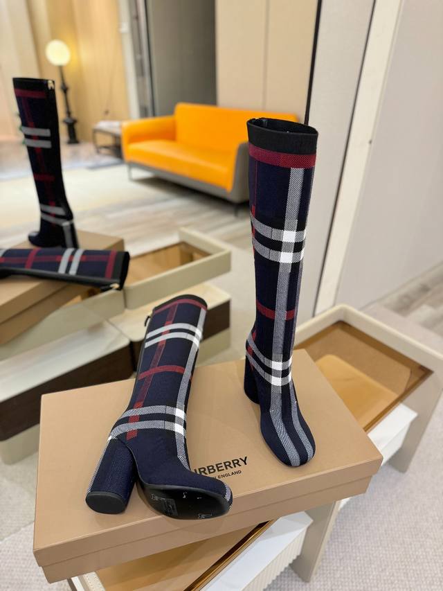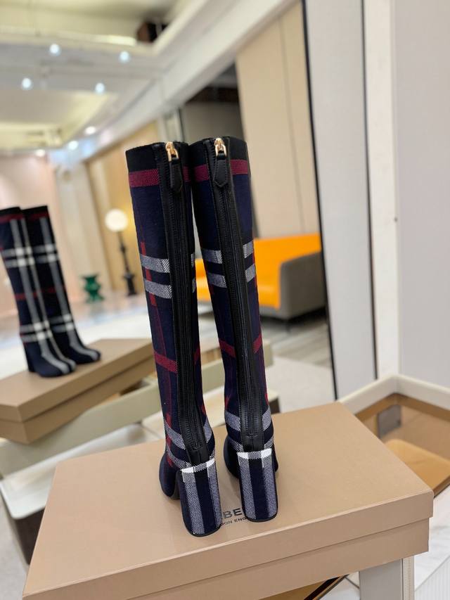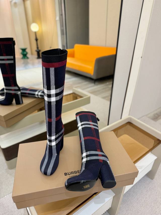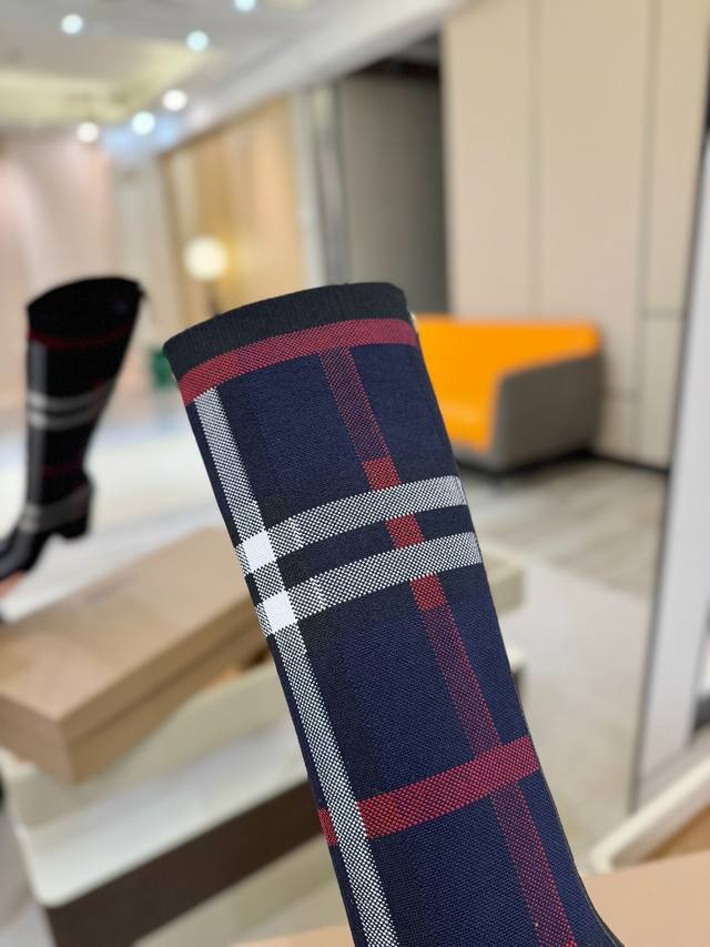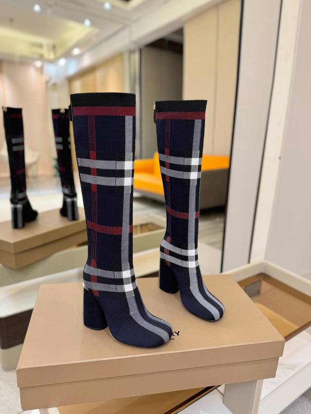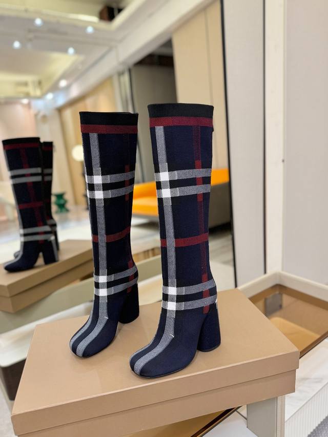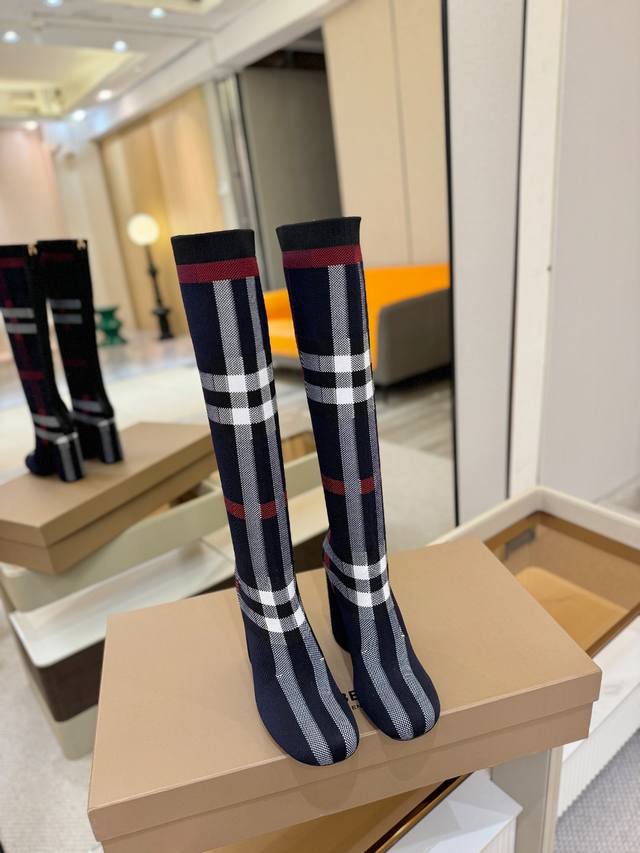 Price p: DDD Exclusive Launch of Round Toe Chunky Heel Check Stretch Knit Sock Boots DDD Burberry, a British luxury brand, classic beige, 1:1 replica of the original, fitted stretch knit knee-high boots with a round toe and chunky heel, decorated with the brand's signature check pattern. DDD Upper: 92% polyester, 8% elastane, sheepskin lining, Italian genuine leather outsole!!! DDD Material: Original custom-made yarn DDD Outsole: Original genuine leather outsole DDD Heel height: . DDD Size: - ..Custom made DDD Boot height: DDD Boot opening circumference: DDD