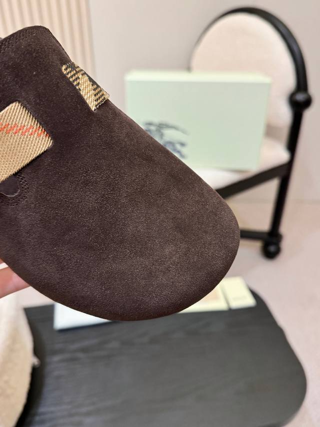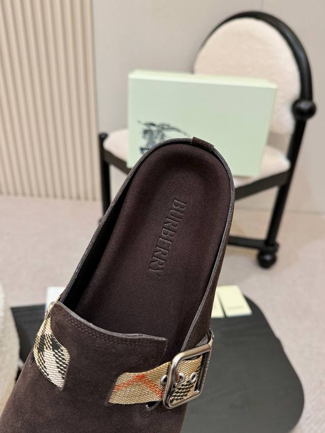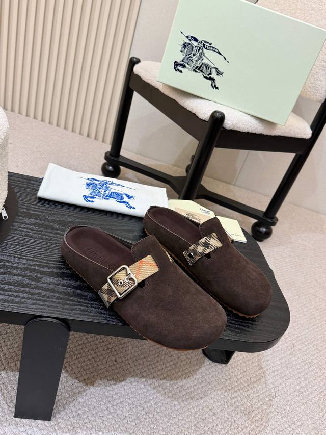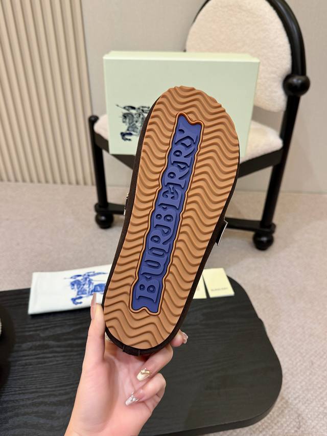Smooth finish men's and women's versions, 310 RMB! Burberry's 2025 hottest Birkenstock slippers are here! Crafted from soft suede leather and made in Italian workshops. Features an embossed check pattern and a textured sole adorned with the iconic brand logo. Includes an adjustable B-ring strap decorated with the signature sand-colored Burberry check pattern. Material: Grain leather; Lining: Silk denim; Outsole: TPU; Colors: Black, brown, pink, apricot, coffee (5 colors available); Sizes: Men's and women's 35-45; 35 and 45 custom sizes available.